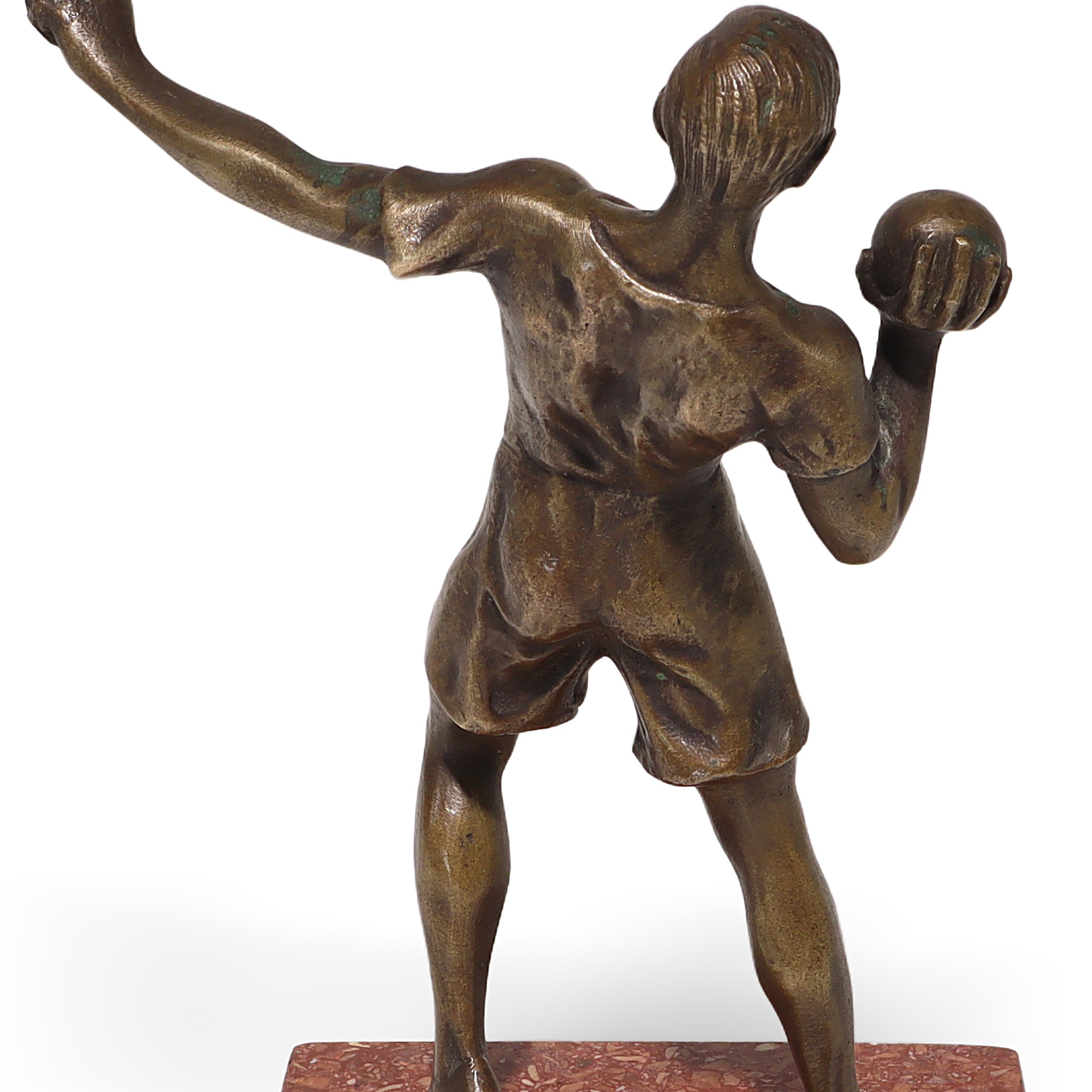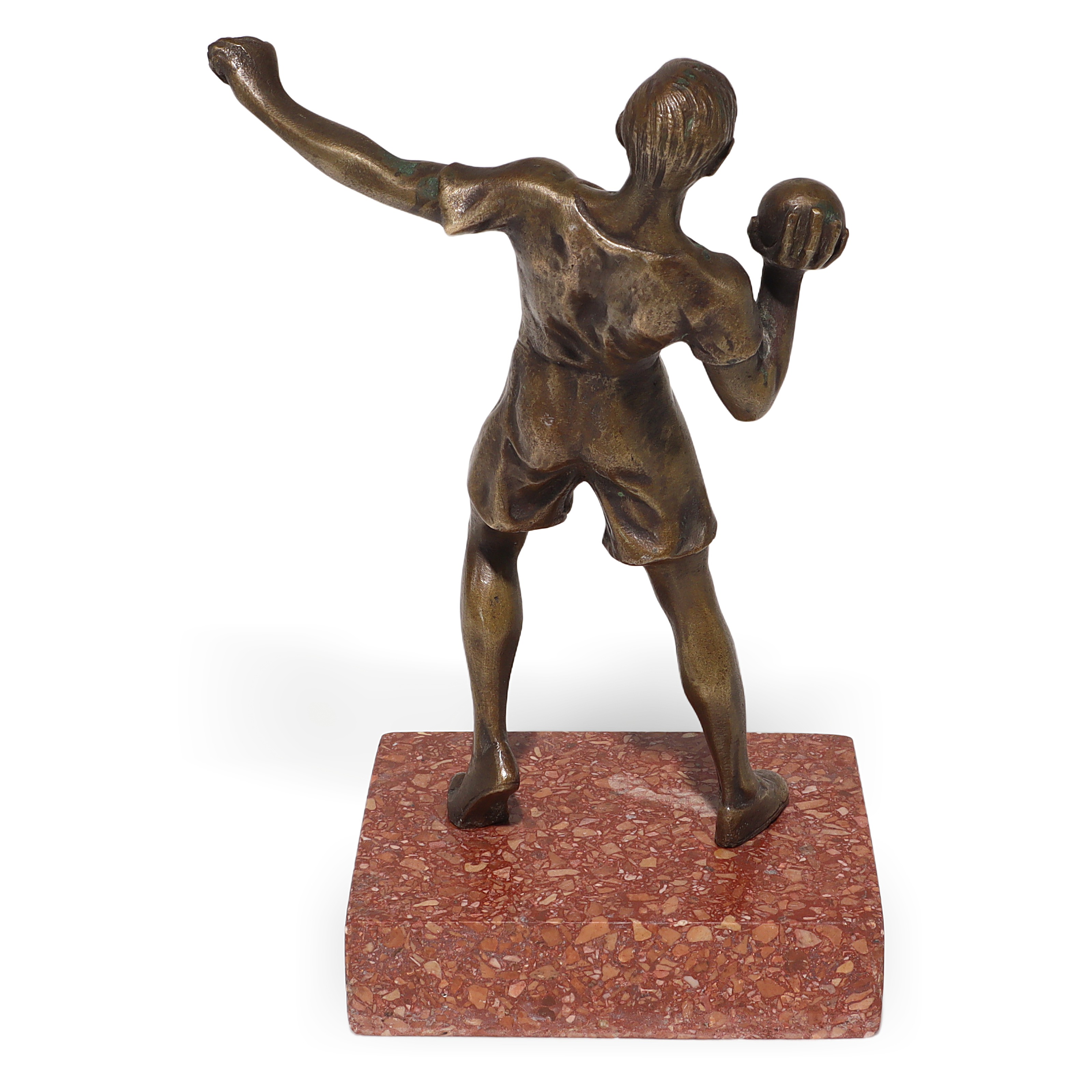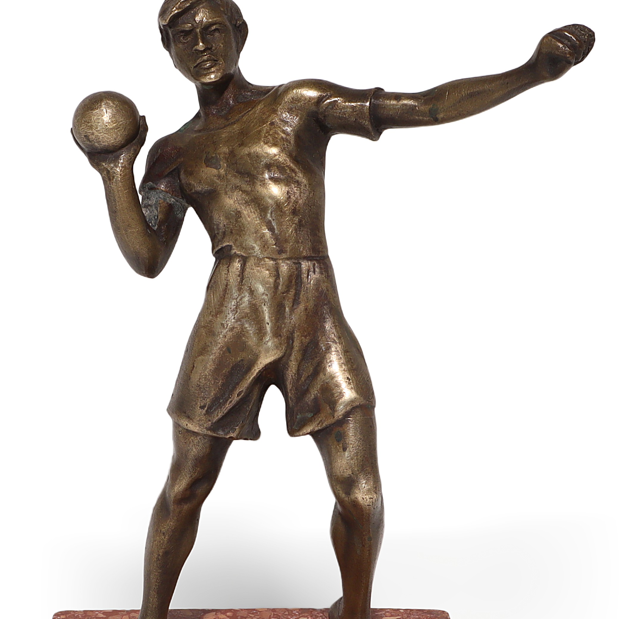 This is a vintage bronze sculpture of a shot putter, crafted in an Art Deco style. The figure shows an athlete…