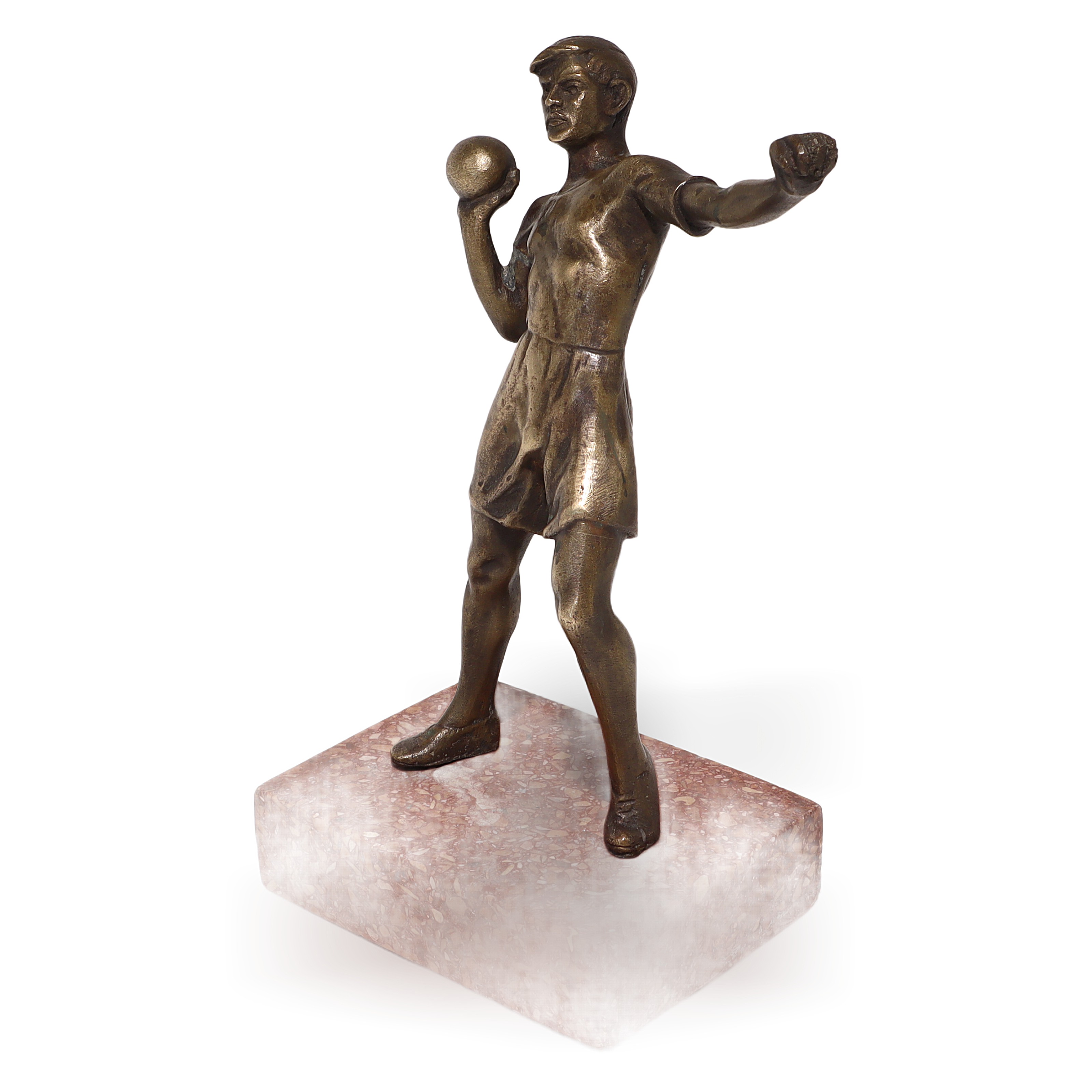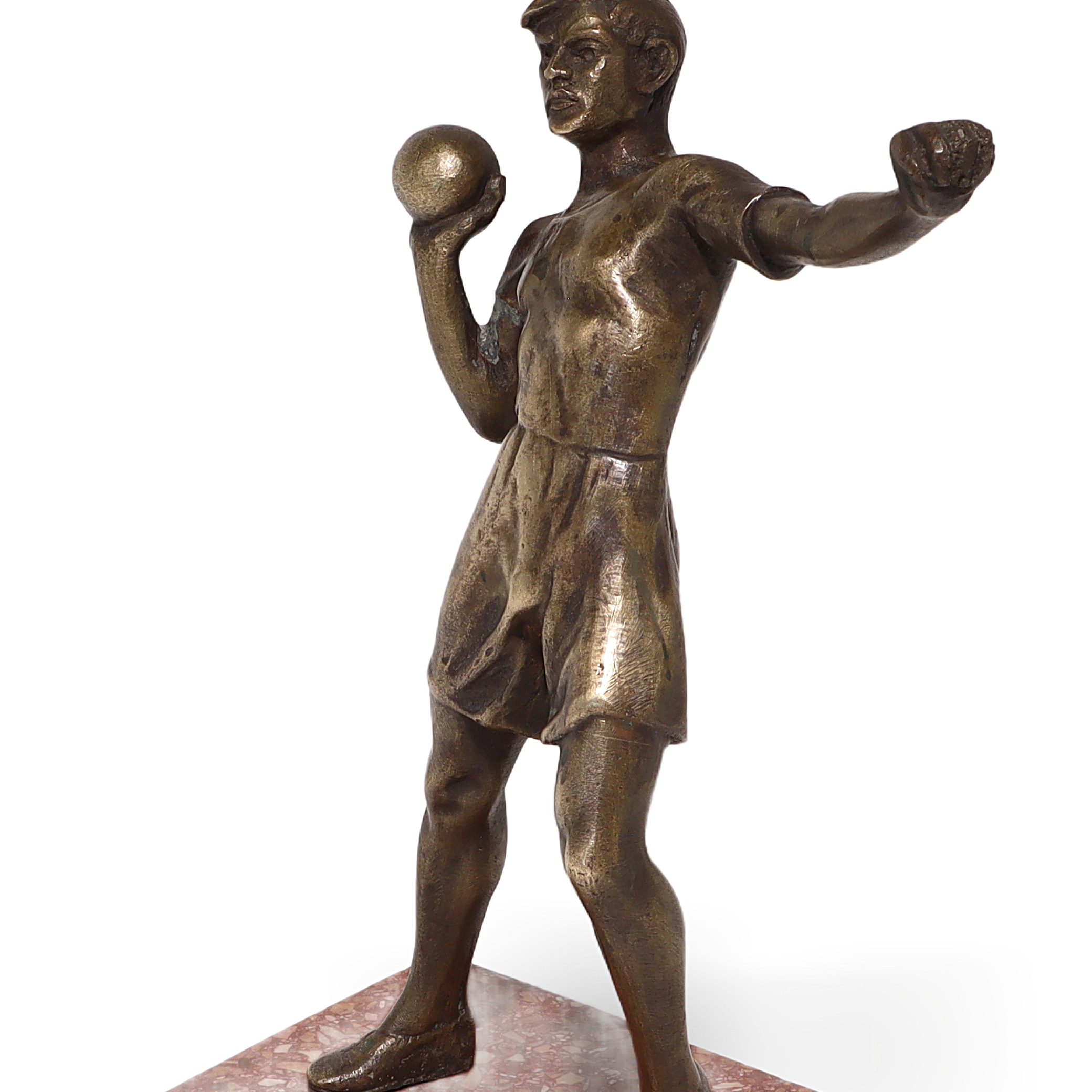 This is a vintage bronze sculpture of a shot putter, crafted in an Art Deco style. The figure shows an athlete caught mid-action, getting ready to launch the heavy shot put from his shoulder, all mounted on a striking marble plinth. Standing about 7 inches tall, this sturdy, classic piece was made around 1970, making it over 50 years old. The bronze has developed a rich patina over time, which gives it that authentic vintage charm collectors look for. Despite its age, the sculpture is in near mint condition, which is a real find since many pieces from this era can show signs of wear or damage. With its heavy marble base, this is more than just lightweight décor—it feels substantial and was likely designed to serve as a sports trophy or a showcase piece for someone who loved track and field events.
