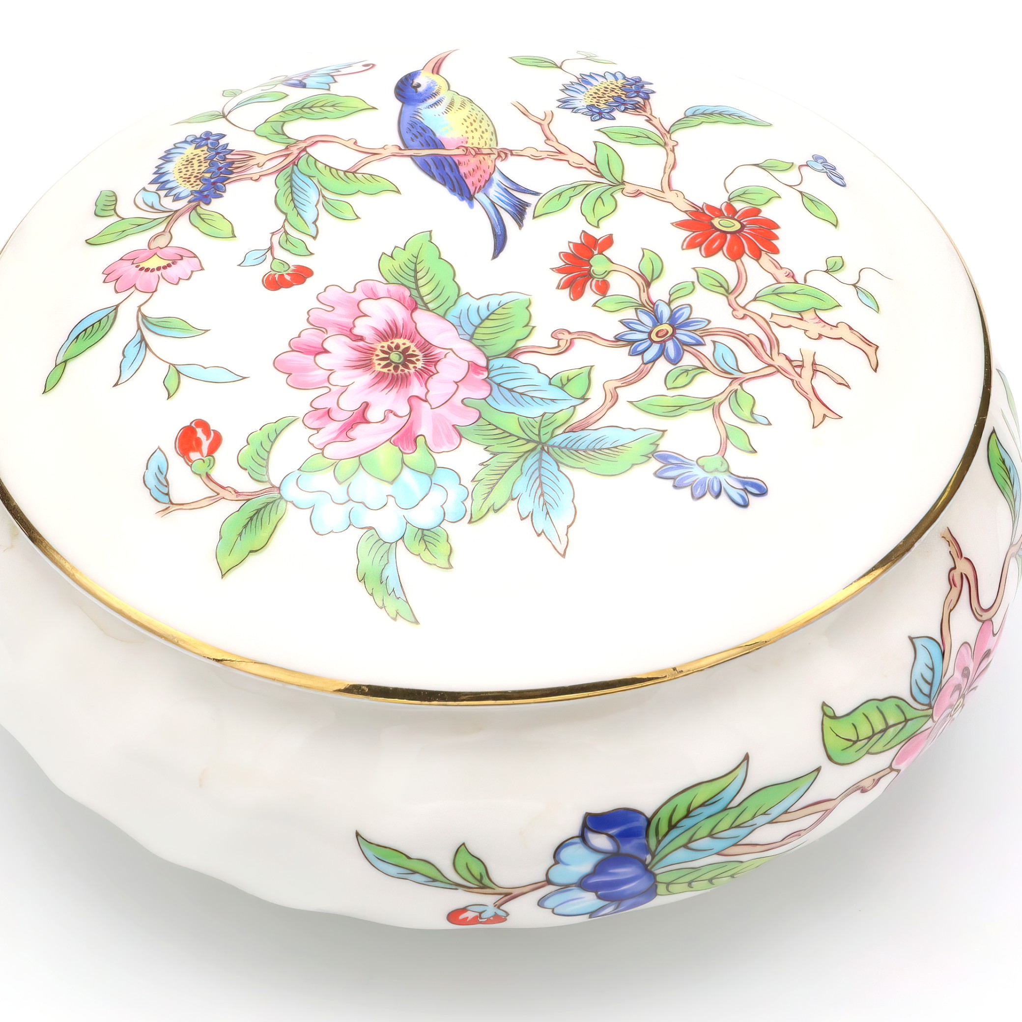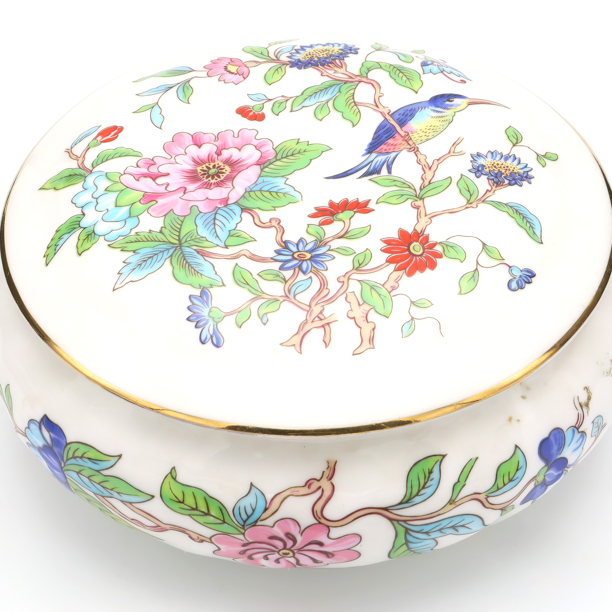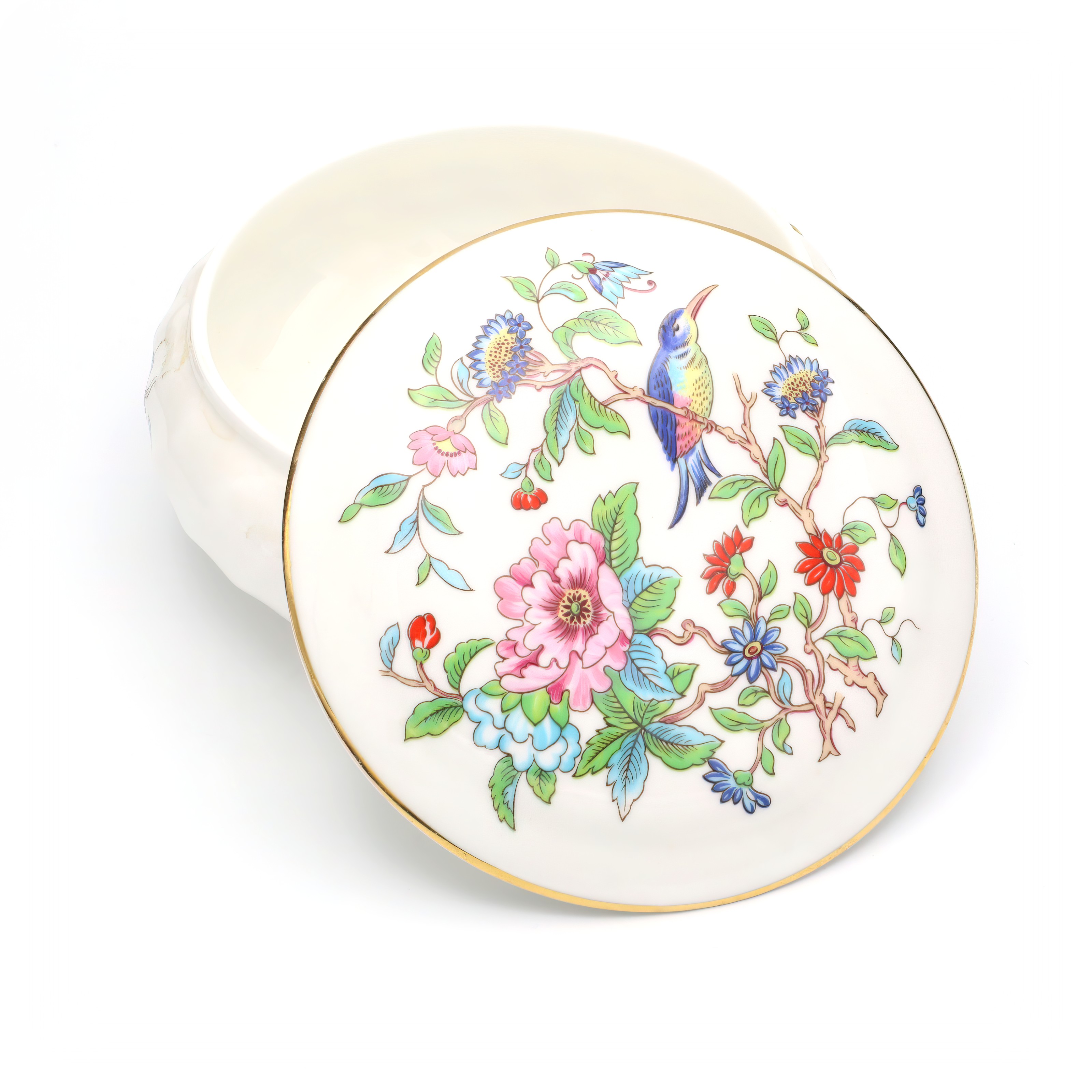 This beautifully preserved Pembroke trinket box, crafted around 1960, is truly a testament to the artistry of its time. With its mint condition—something you don’t often see with items this old—it looks as though it has been barely touched since it was made. The box stands at about 2 inches tall and 4 inches in diameter, making it a perfectly sized keepsake for any dresser or display case. The ornate detailing on the lid, adorned with floral motifs and vibrant colors, adds a touch of elegance and sophistication. The gold trim running along the edges gives it an extra pop of luxury, making it not only a practical item for storing small treasures but also a striking piece of decoration.