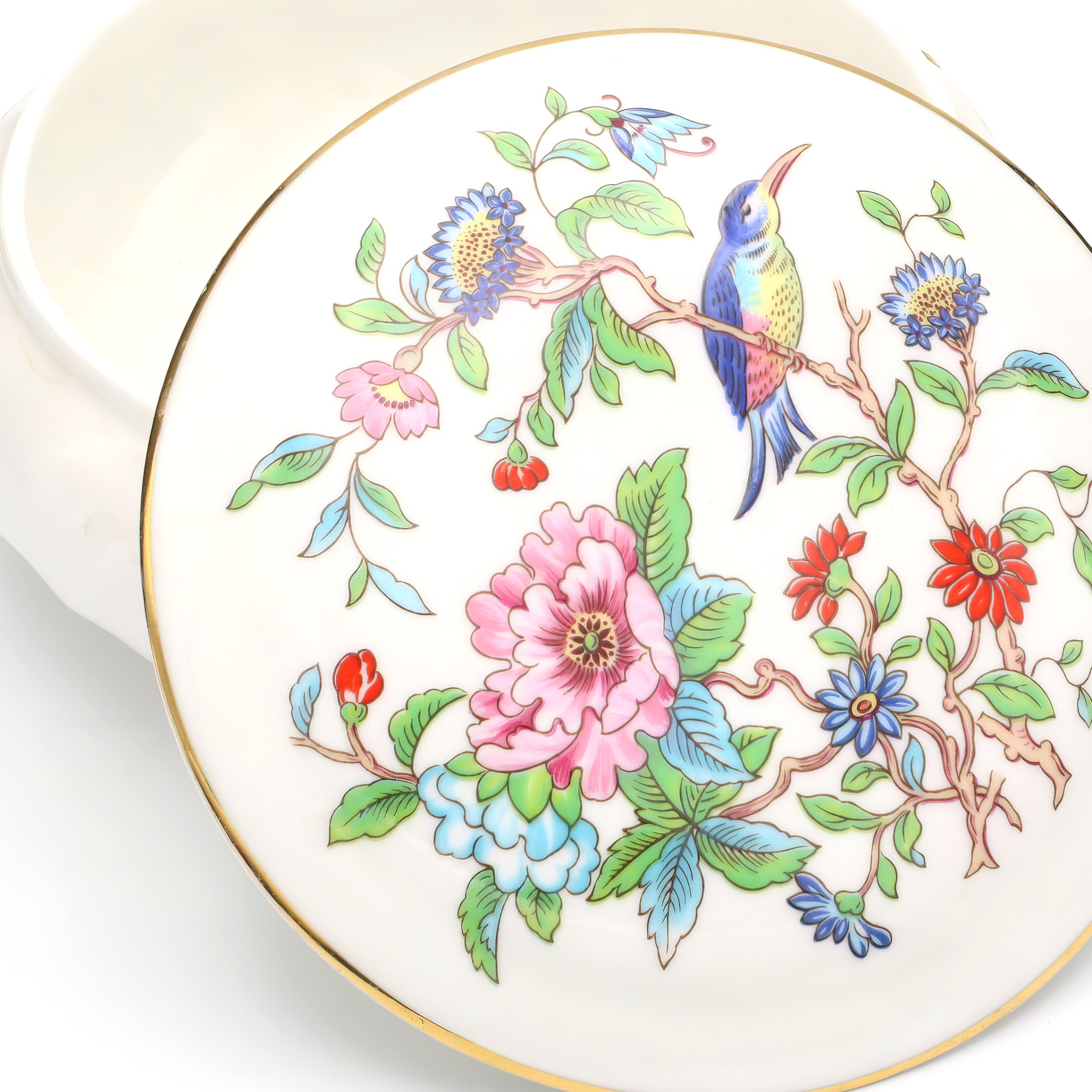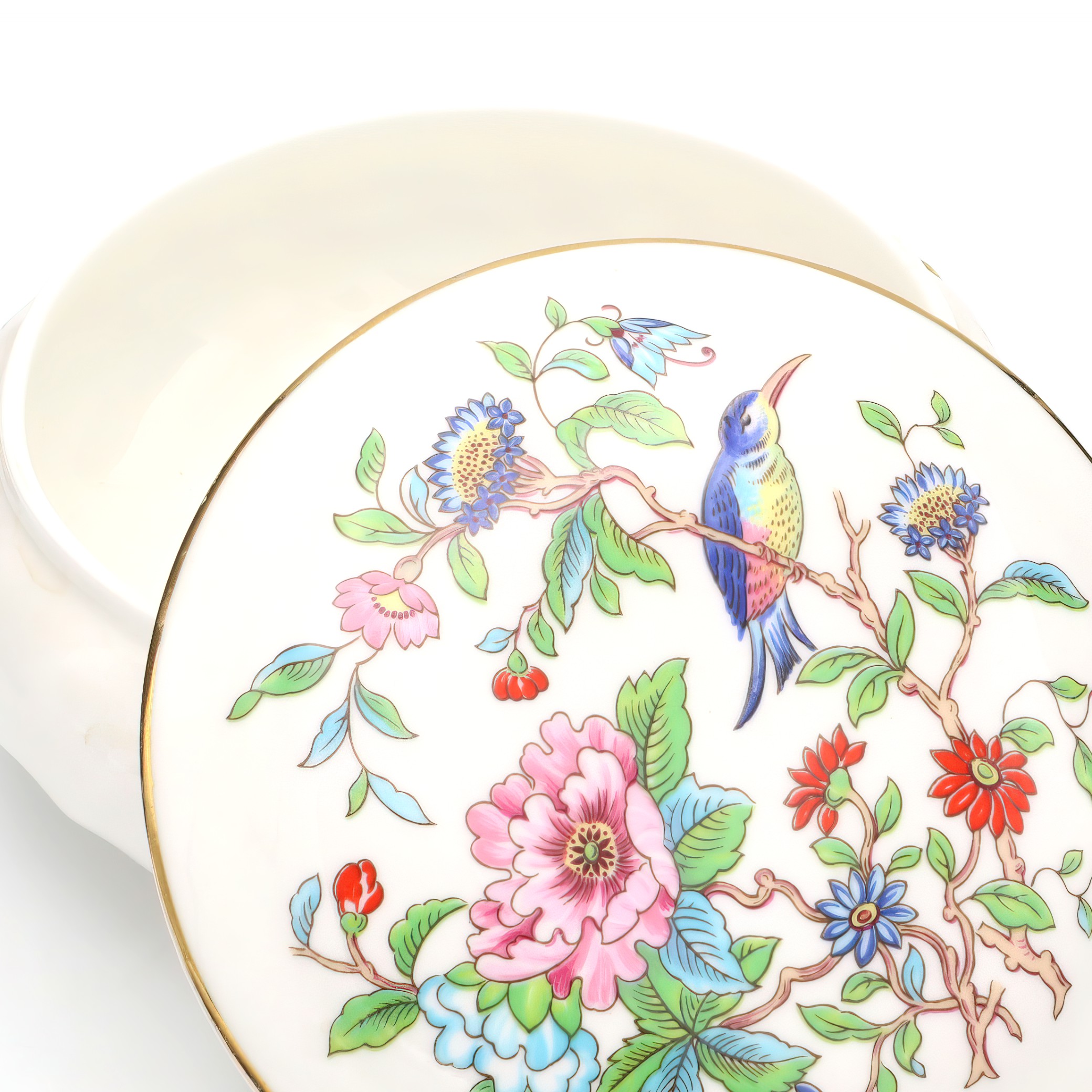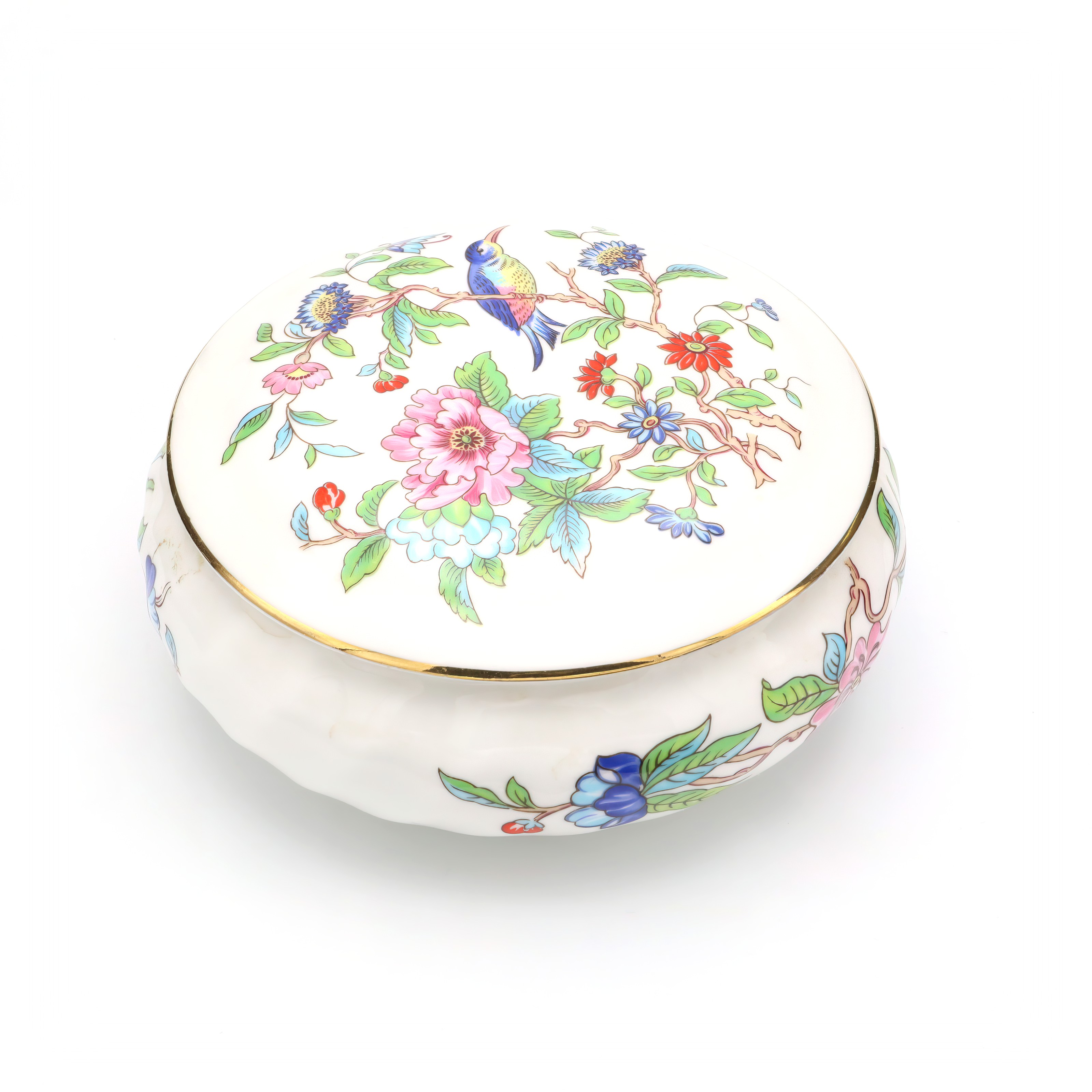 This beautifully preserved Pembroke trinket box, crafted around 1960, is truly a testament to the artistry of its time. With its mint condition—something you don’t often see with items this old—it looks as though it has been barely touched since it was made. The box stands at about 2 inches tall and 4 inches in diameter, making it a perfectly sized keepsake for any dresser or display case. The ornate detailing on the lid, adorned with floral motifs and vibrant colors, adds a touch of elegance and sophistication. The gold trim running along the edges gives it an extra pop of luxury, making it not only a practical item for storing small treasures but also a striking piece of decoration.