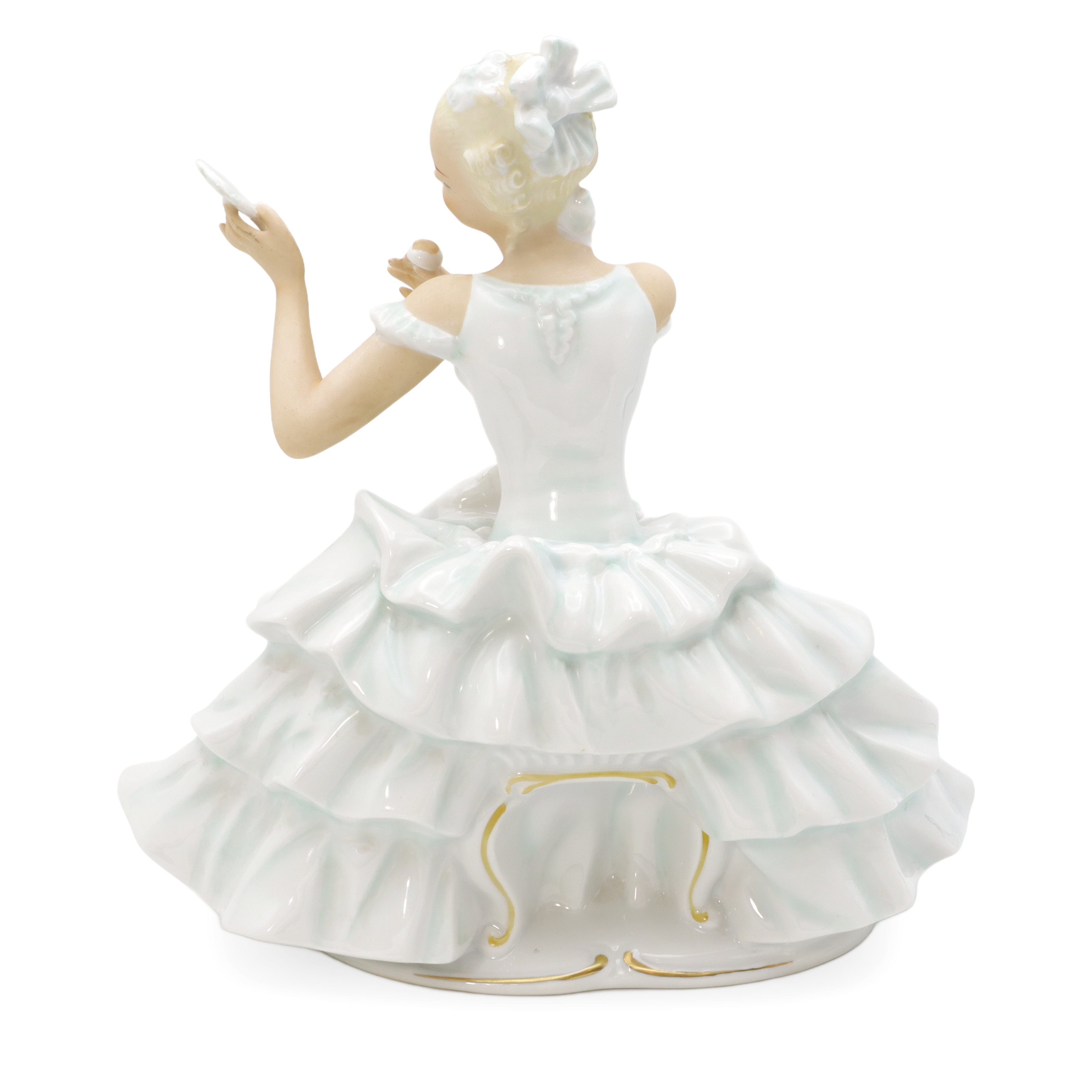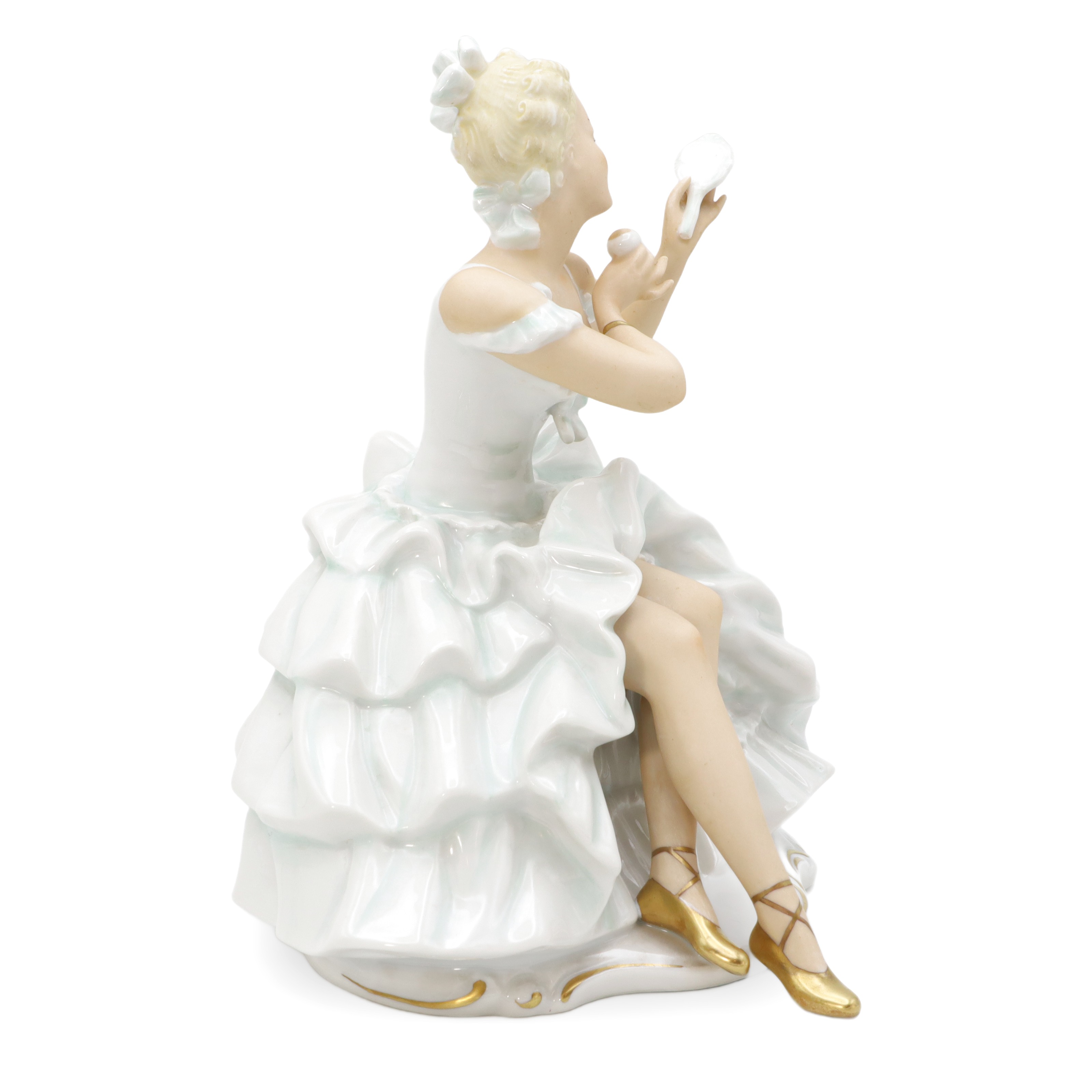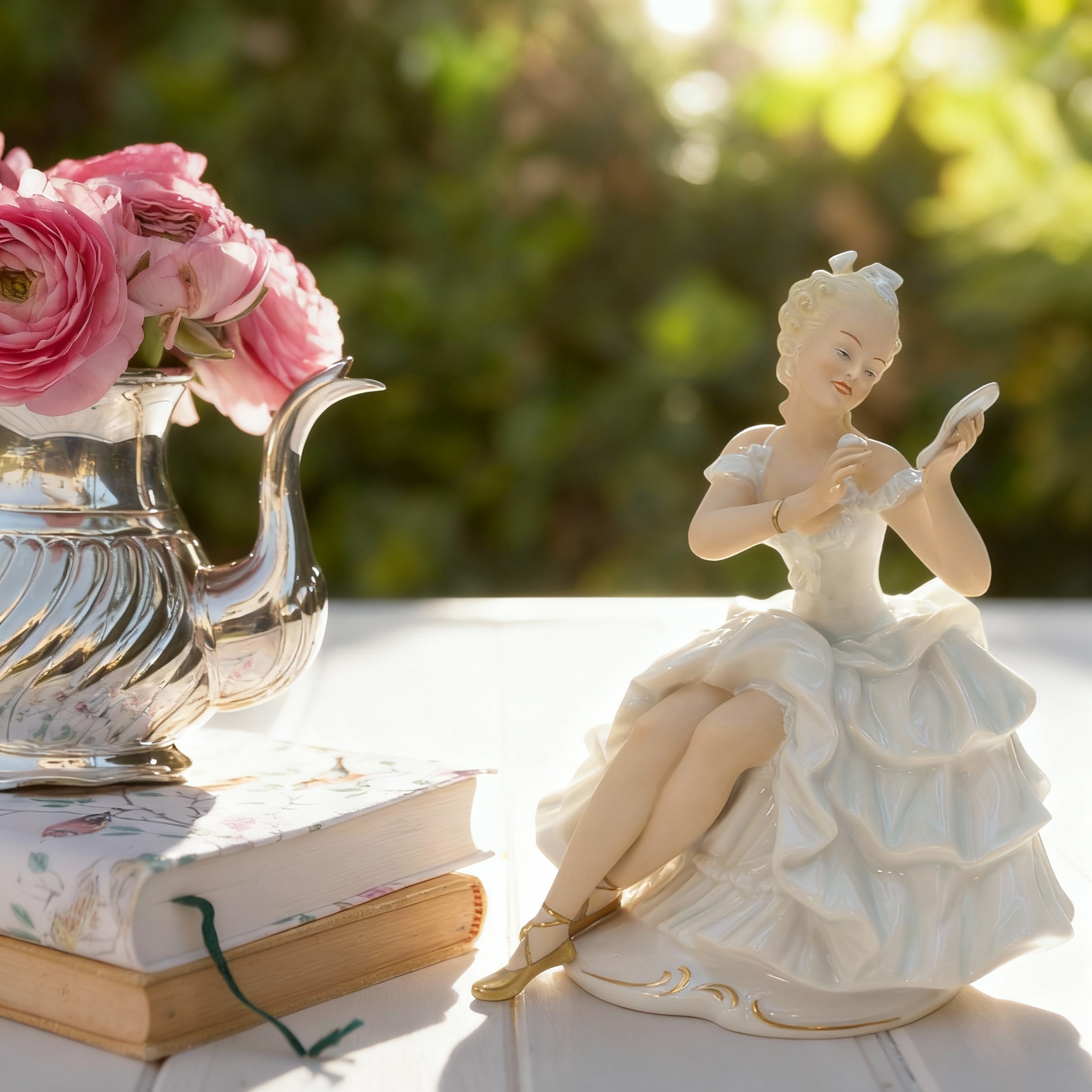 This lovely piece is a Wallendorf Ballerina Porcelain Figurine, produced around the year 1970. Standing about 8 inches tall, 7 inches wide, and 6 inches deep, it features an elegant ballerina sitting gracefully, caught in a moment of refinement as she admires herself in a hand mirror. The delicate ruffles of her dress and the gentle details in her pose show off the level of craftsmanship that’s made these figurines so admired among collectors. The soft colors, light gold accents, and her gentle expression all add to the timeless charm. Even decades after it was made, this figurine is still in near mint condition, making it even more special for anyone who comes across it today. For anyone who enjoys a touch of vintage decor, this is a truly eye-catching item that brings elegance into any space.