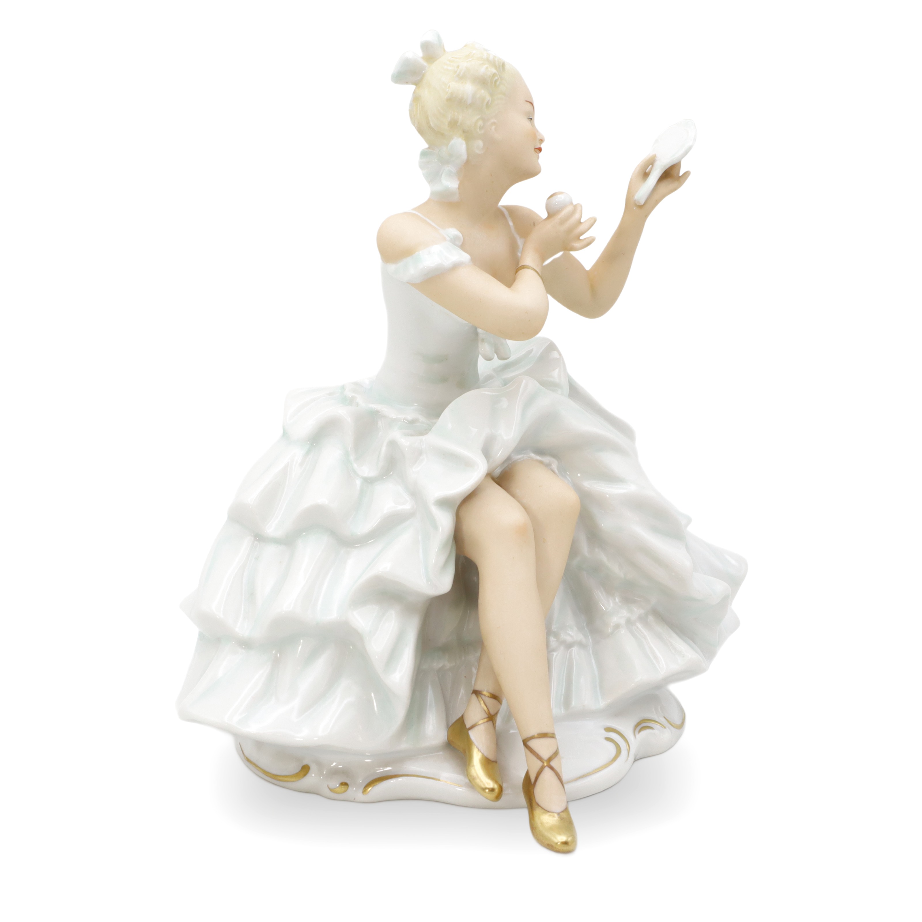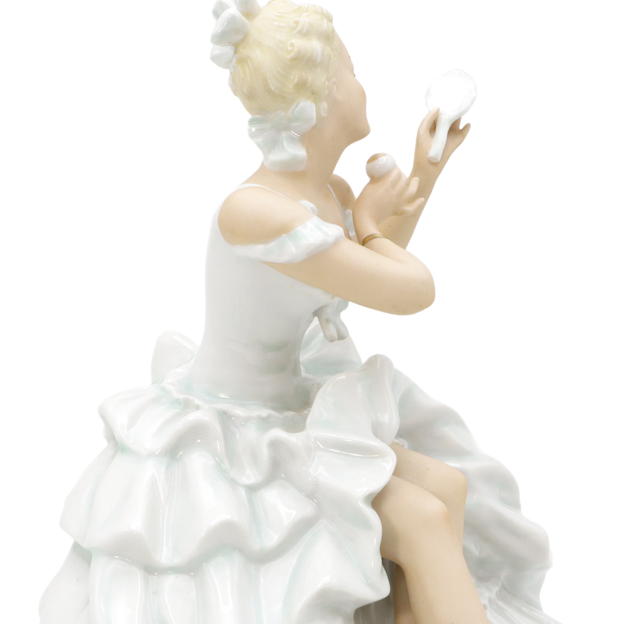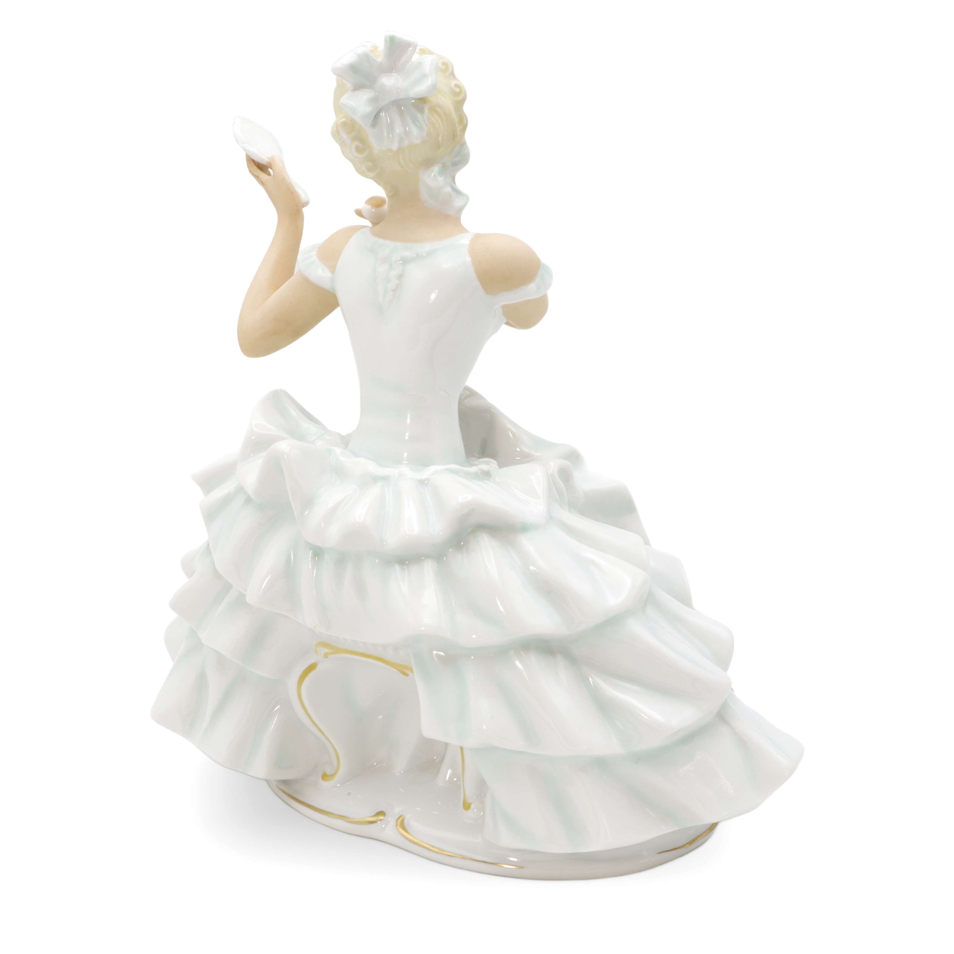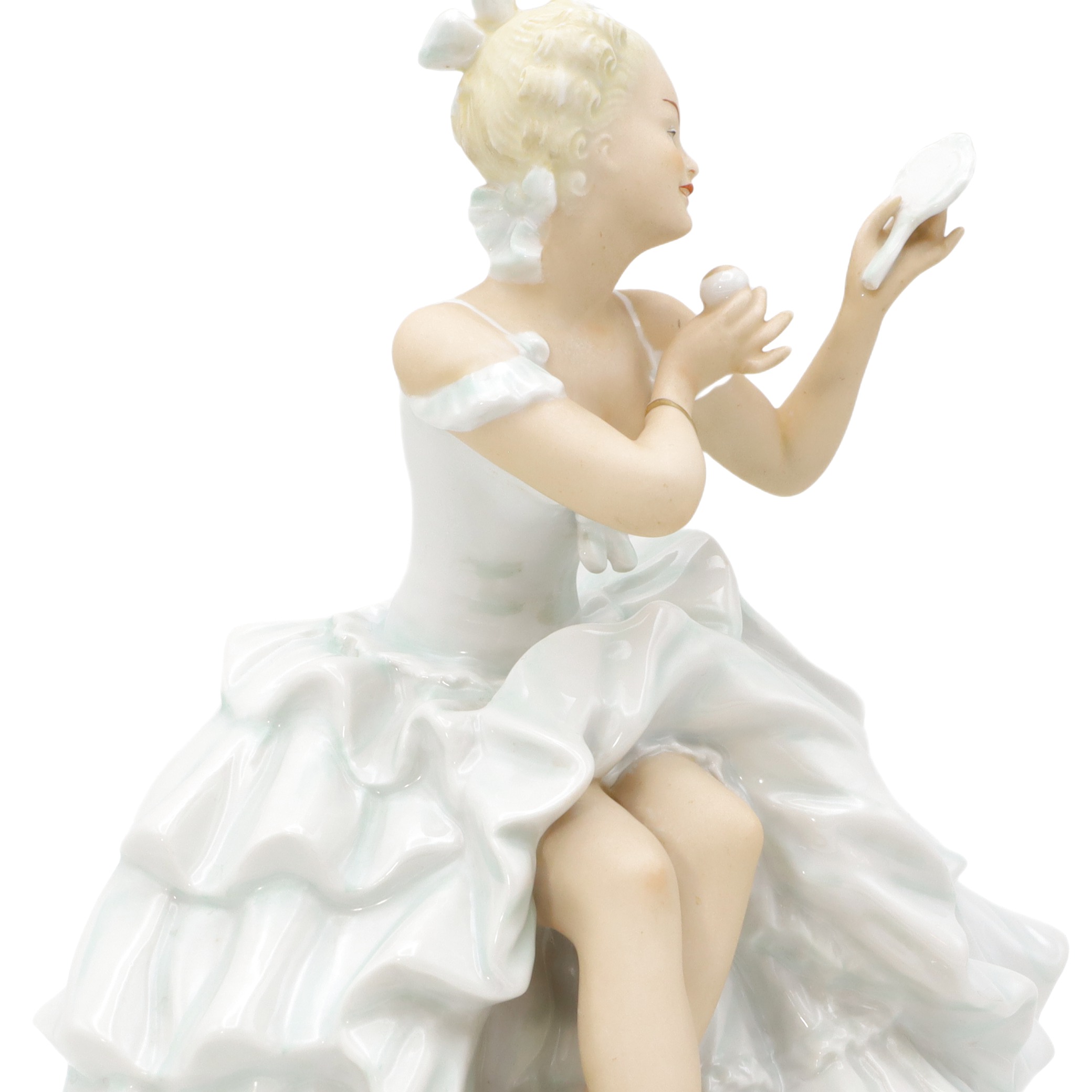 This lovely piece is a Wallendorf Ballerina Porcelain Figurine, produced around the year 1970. Standing about 8 inches tall, 7 inches wide, and 6 inches deep, it features an elegant ballerina sitting gracefully, caught in a moment of refinement as she admires herself in a hand mirror. The delicate ruffles of her dress and the gentle details in her pose show off the level of craftsmanship that’s made these figurines so admired among collectors. The soft colors, light gold accents, and her gentle expression all add to the timeless charm. Even decades after it was made, this figurine is still in near mint condition, making it even more special for anyone who comes across it today. For anyone who enjoys a touch of vintage decor, this is a truly eye-catching item that brings elegance into any space.