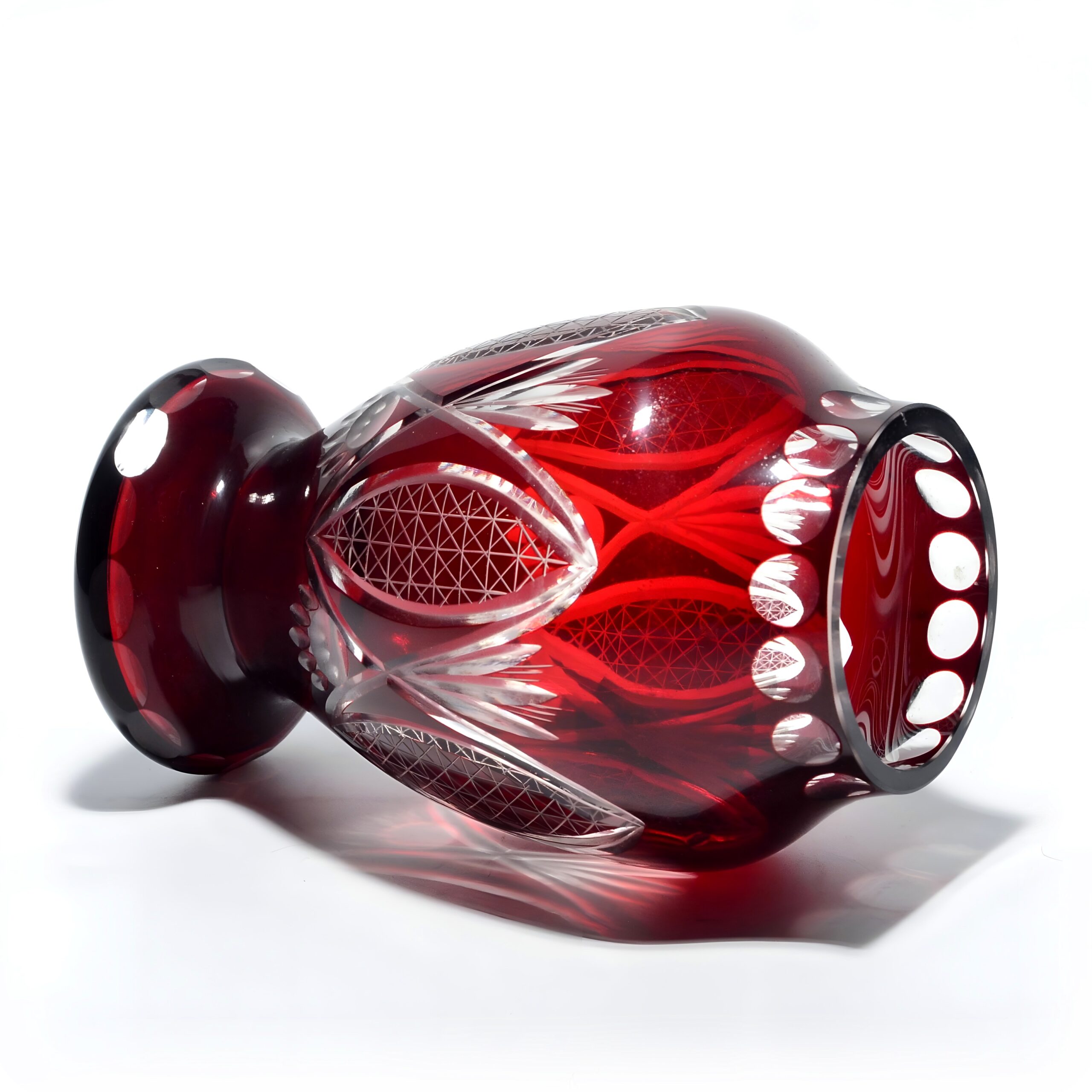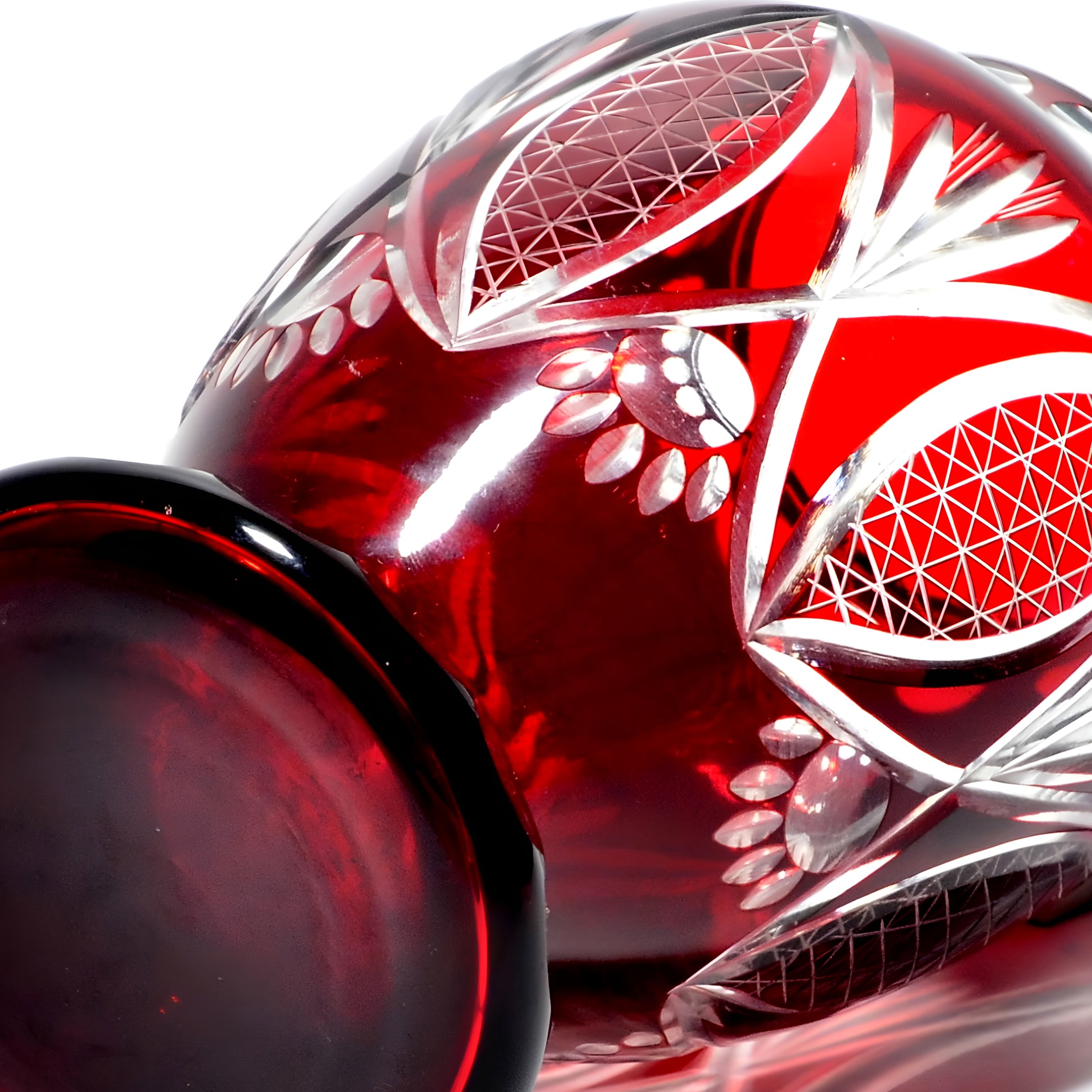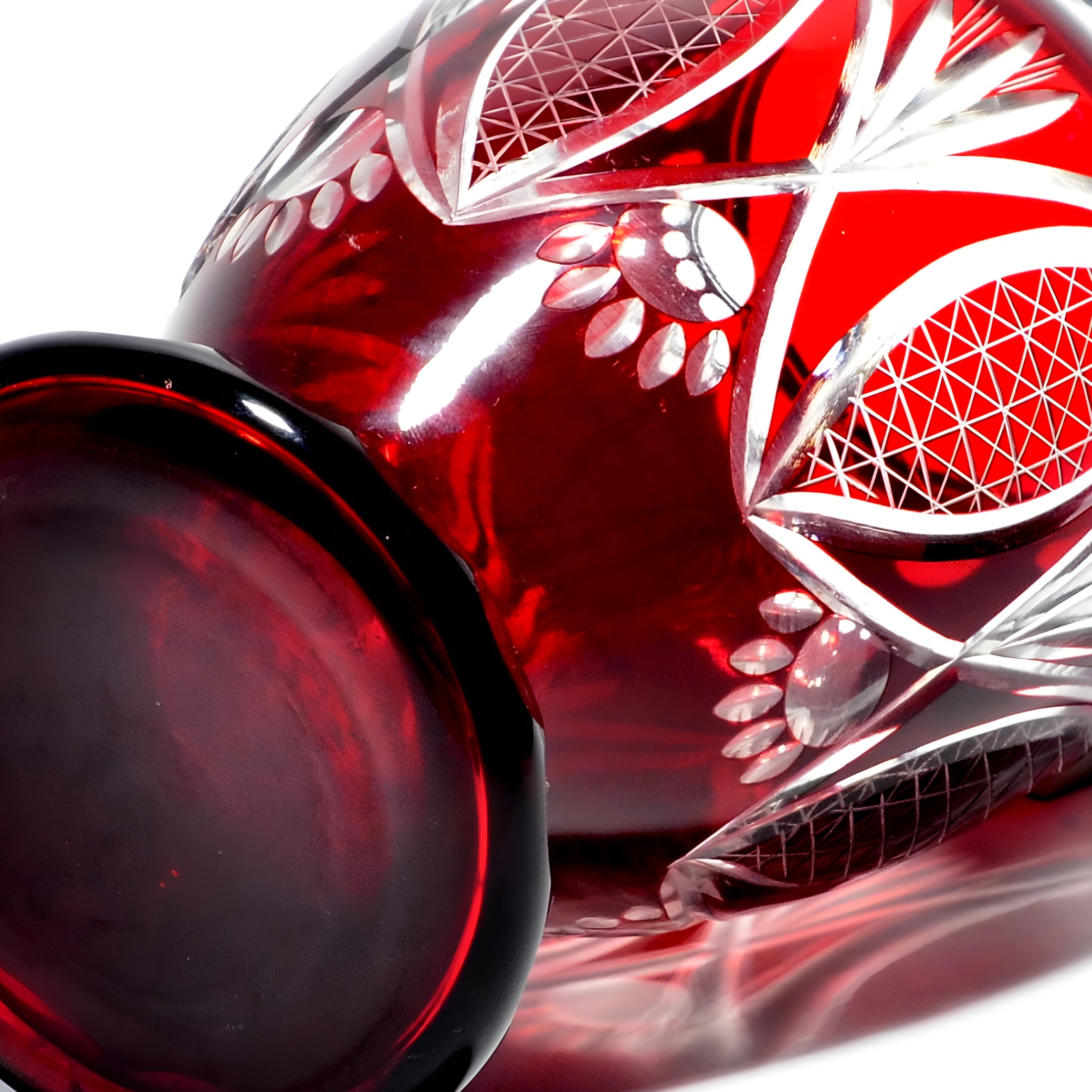This is a stunning example of a wide red crystal vase, crafted around 1970, showcasing the bold geometric patterns typical of cut glass artistry from that era. Standing at 8 inches tall,…