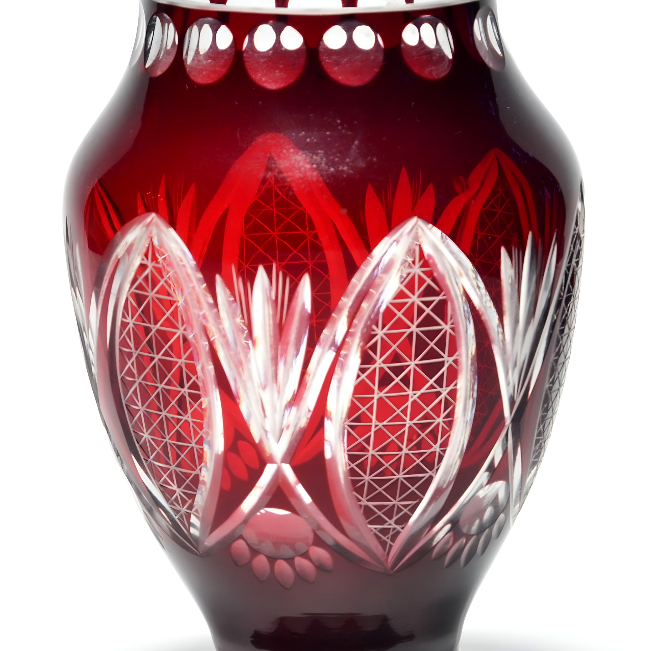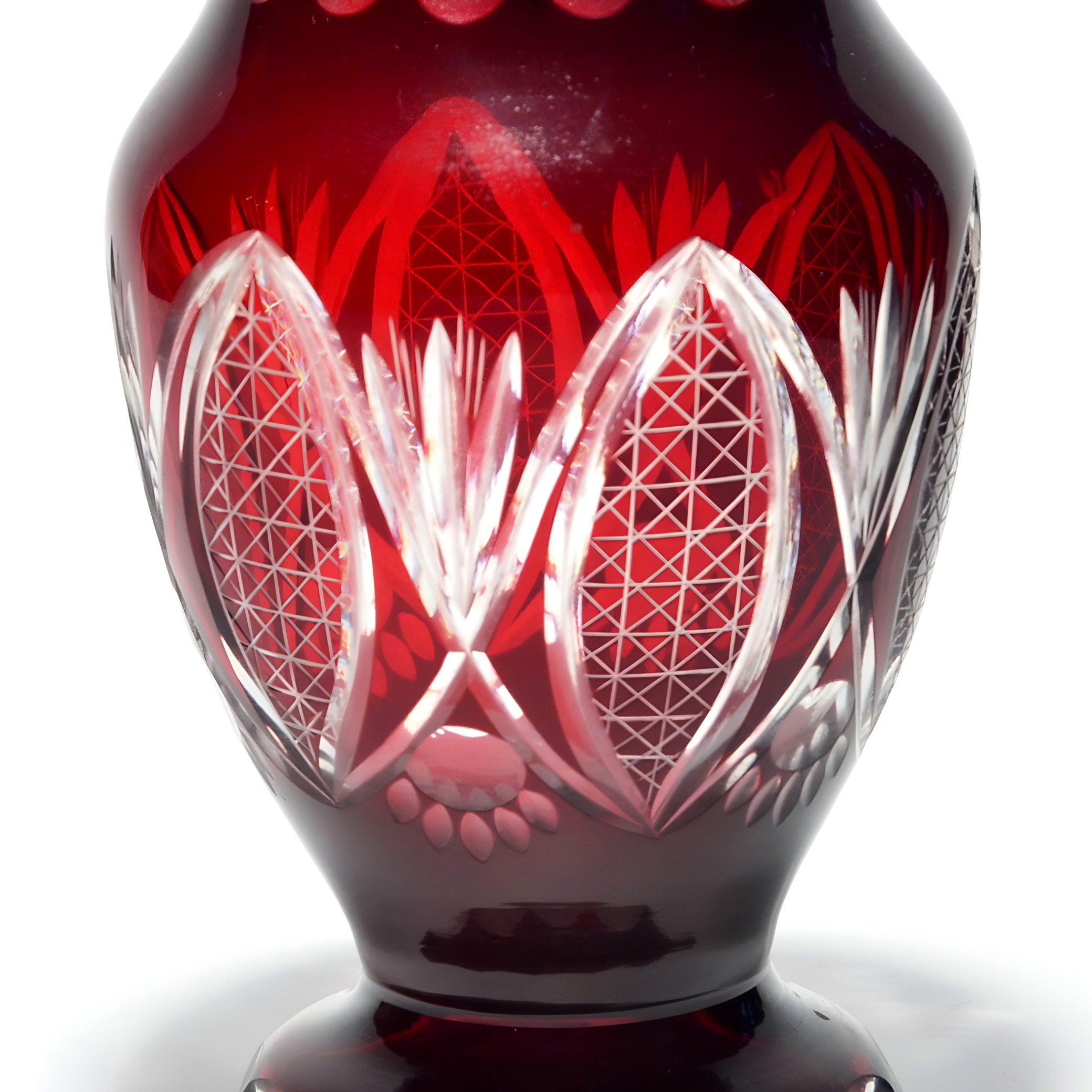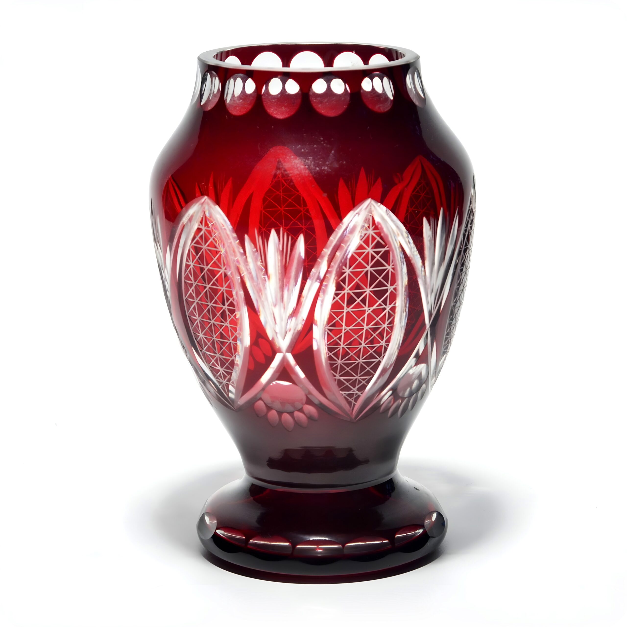 This is a stunning example of a wide red crystal vase, crafted around 1970, showcasing the bold geometric patterns typical of cut glass artistry from that era. Standing at 8 inches tall,…
