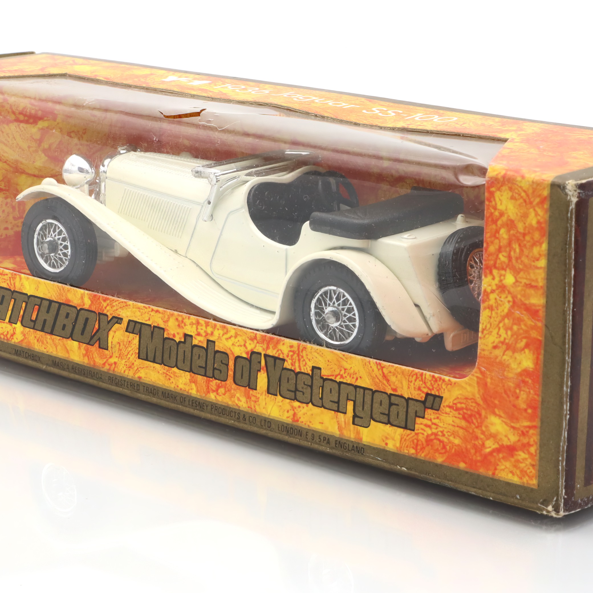 What you’re looking at is a splendid piece of automotive history captured in diecast form: the Y-1 1936 Jaguar SS100, a model from the “Models of Yesteryear” line by Lesney Matchbox. This particular model is in mint condition, which makes it quite a find for collectors. Mint condition means it looks just as crisp and perfect as the day it was made, with no scratches or dings. The model replicates the classic 1936 Jaguar SS100 sports car, known for its elegant design and powerful performance. It’s a small-scale version, but it holds big significance. For car enthusiasts, holding this miniature is like holding the spirit of a bygone era of automotive design and engineering.
