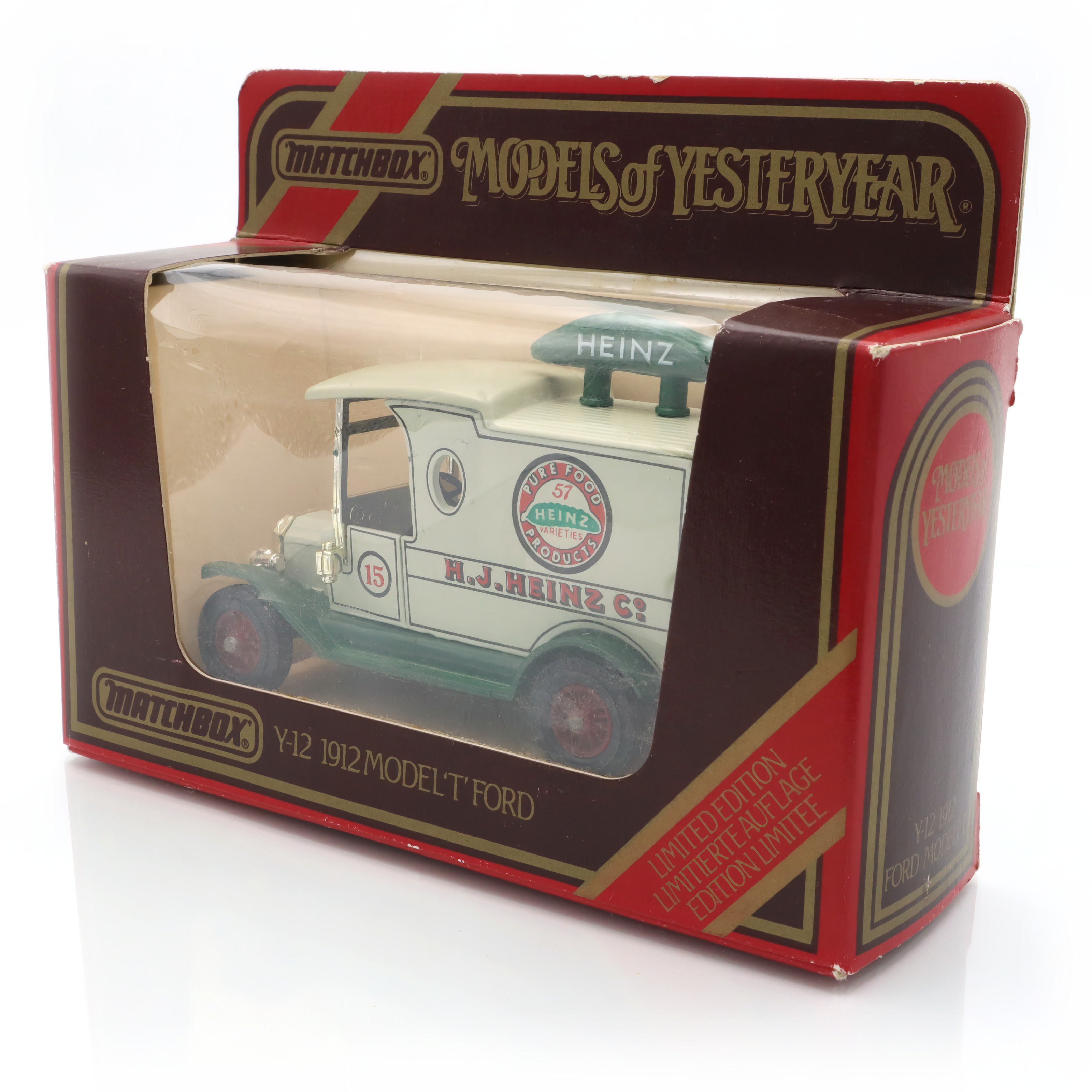 This right here is a charming vintage artifact, a Y-12 1912 Ford Model T Heinz diecast collectible. It’s an antique vehicle replica that captures the essence of early automotive history, meticulously crafted as a detailed miniature model. This classic toy car is a piece of retro automotive memorabilia, and in mint condition no less, which makes it even more special for collectors. While it doesn’t take up much space, it holds a world of nostalgic charm and history in its compact size. Designed to replicate the iconic Ford Model T, this model has a nostalgic appeal that transports you back in time, to an era where cars were a new and wondrous invention. The vehicle is painted with the emblem of Heinz, which adds a unique twist, as it represents a piece of marketing history as well, reflecting how brands used innovative means to advertise even in the early 1900s.