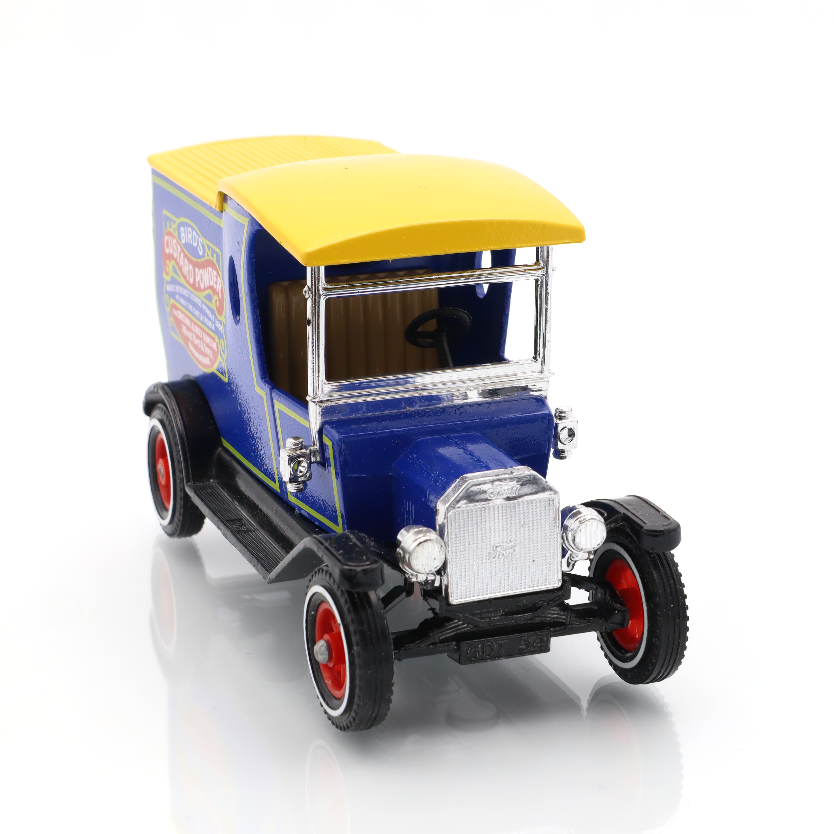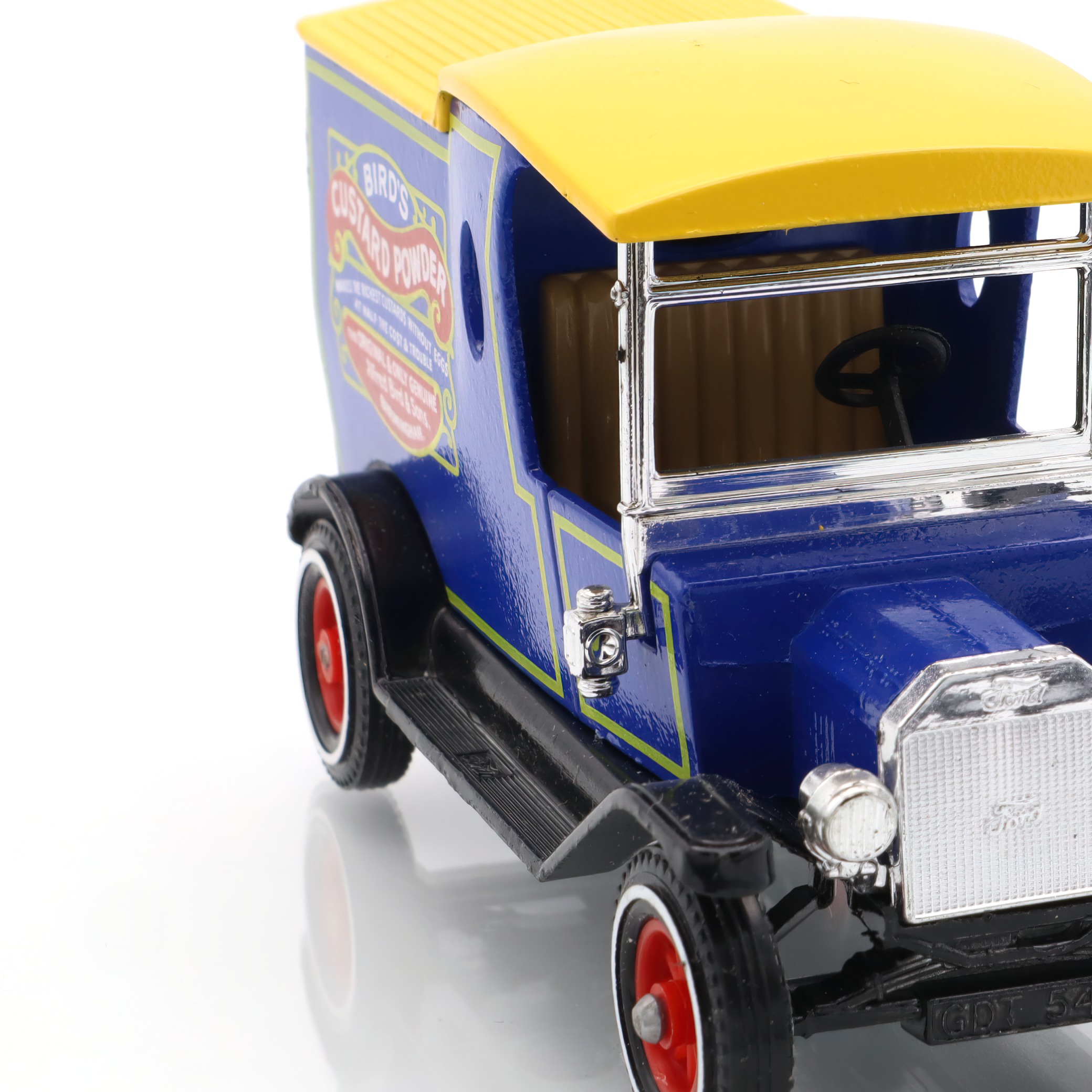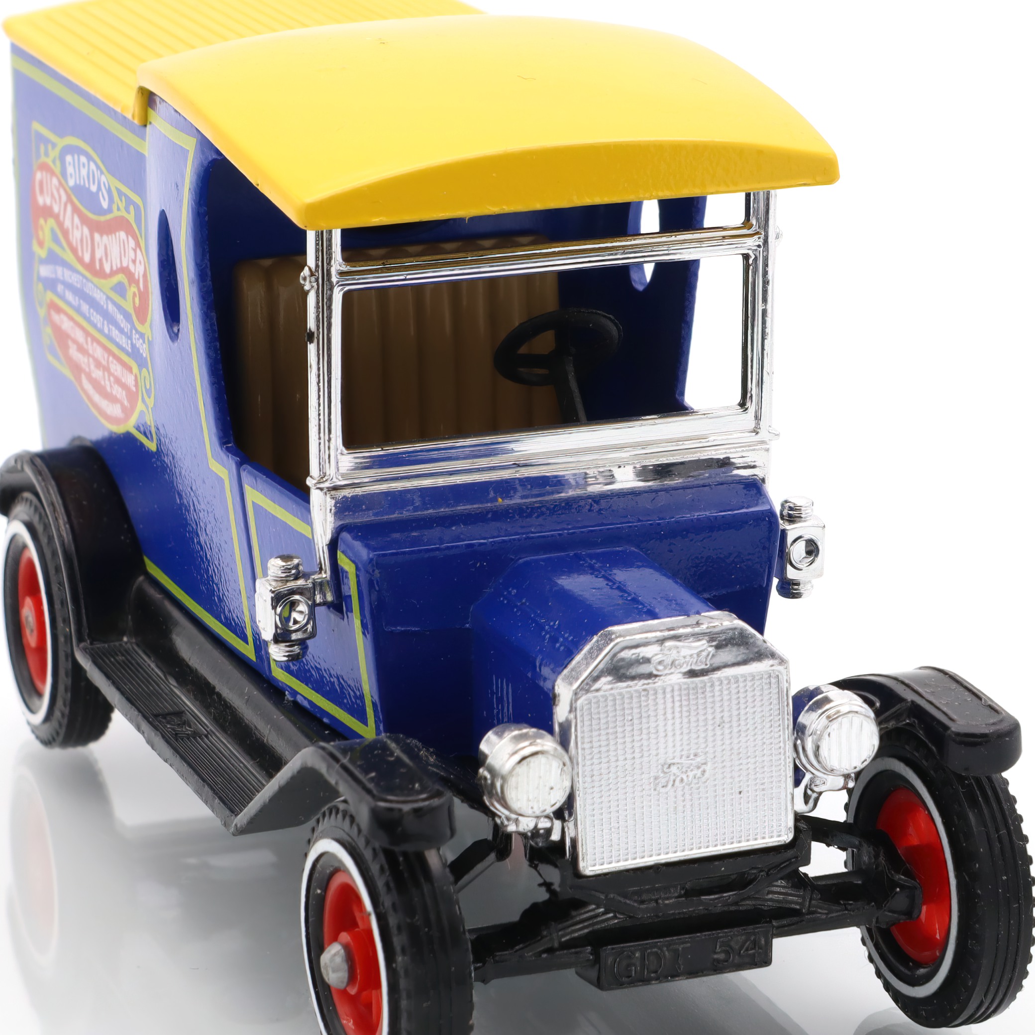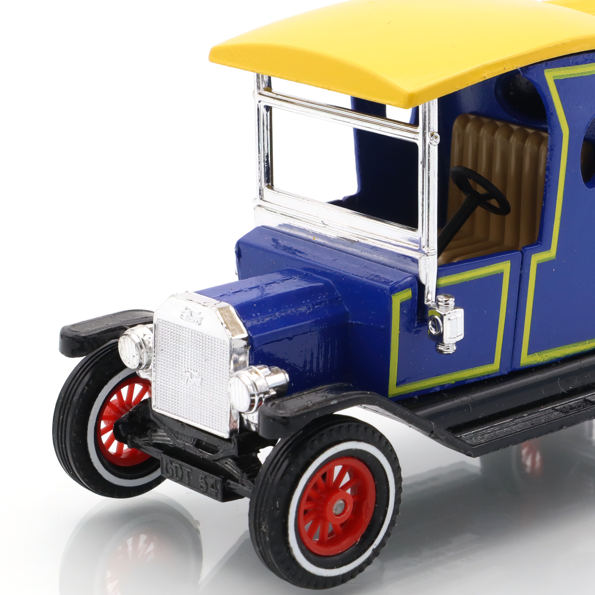 This is a Matchbox Models of Yesteryear diecast collectible of a 1912 Ford Model T. It’s a delightful little piece that captures the charm of a bygone era with its bright colors and intricate details. The model sports a vivid blue body with a yellow roof, adorned with vibrant advertising for Bird’s Custard Powder. It’s in mint condition, making it a real treasure for collectors and enthusiasts alike. Despite its small size, it brings the early 20th century to life, showcasing the unique style of vehicles from that time.