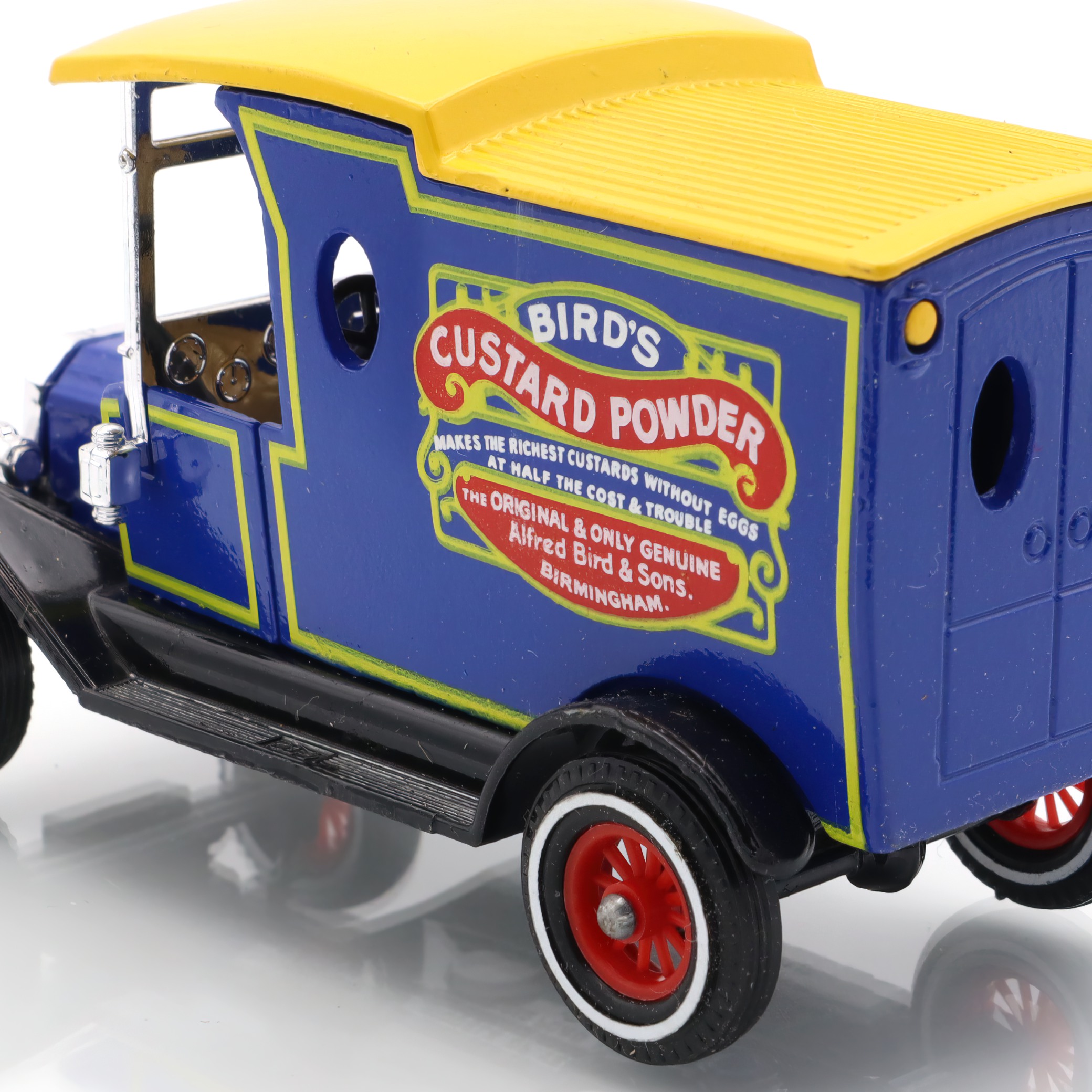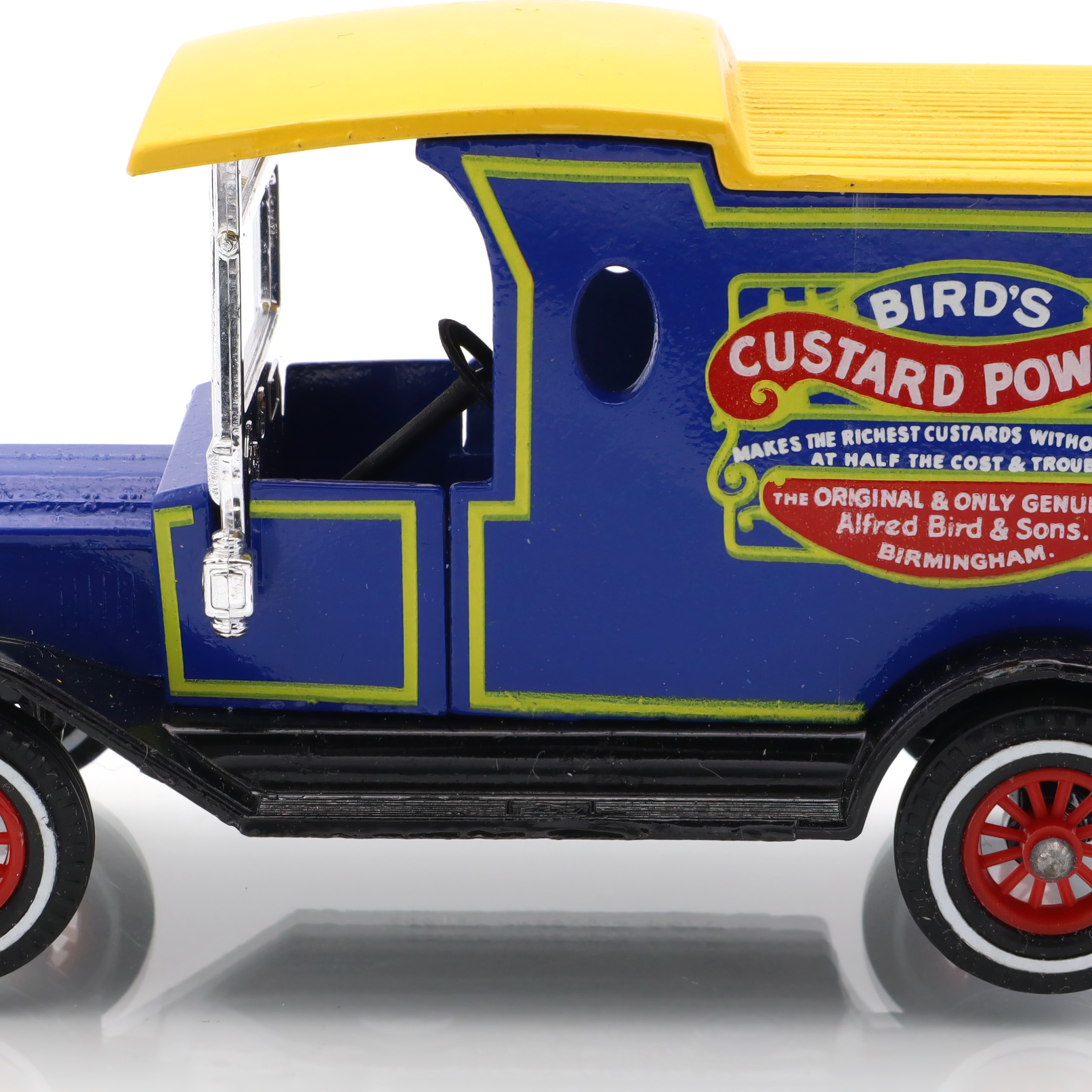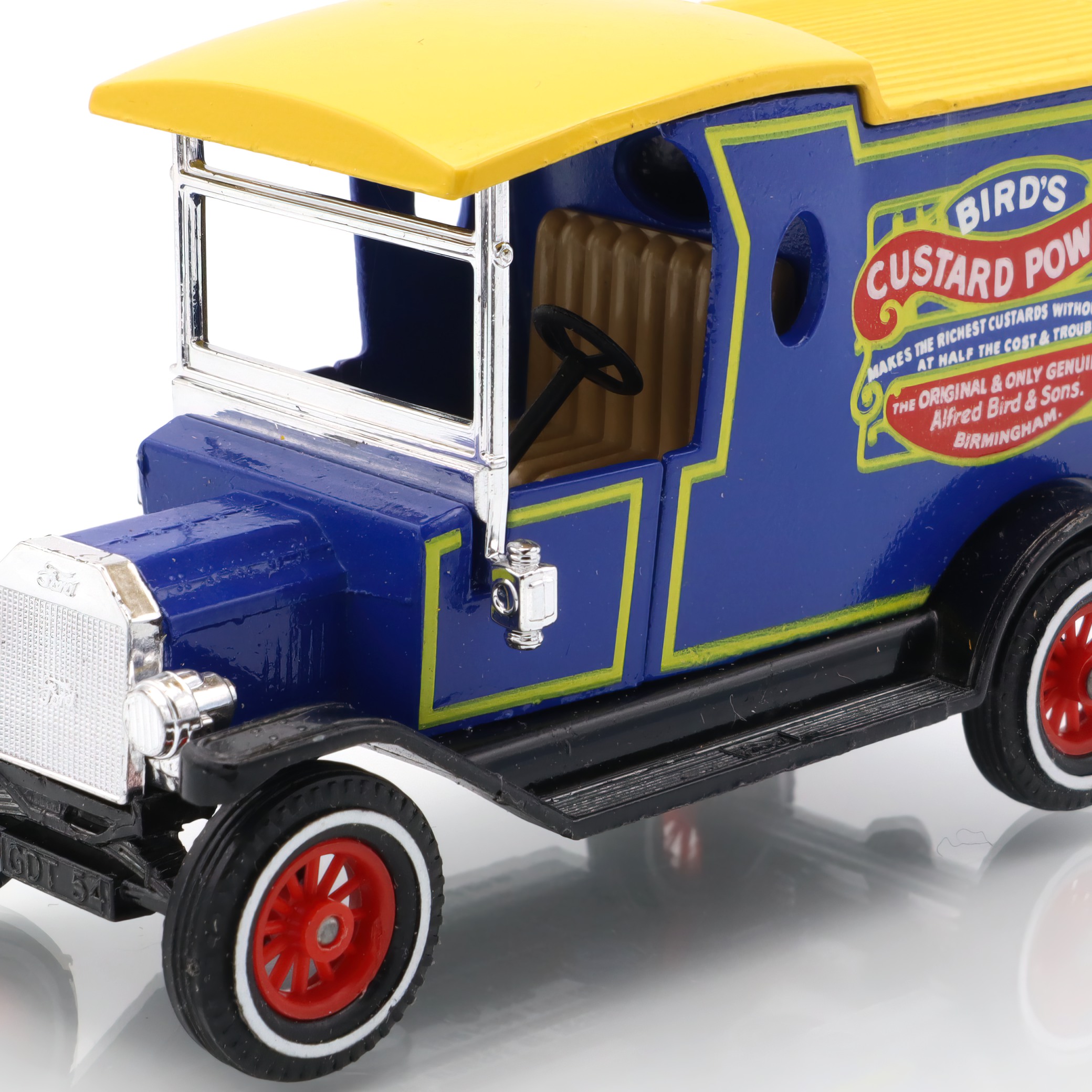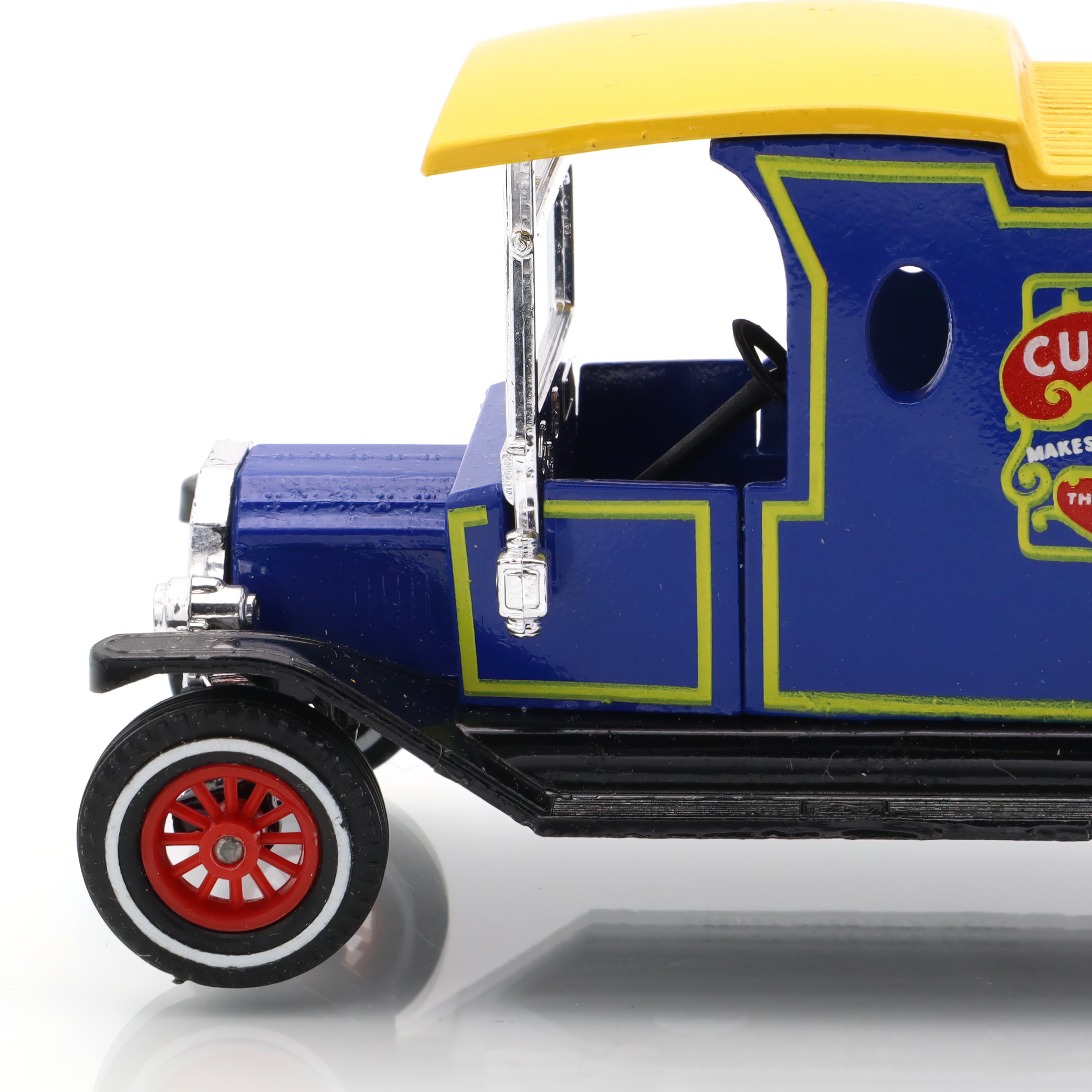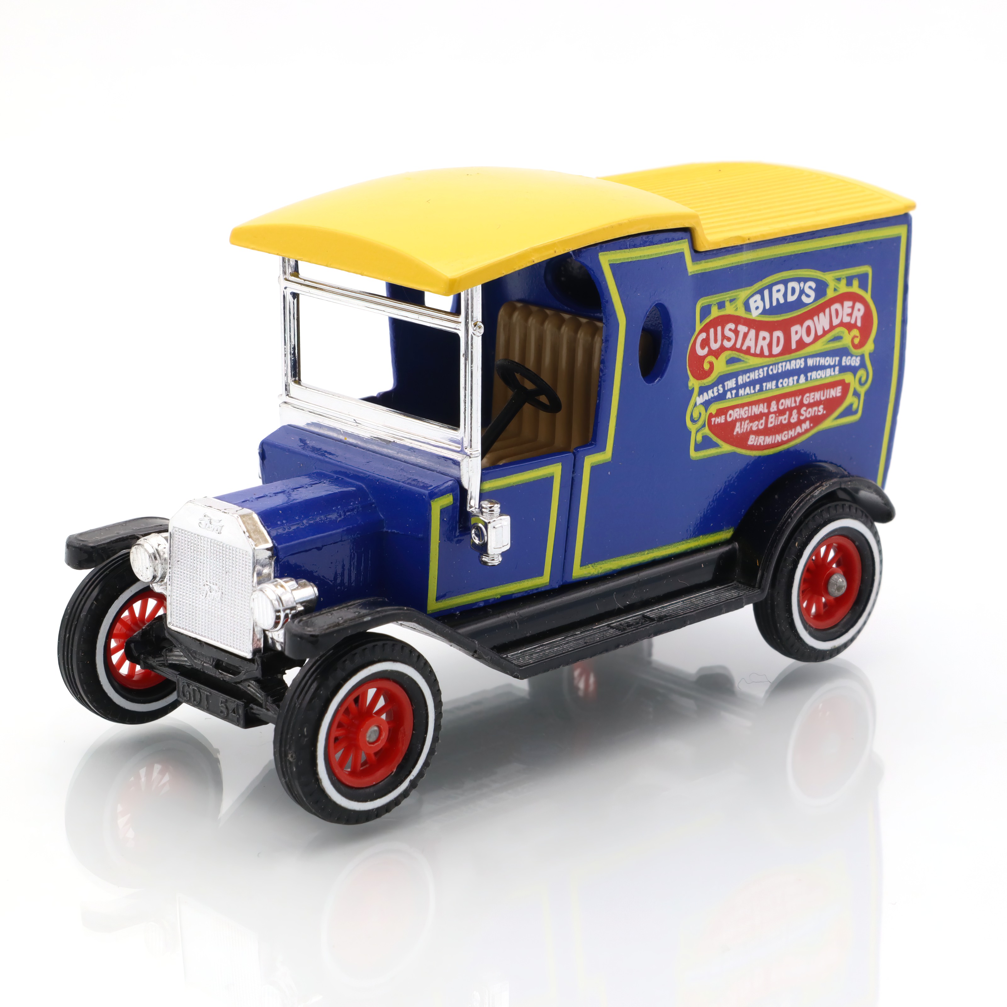 This is a Matchbox Models of Yesteryear diecast collectible of a 1912 Ford Model T. It’s a delightful little piece that captures the charm of a bygone era with its bright colors and intricate details. The model sports a vivid blue body with a yellow roof, adorned with vibrant advertising for Bird’s Custard Powder. It’s in mint condition, making it a real treasure for collectors and enthusiasts alike. Despite its small size, it brings the early 20th century to life, showcasing the unique style of vehicles from that time.