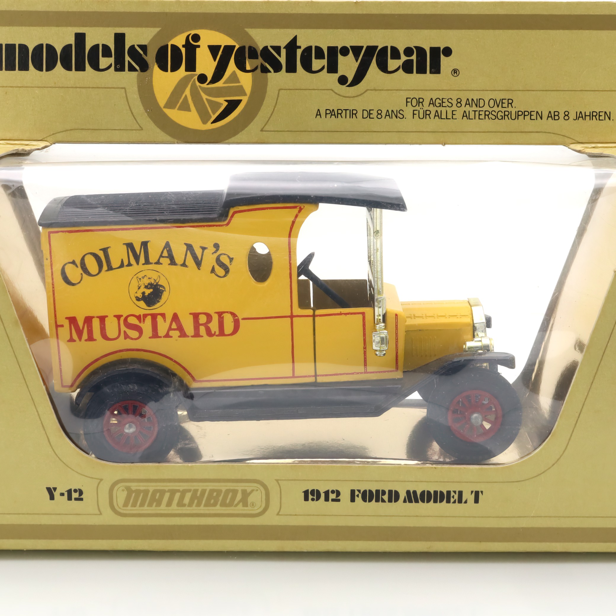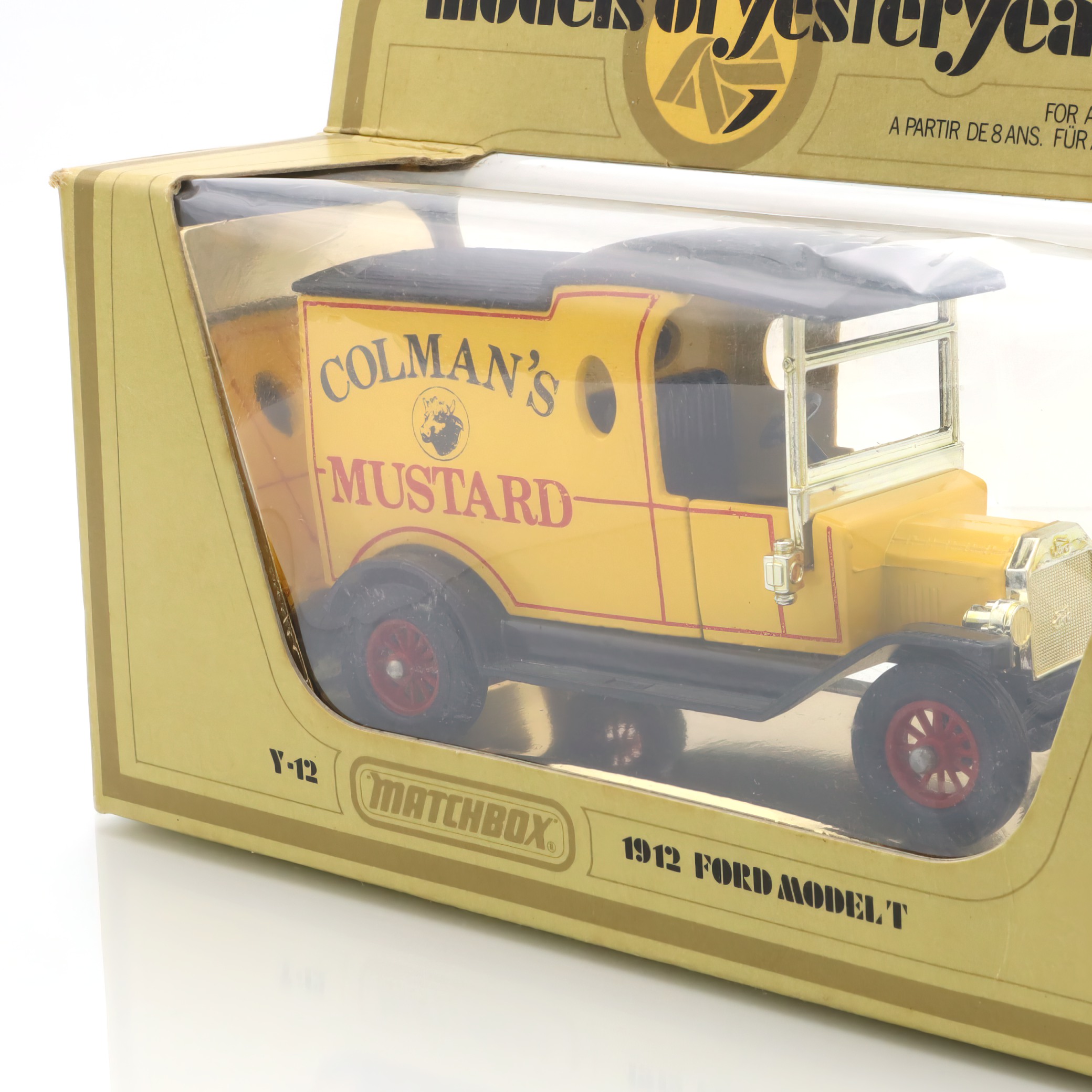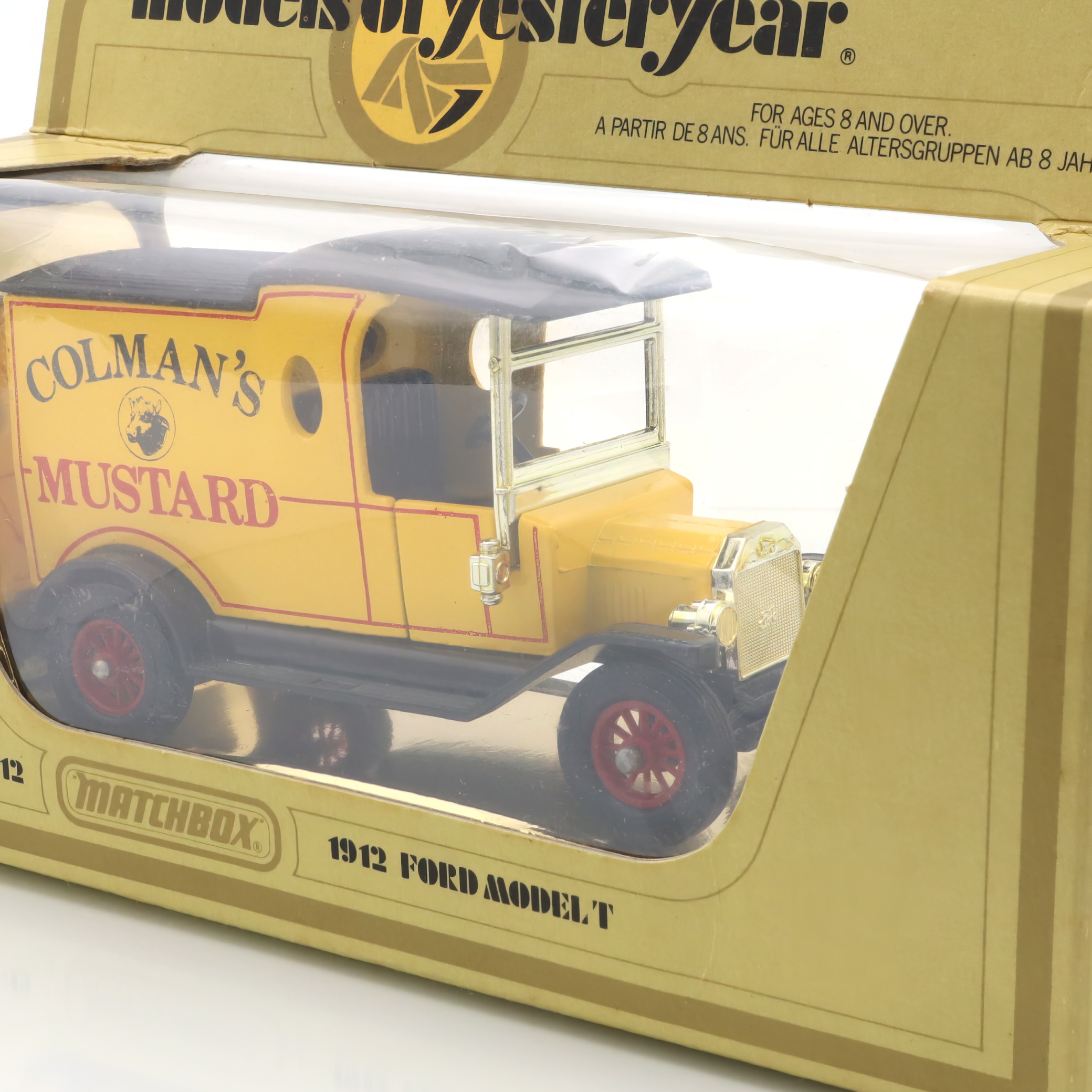 This is a vintage diecast model of the 1912 Ford Model T, specifically a Matchbox Models of Yesteryear collectible. It’s a charming replica of an early 20th-century vehicle, capturing the classic lines and nostalgic vibe of the original car. This model, featuring Colman’s Mustard branding, is in mint condition, which makes it especially appealing to collectors. Given that it’s an antique toy replica, its condition and age enhance its desirability and value. The model, with its eye-catching yellow and black design and intricate detailing, serves not just as a toy but as a piece of history preserved in miniature form.