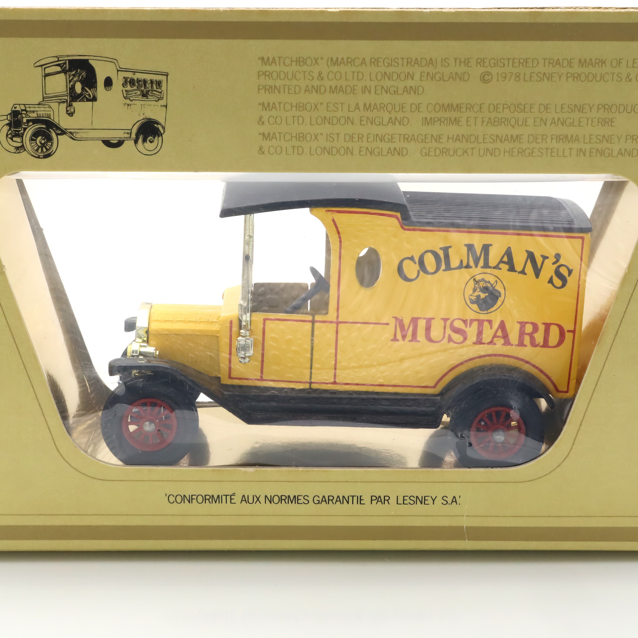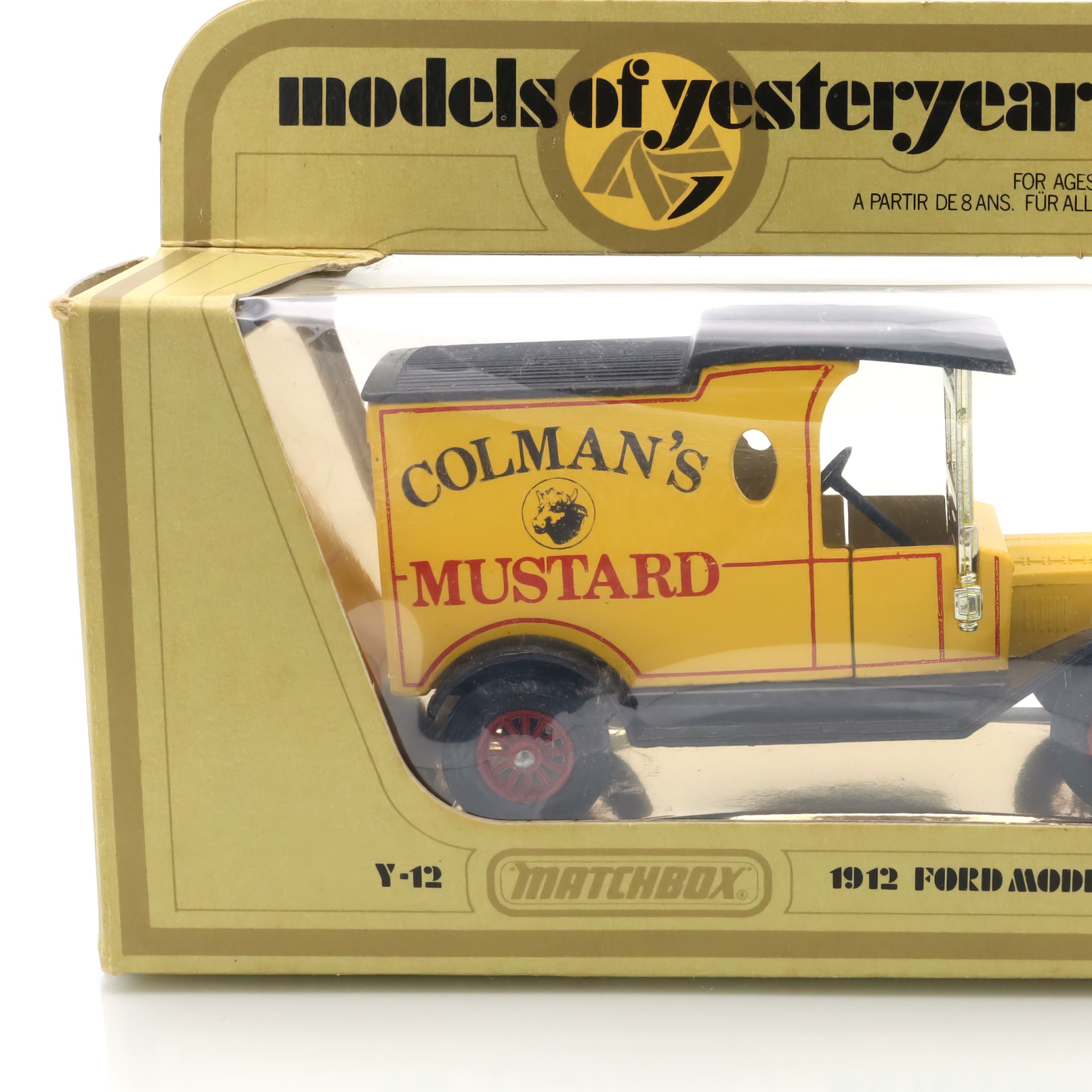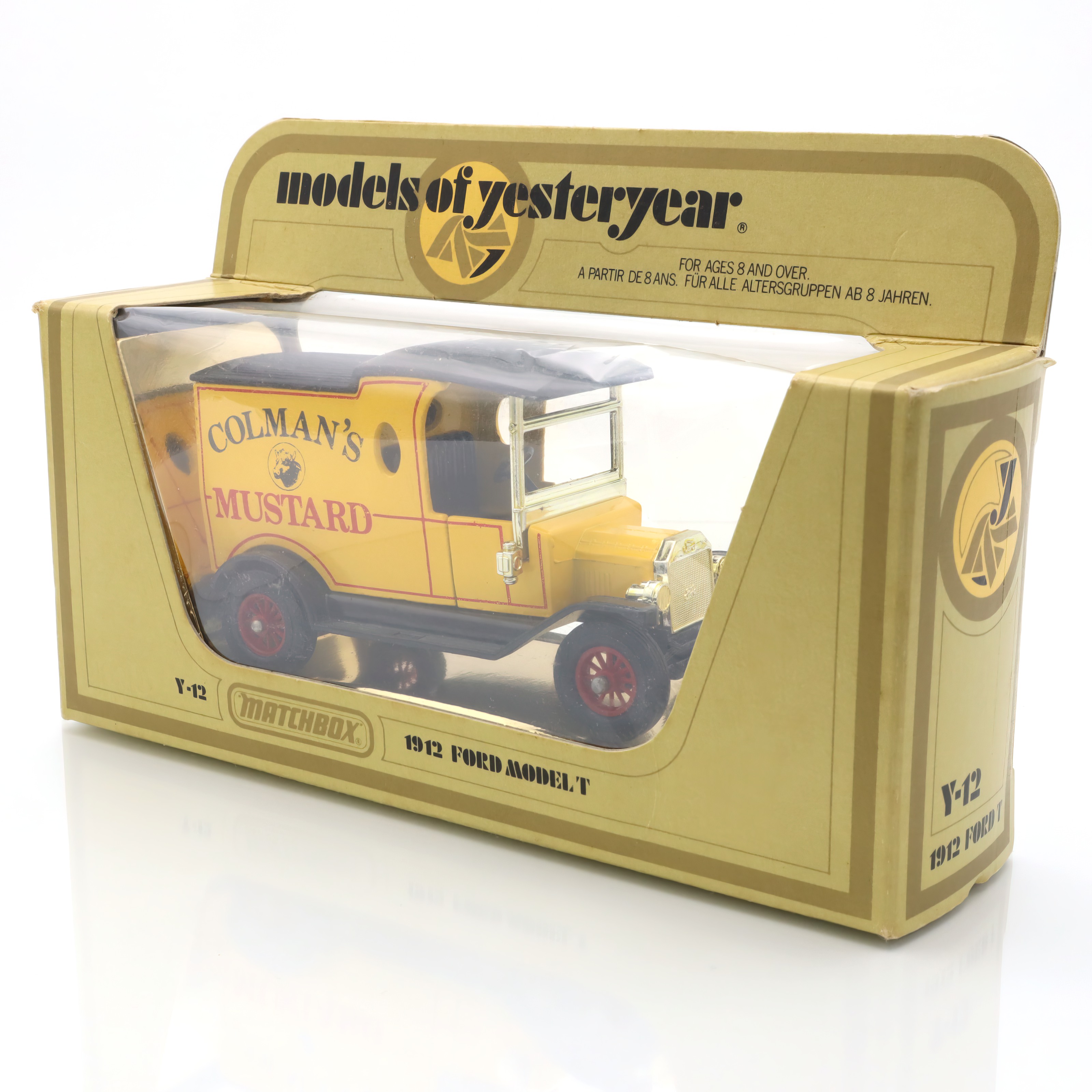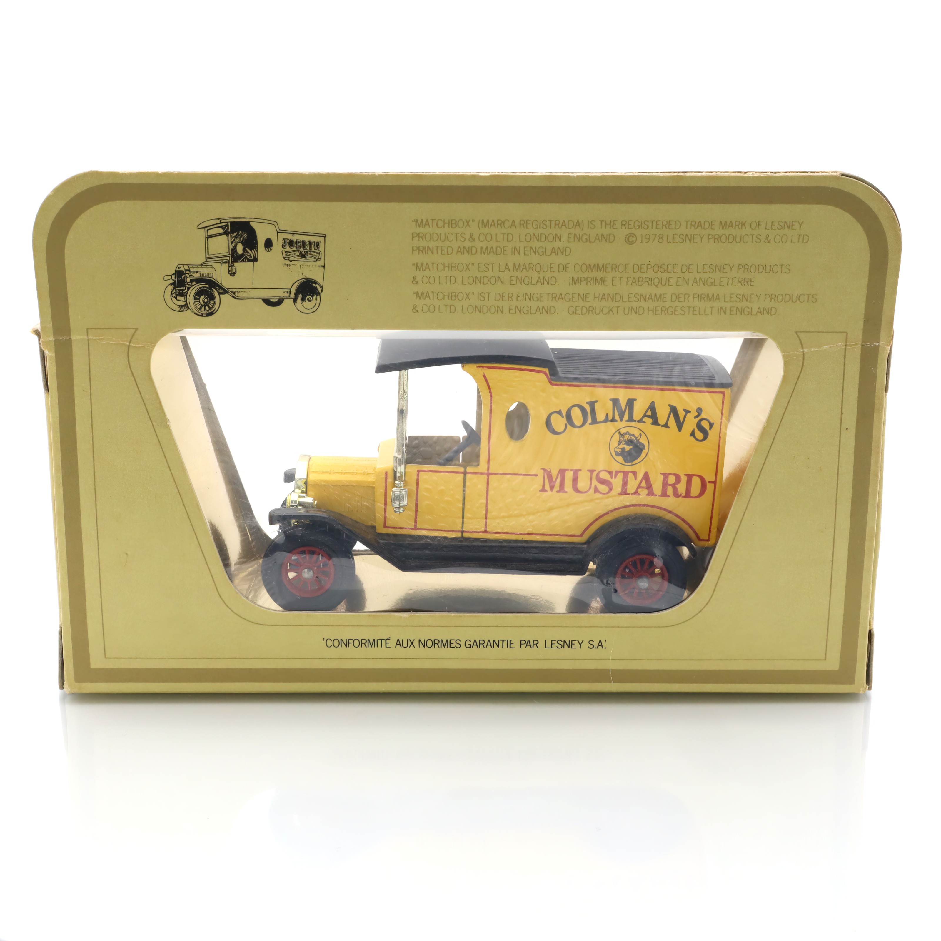 This is a vintage diecast model of the 1912 Ford Model T, specifically a Matchbox Models of Yesteryear collectible. It’s a charming replica of an early 20th-century vehicle, capturing the classic lines and nostalgic vibe of the original car. This model, featuring Colman’s Mustard branding, is in mint condition, which makes it especially appealing to collectors. Given that it’s an antique toy replica, its condition and age enhance its desirability and value. The model, with its eye-catching yellow and black design and intricate detailing, serves not just as a toy but as a piece of history preserved in miniature form.