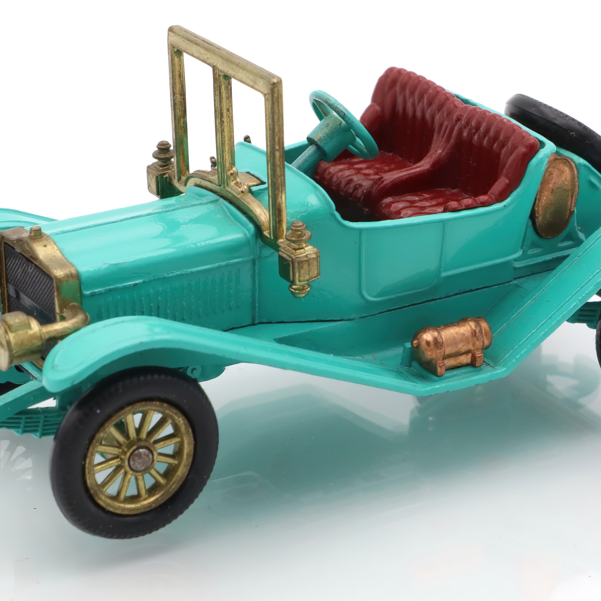 This vintage artifact is a delightful diecast model of the 1911 Maxwell Roadster. At a glance, it’s clear this piece is a collectible treasure, skillfully crafted to capture the charm of early 20th-century automobiles. Its mint condition is a testament to the care it has received over the years, showcasing vibrant colors and intricate details. The model features a striking turquoise body with brass accents, aiding in the representation of the classic touring car style. The red interior and the small, delicate steering wheel bring the car to life, allowing collectors to appreciate the era’s design aesthetics.