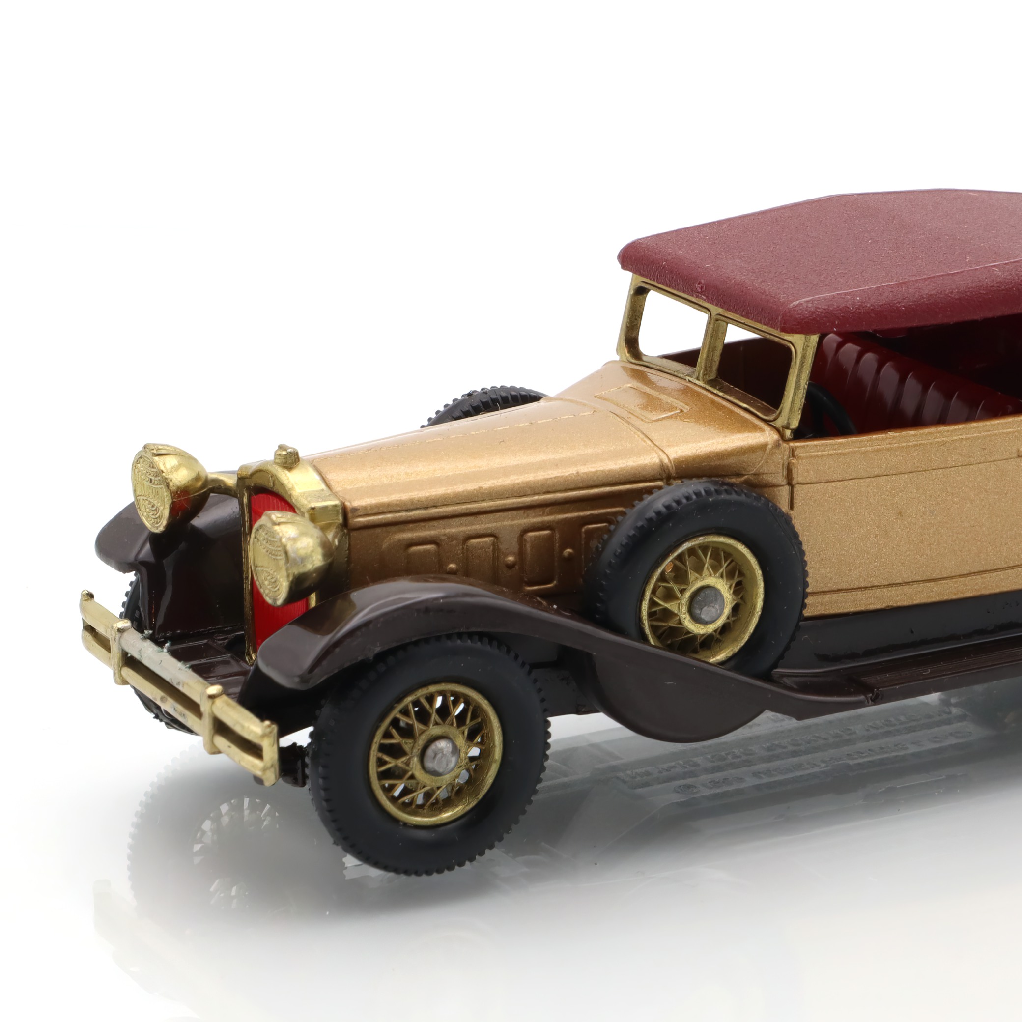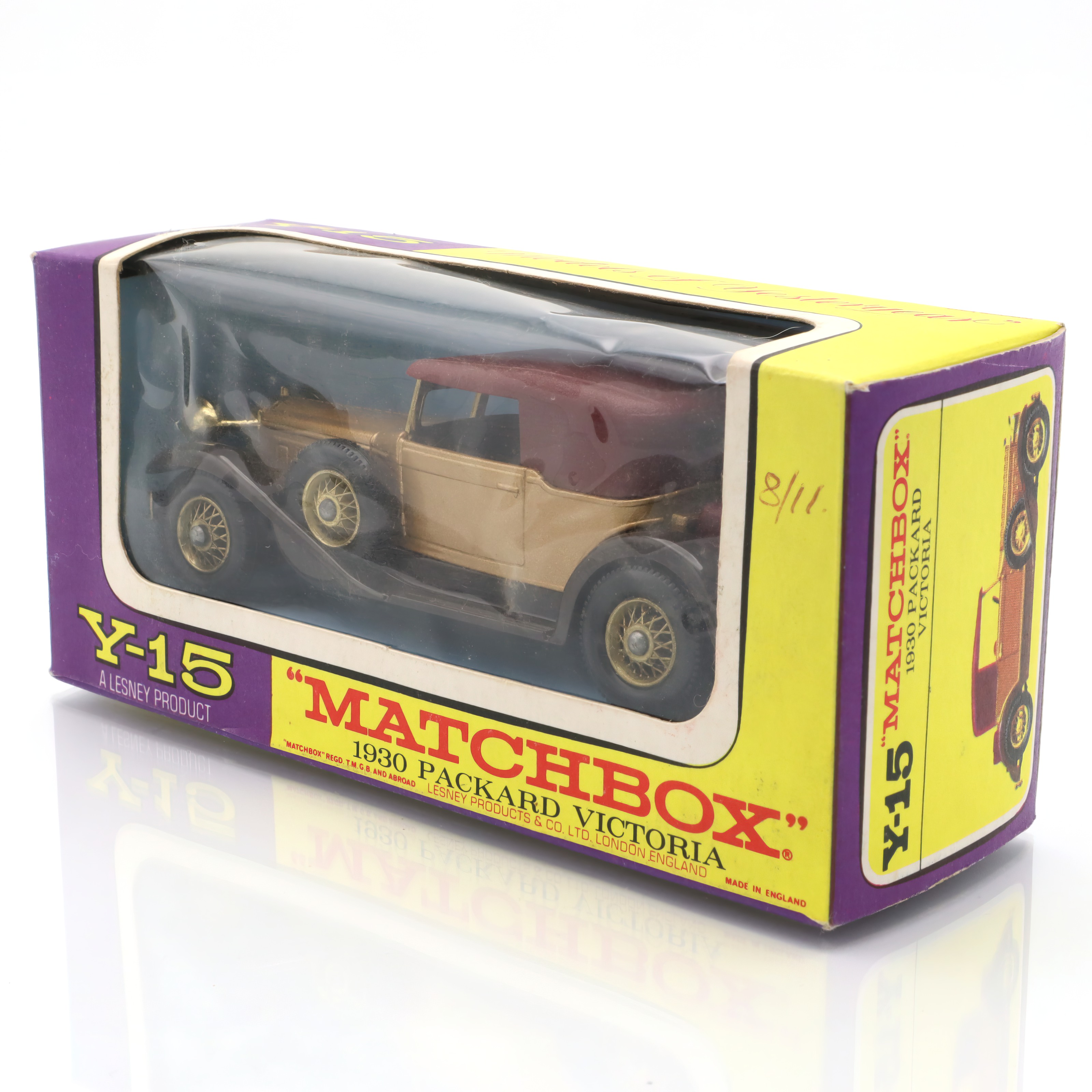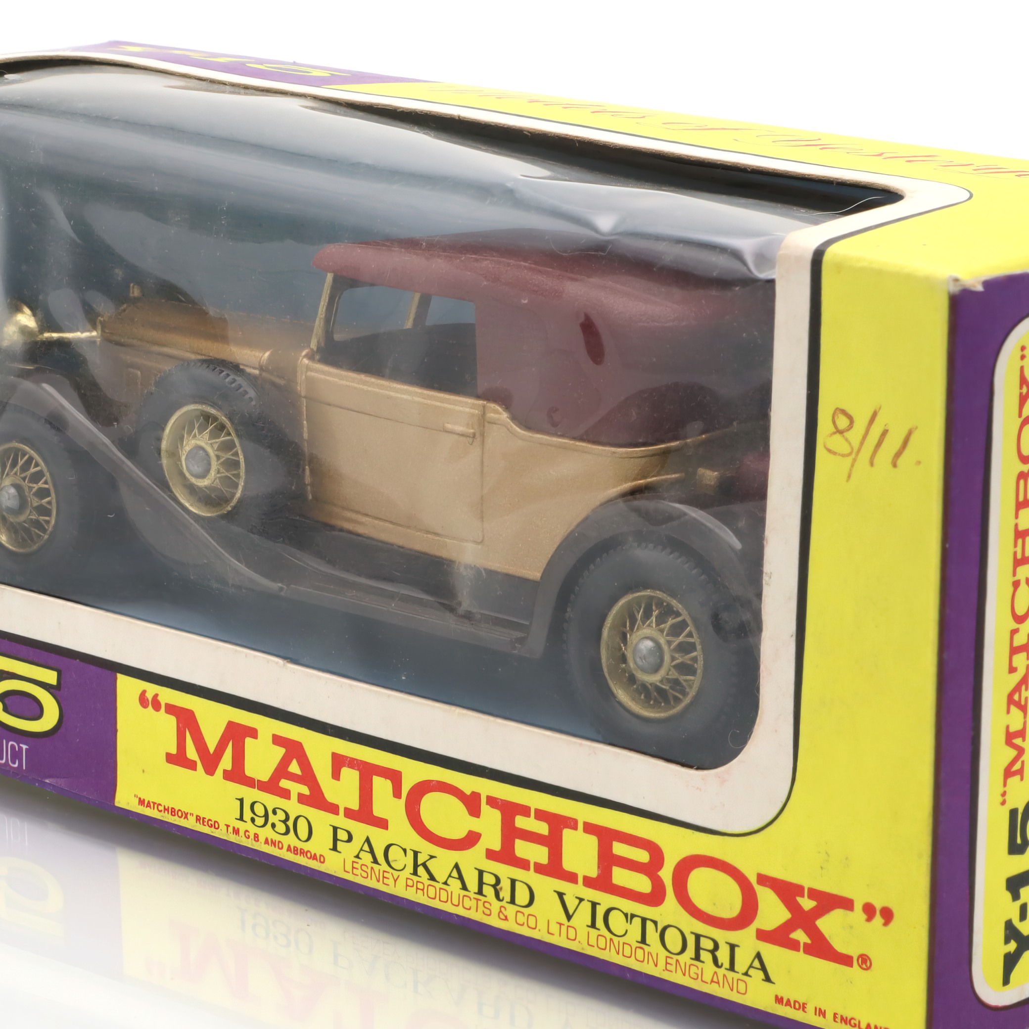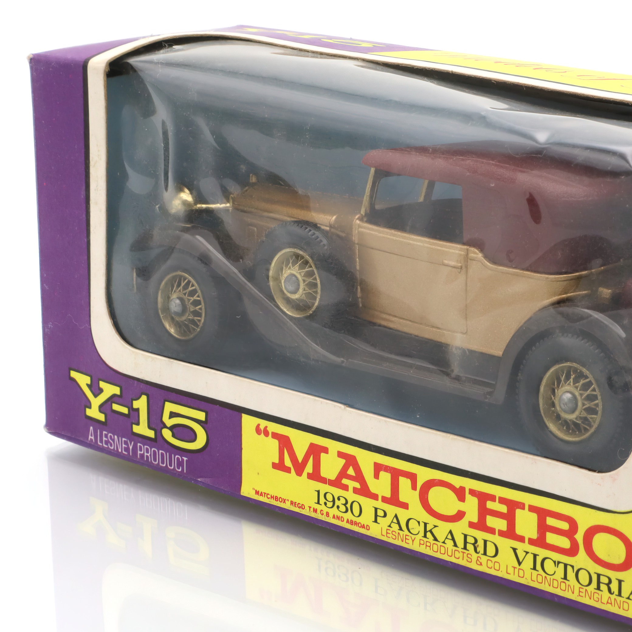 The item you’re looking at is a Y-15 1930 Packard Victoria, a vintage diecast collectible model car from the Matchbox Models of Yesteryear line. This miniature replica is in mint condition, which is quite a rare find for collectors. Its petite size belies the striking detail in its design, showcasing the grandiosity of the original 1930 Packard Victoria. The tiny features such as the wheels, grill, and bodywork are carefully crafted, offering a glimpse into the elegance and style of classic automobiles from a bygone era. The model’s colors, typically a blend of gold and maroon, echo the luxurious image that Packard automobiles were known for, providing a wonderful piece of nostalgia for admirers of vintage cars.