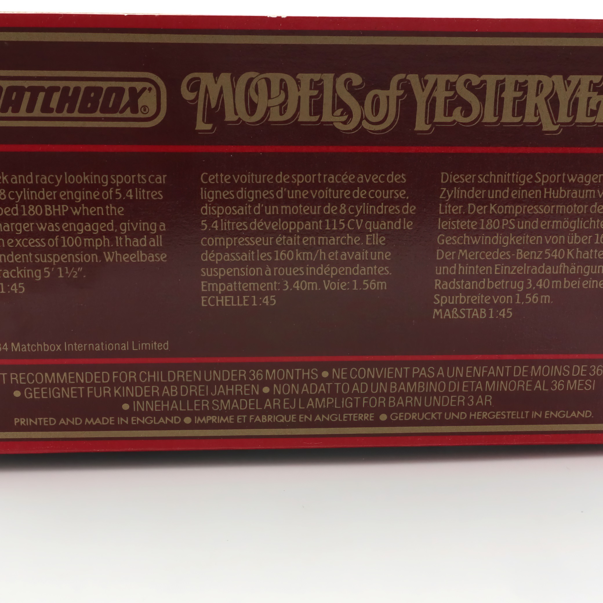The Matchbox brand, known for its die-cast toy cars, has been a beloved name among car enthusiasts and collectors since it started in the 1950s. The Models of Yesteryear line specifically highlighted iconic automobiles from the past, making them desirable collectibles for those interested in automotive history. The Mercedes-Benz 540K model reflects the luxury and power associated with the original car, which was a symbol of prestige in its time. This die-cast version pays homage to that legacy, allowing collectors to own a piece of automotive history without the hefty price tag of a real vintage car.