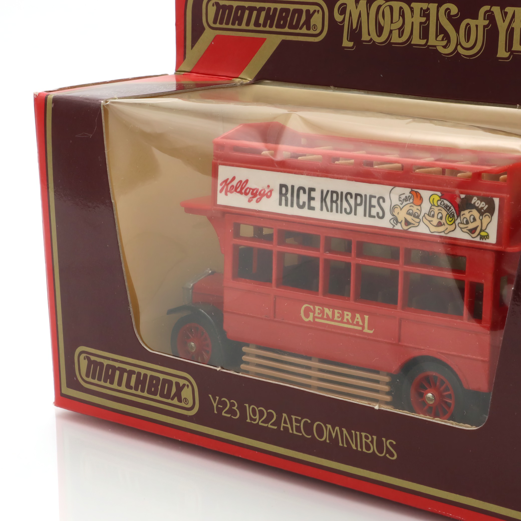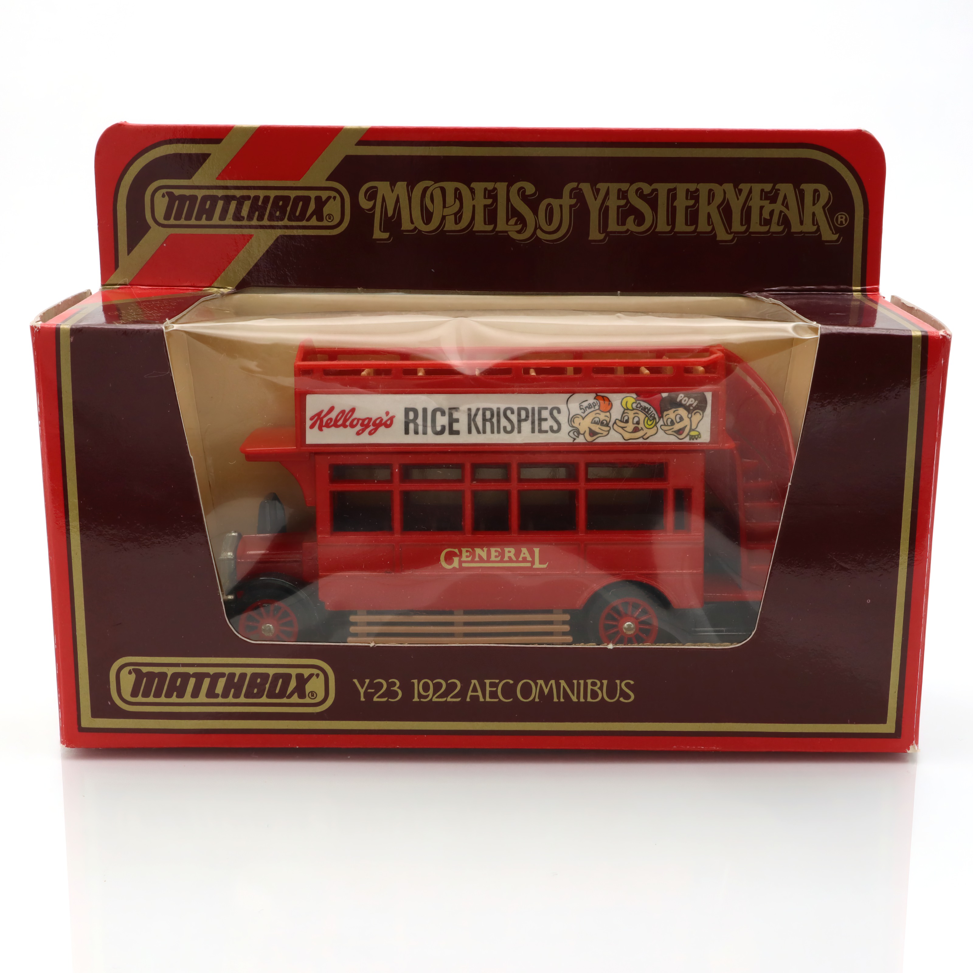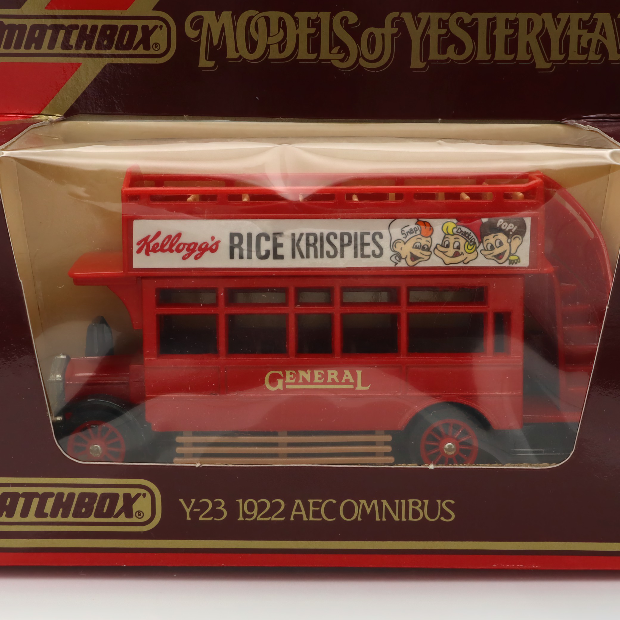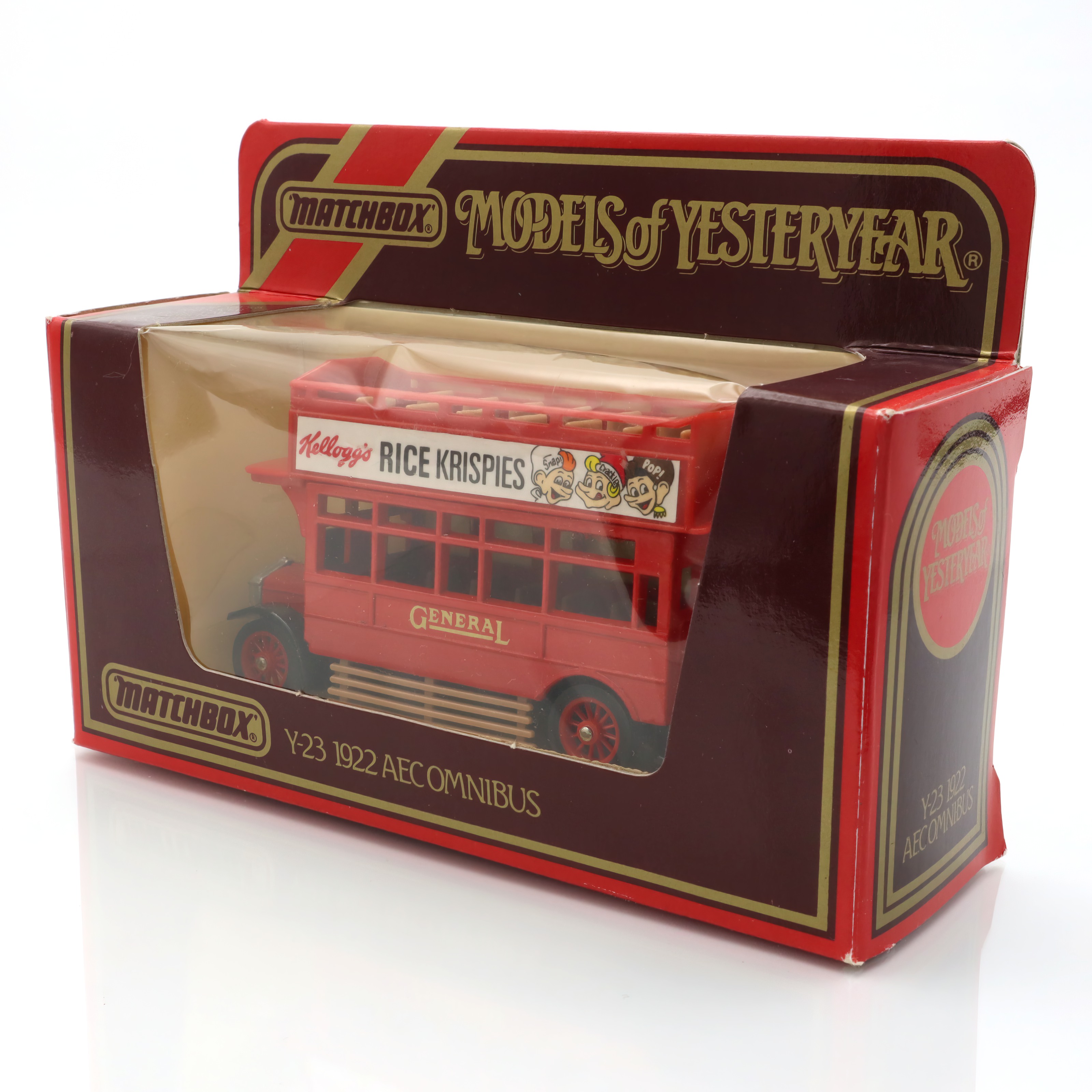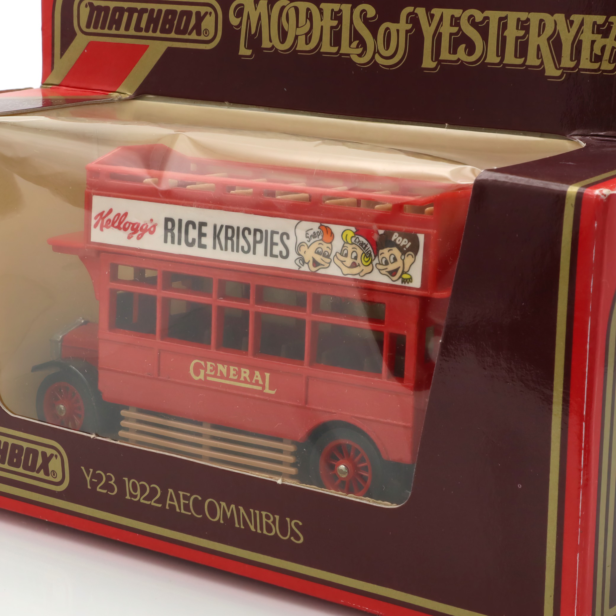 This vintage artifact is a Y-23 1922 AEC Omnibus, a diecast model from the Matchbox Models of Yesteryear collection. Boasting a mint condition, this model represents an era of classic British transportation, capturing the charm and elegance of early 20th-century buses. The pristine state of this collectible makes it a treasured piece for enthusiasts and collectors alike. It features detailed craftsmanship and nostalgic elements, such as the advertisement for Kellogg’s Rice Krispies, which adds to its retro appeal. The model’s design is a faithful reproduction of the vintage omnibus, making it a tangible piece of history.