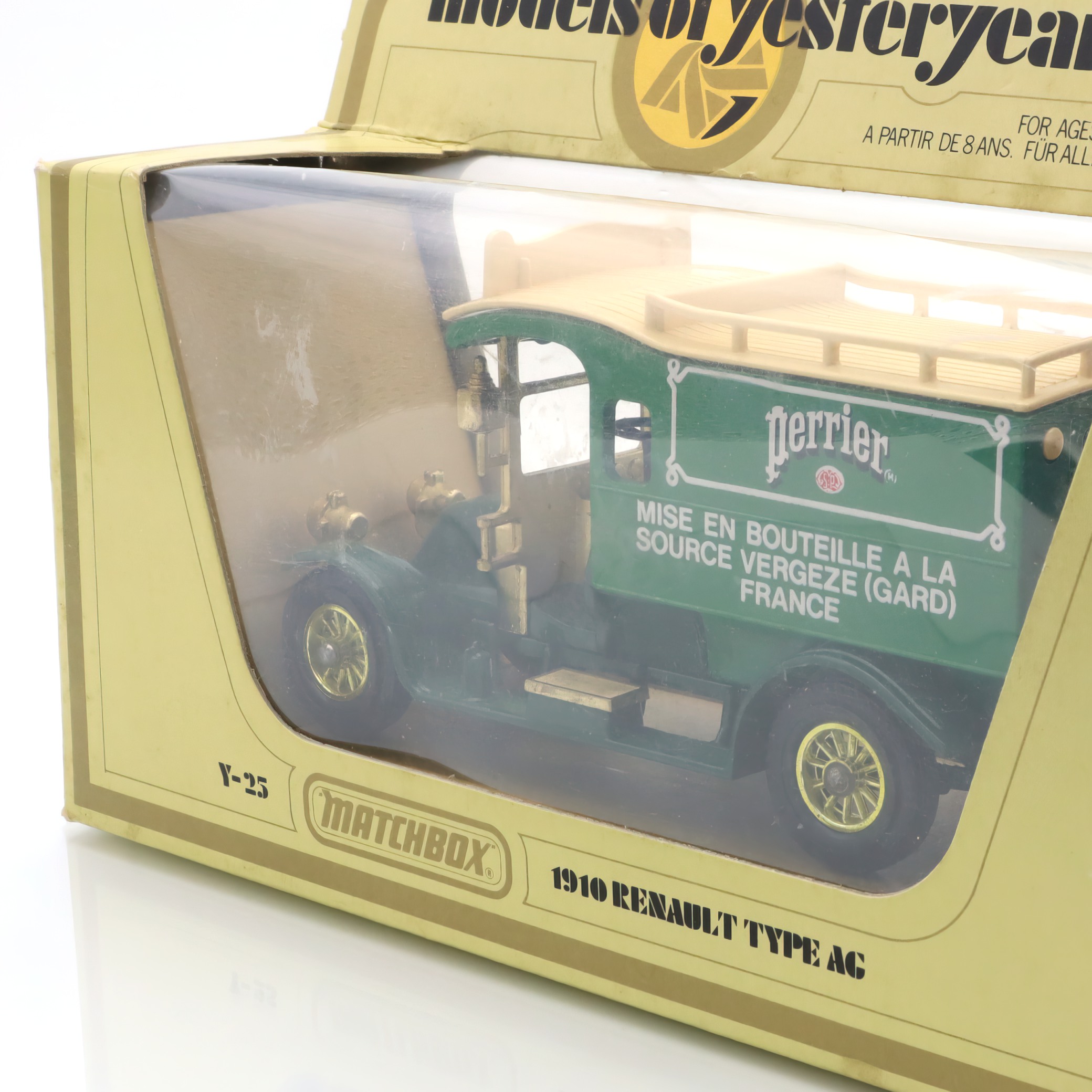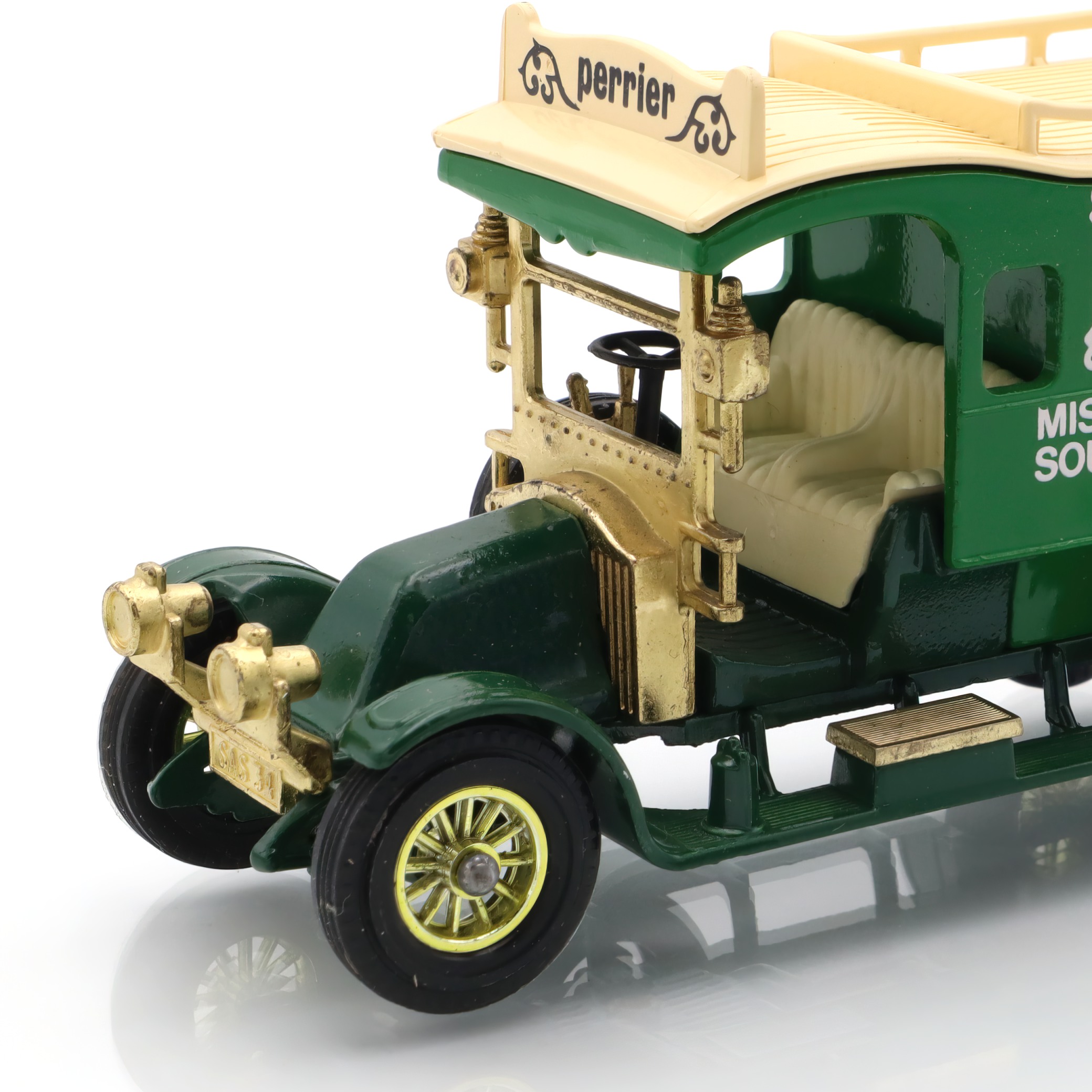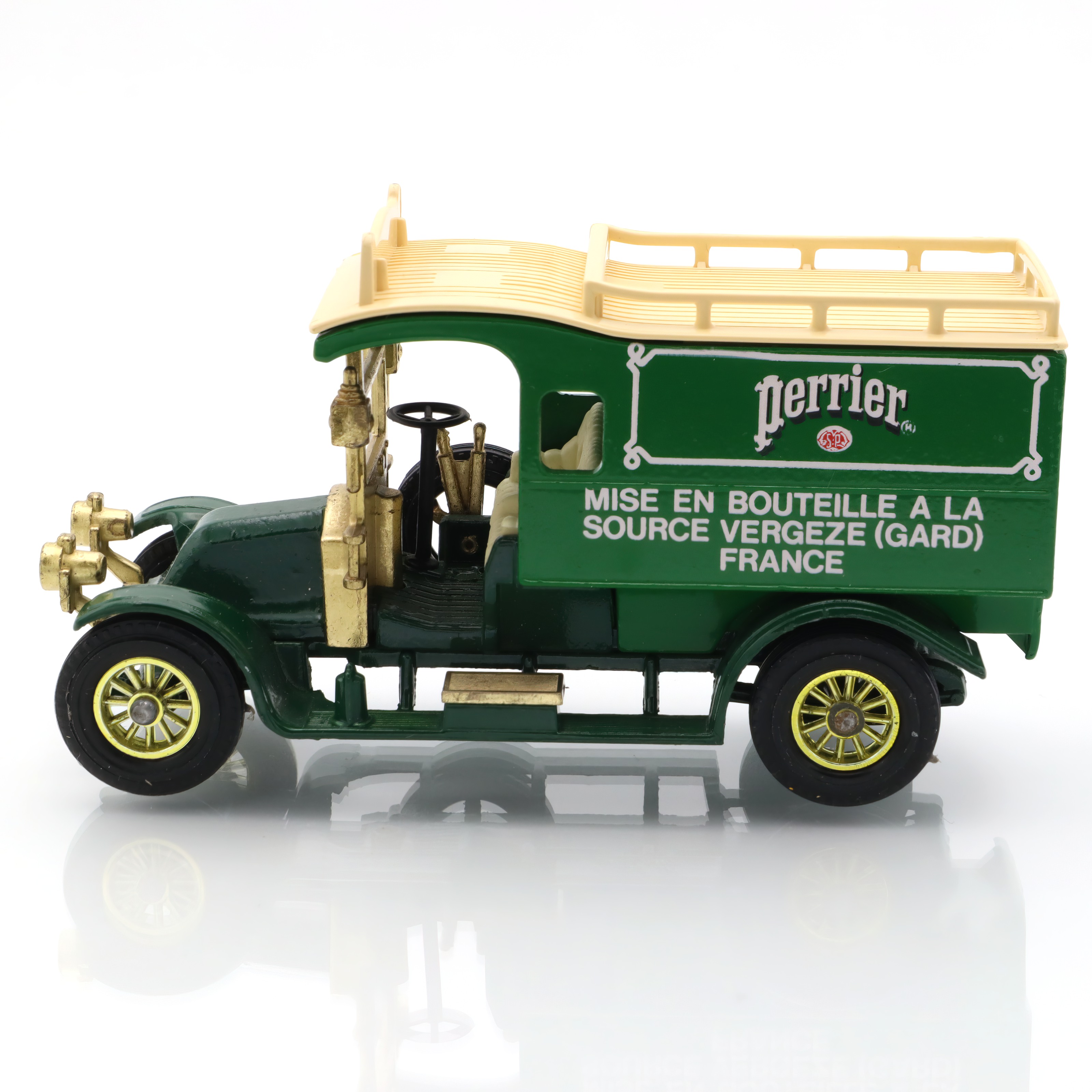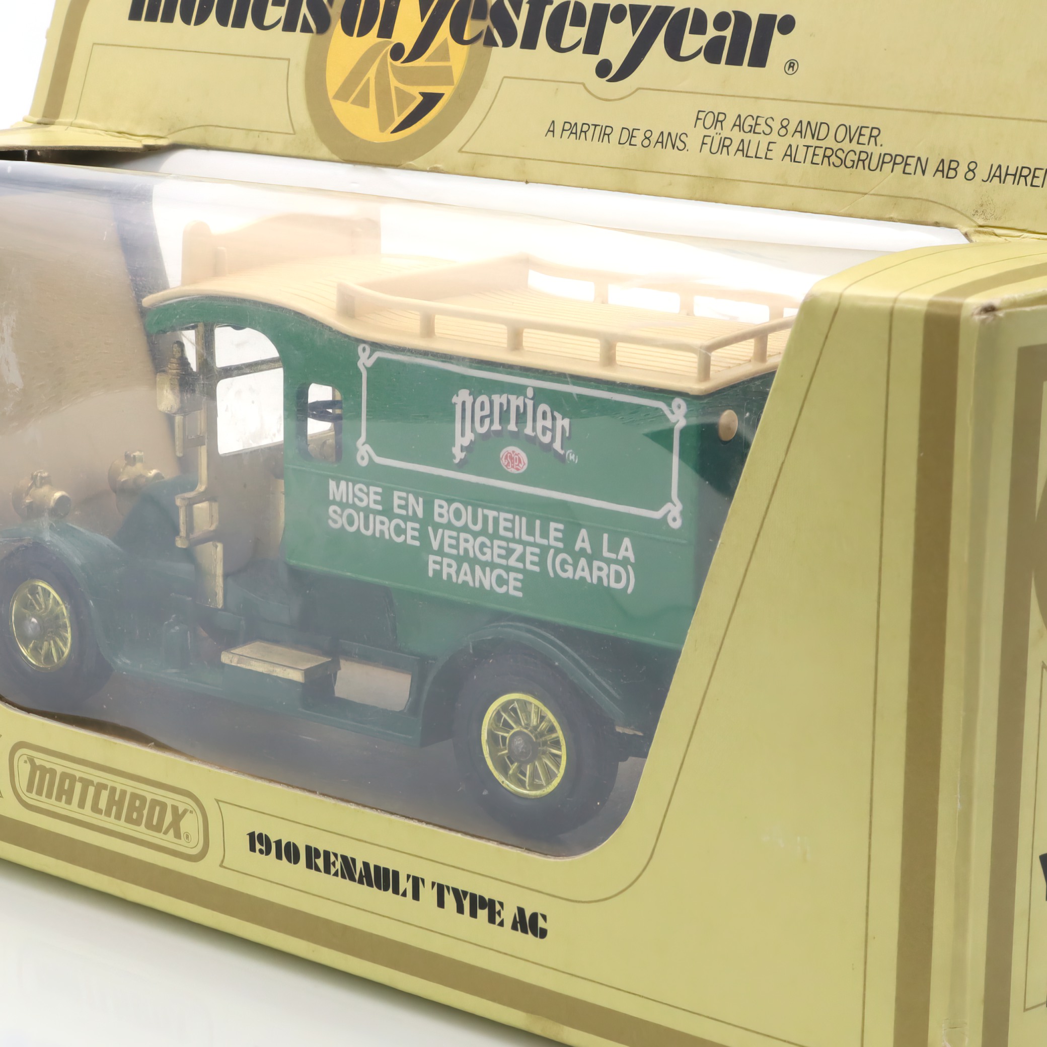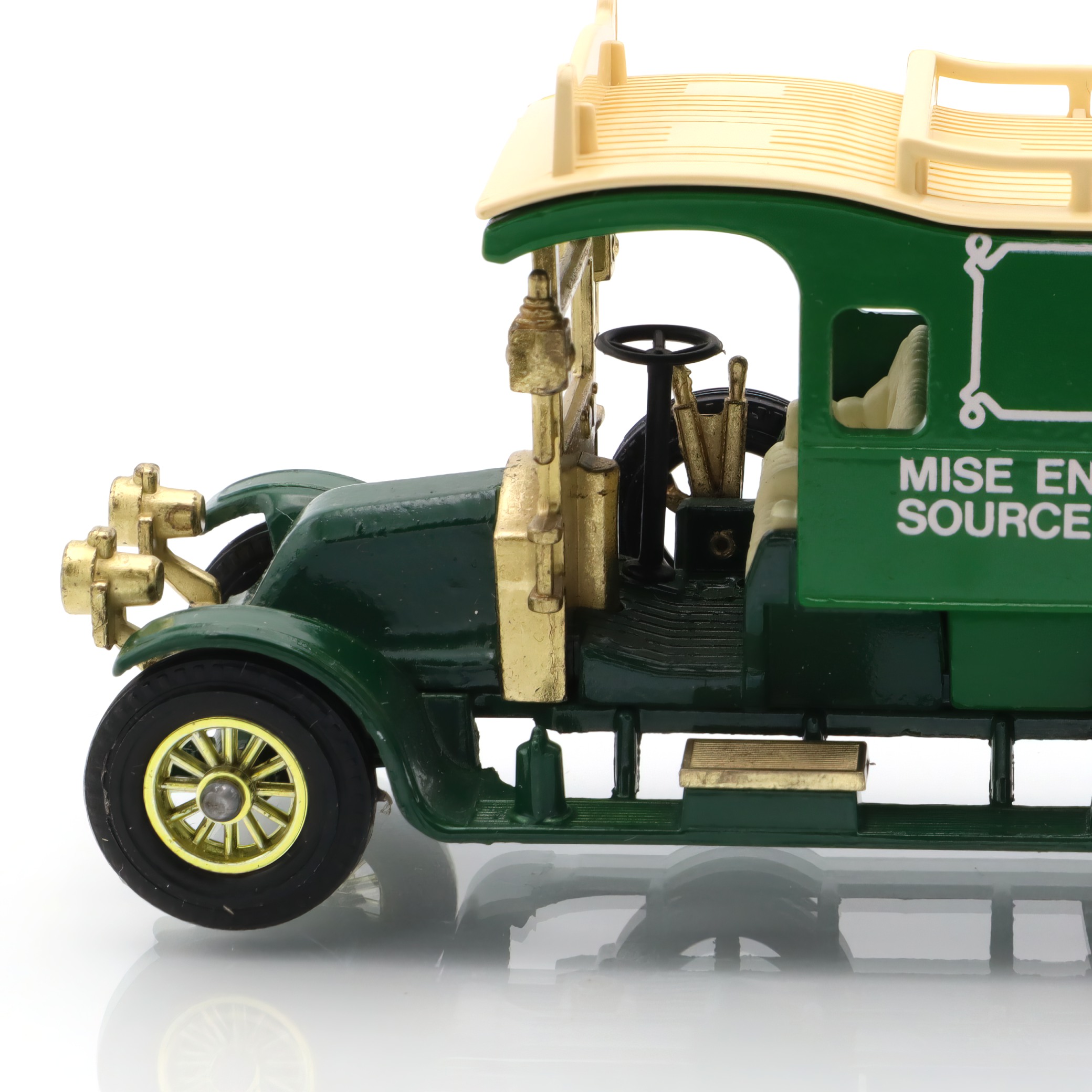 The vintage artifact you have is a diecast model of the 1910 Renault Type AG. This miniature replica is a detailed collectible, showcasing a classic French taxi that recalls the early automotive days. This particular model is from a rare Matchbox edition, and it’s in mint condition, making it especially appealing to antique car enthusiasts. With fine craftsmanship, the model captures the elegance and charm of the original Renault vehicles, featuring intricate detailing in both the bodywork and interior. The delightful color scheme and authentic decals add a touch of nostalgia, transporting you back to an era when this type of car would have been seen bustling through the streets of early 20th-century Paris.