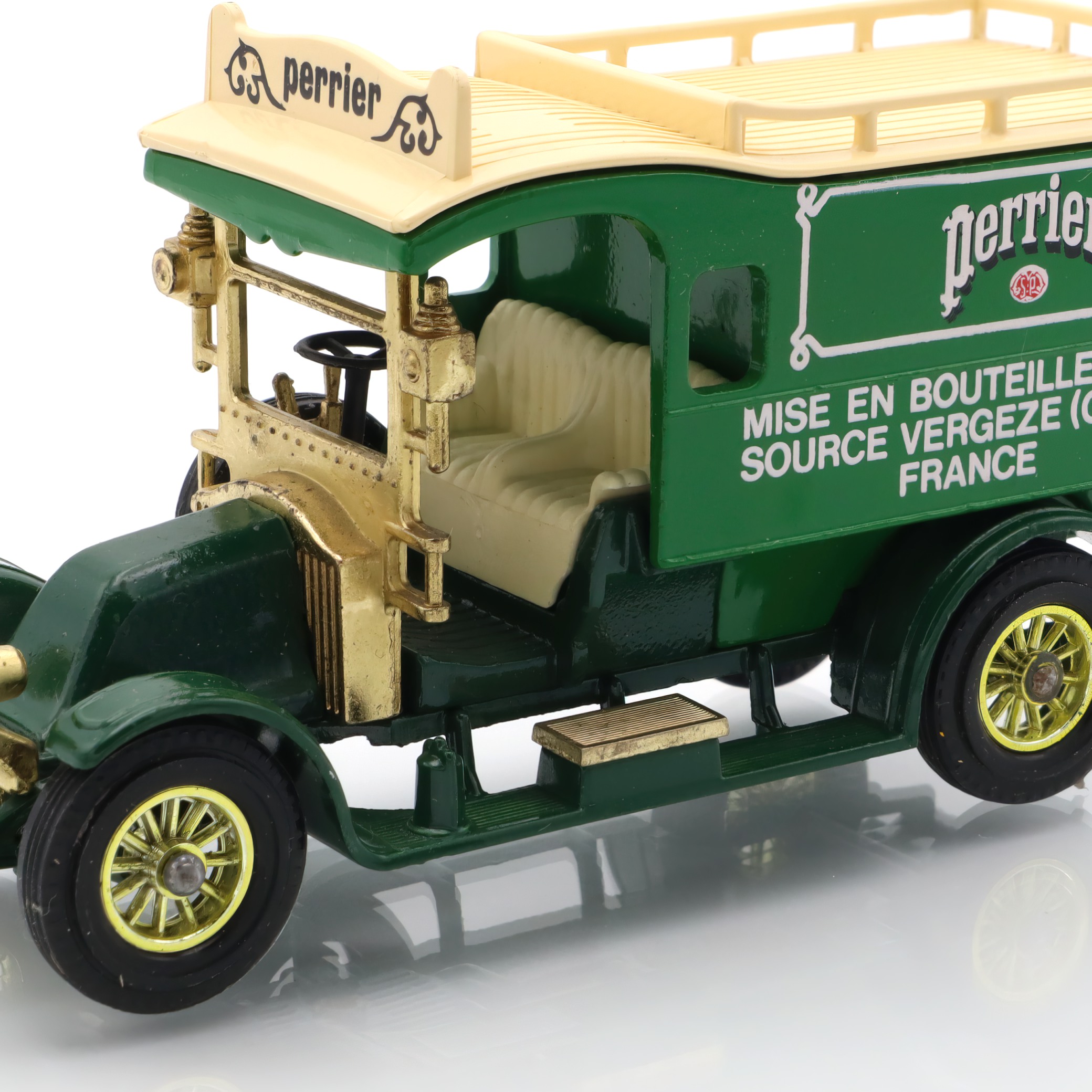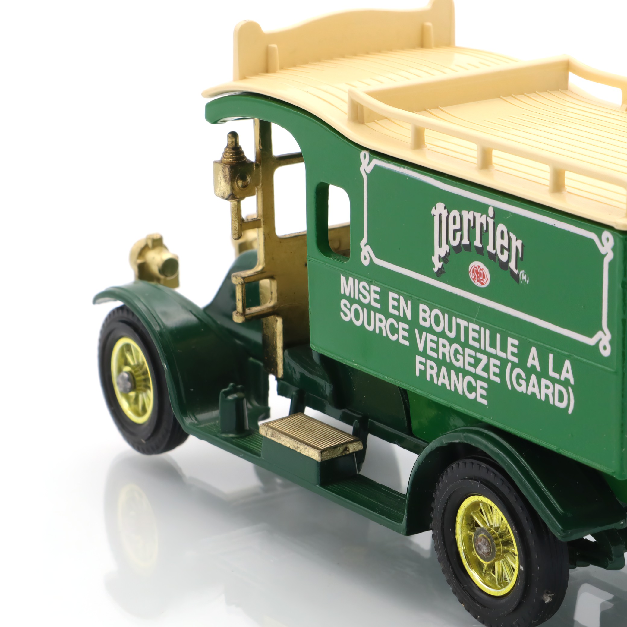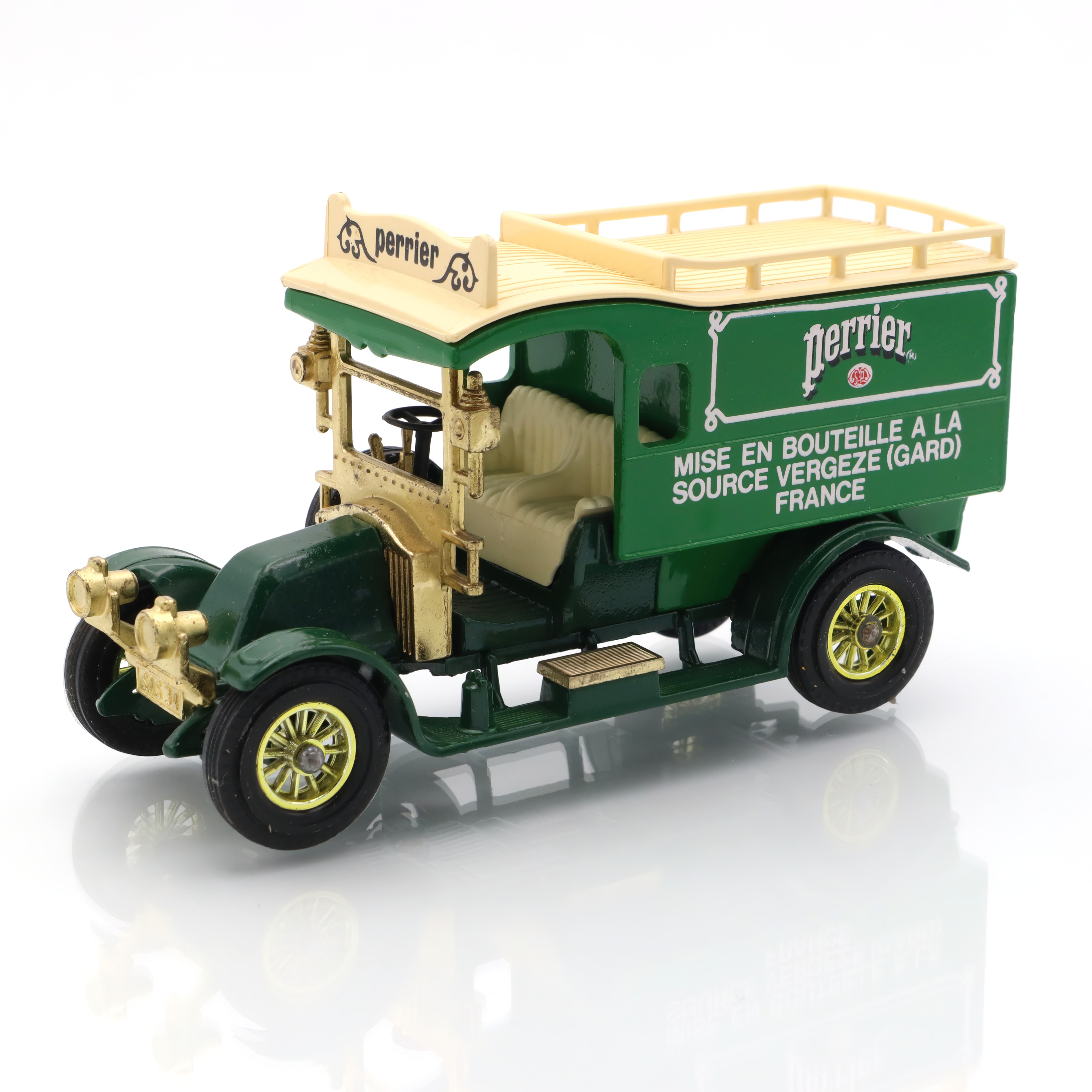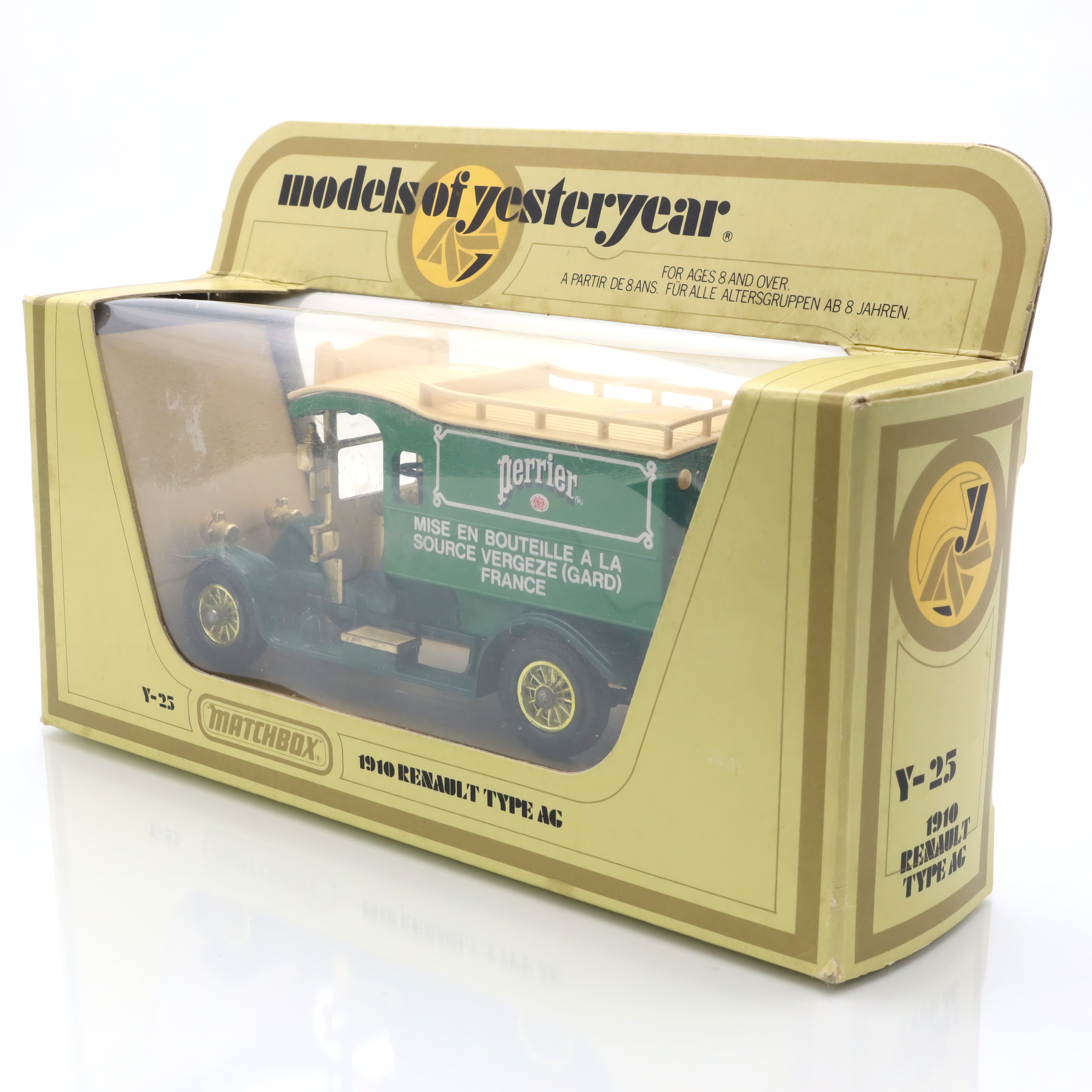 The vintage artifact you have is a diecast model of the 1910 Renault Type AG. This miniature replica is a detailed collectible, showcasing a classic French taxi that recalls the early automotive days. This particular model is from a rare Matchbox edition, and it’s in mint condition, making it especially appealing to antique car enthusiasts. With fine craftsmanship, the model captures the elegance and charm of the original Renault vehicles, featuring intricate detailing in both the bodywork and interior. The delightful color scheme and authentic decals add a touch of nostalgia, transporting you back to an era when this type of car would have been seen bustling through the streets of early 20th-century Paris.