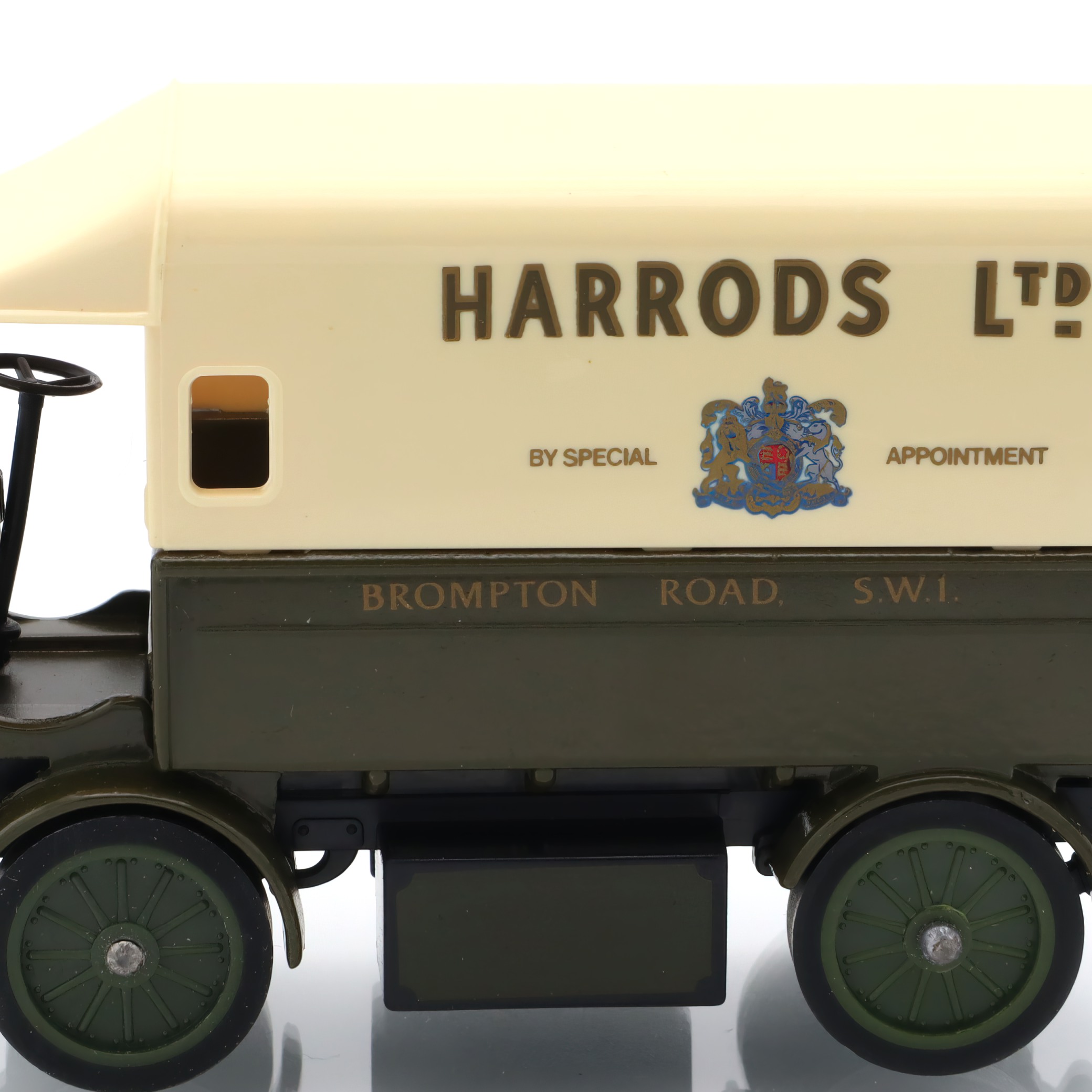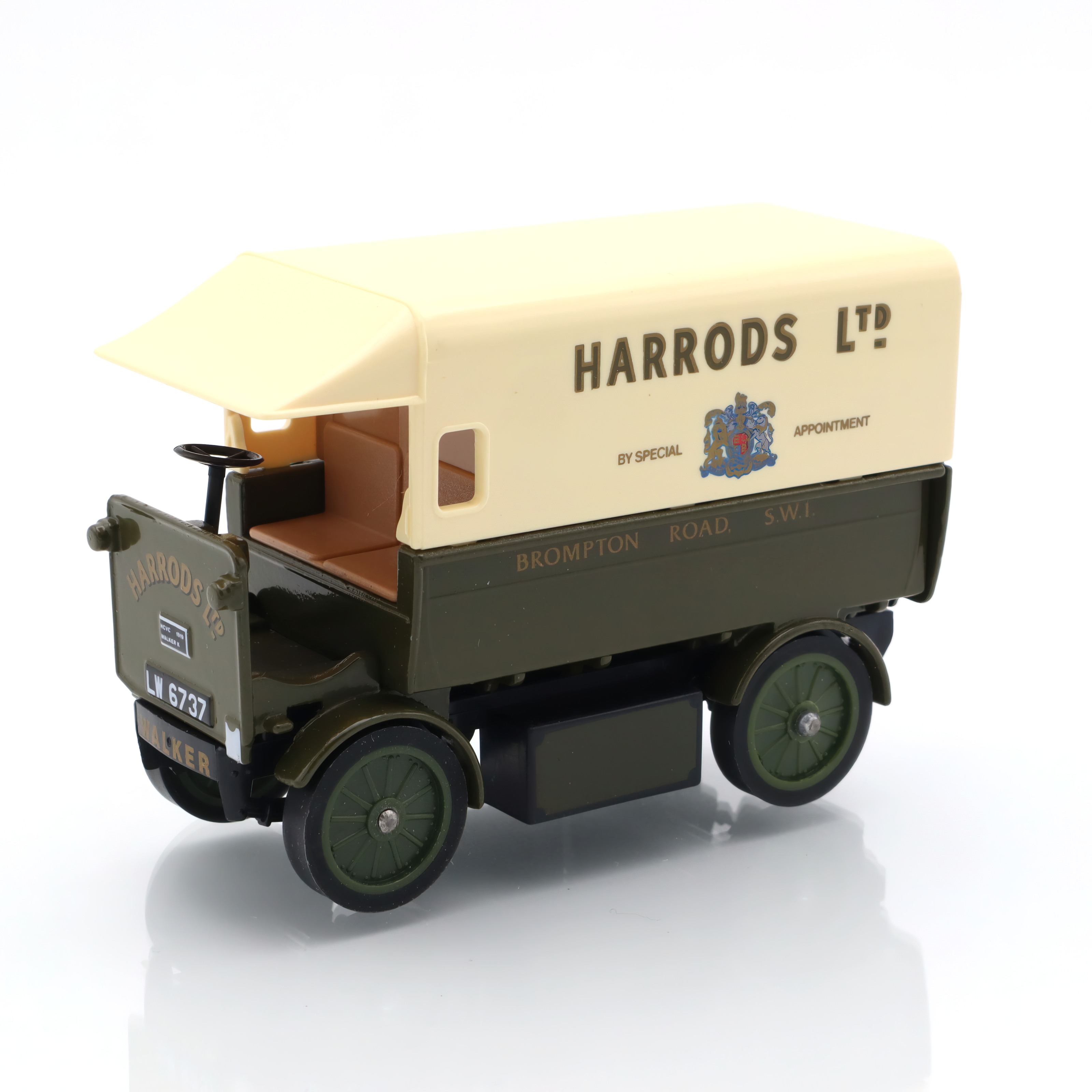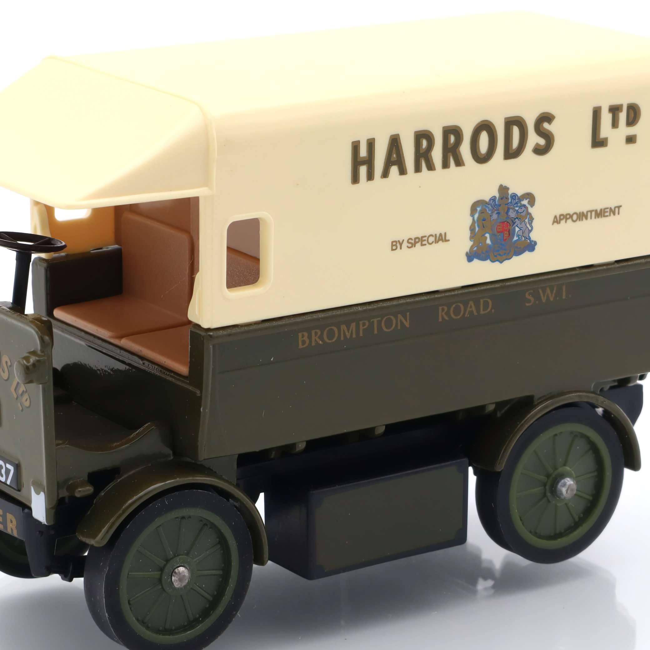 This particular model, with its Harrods branding, adds an extra layer of interest and nostalgia. Harrods, a landmark department store in London, symbolizes luxury and sophistication, and the use of their logo suggests an era when such electric vans might have been commonplace in their operations. Made several decades ago, this model isn’t just a plaything; it’s a slice of history linking to an era of burgeoning electric vehicle technology, long before it became mainstream.