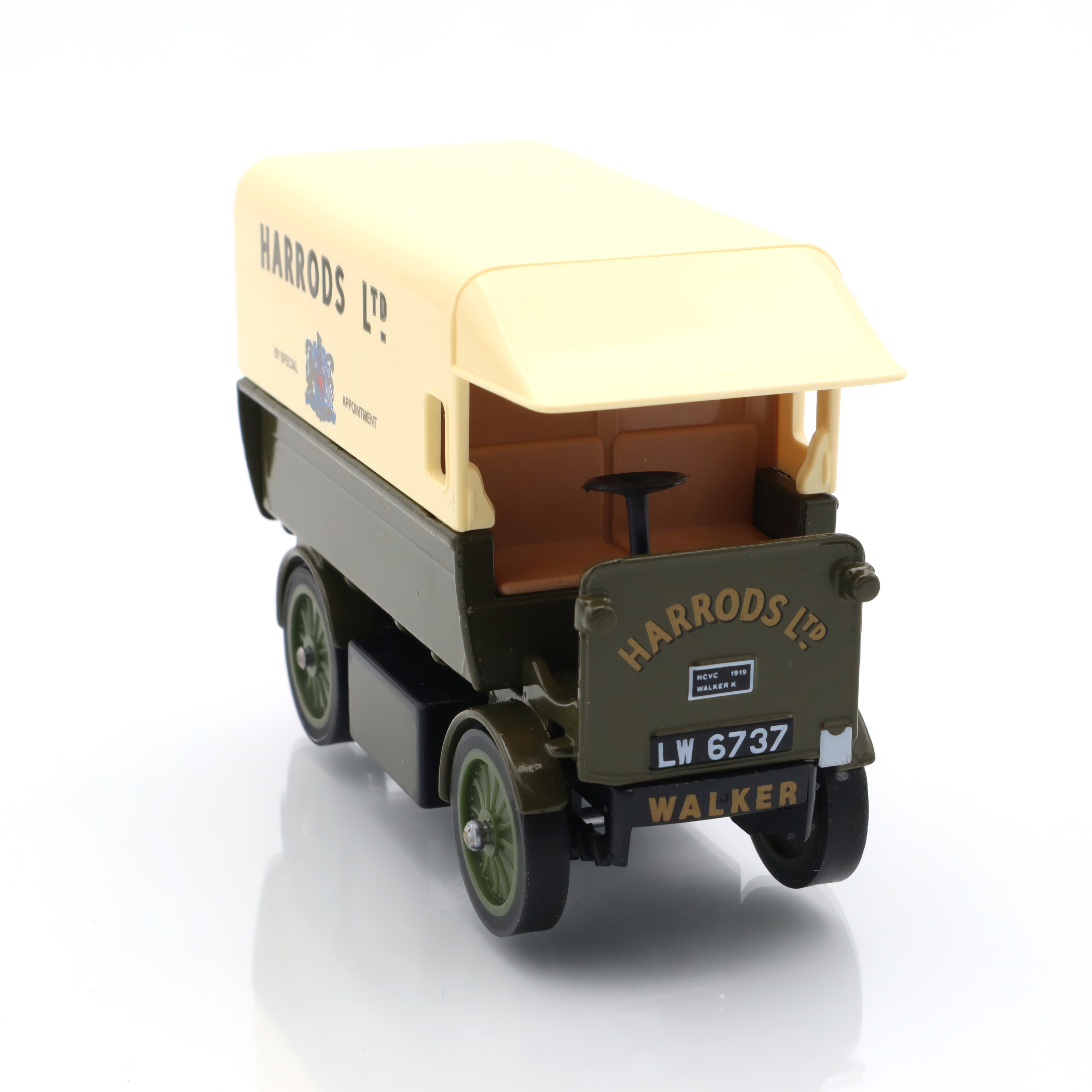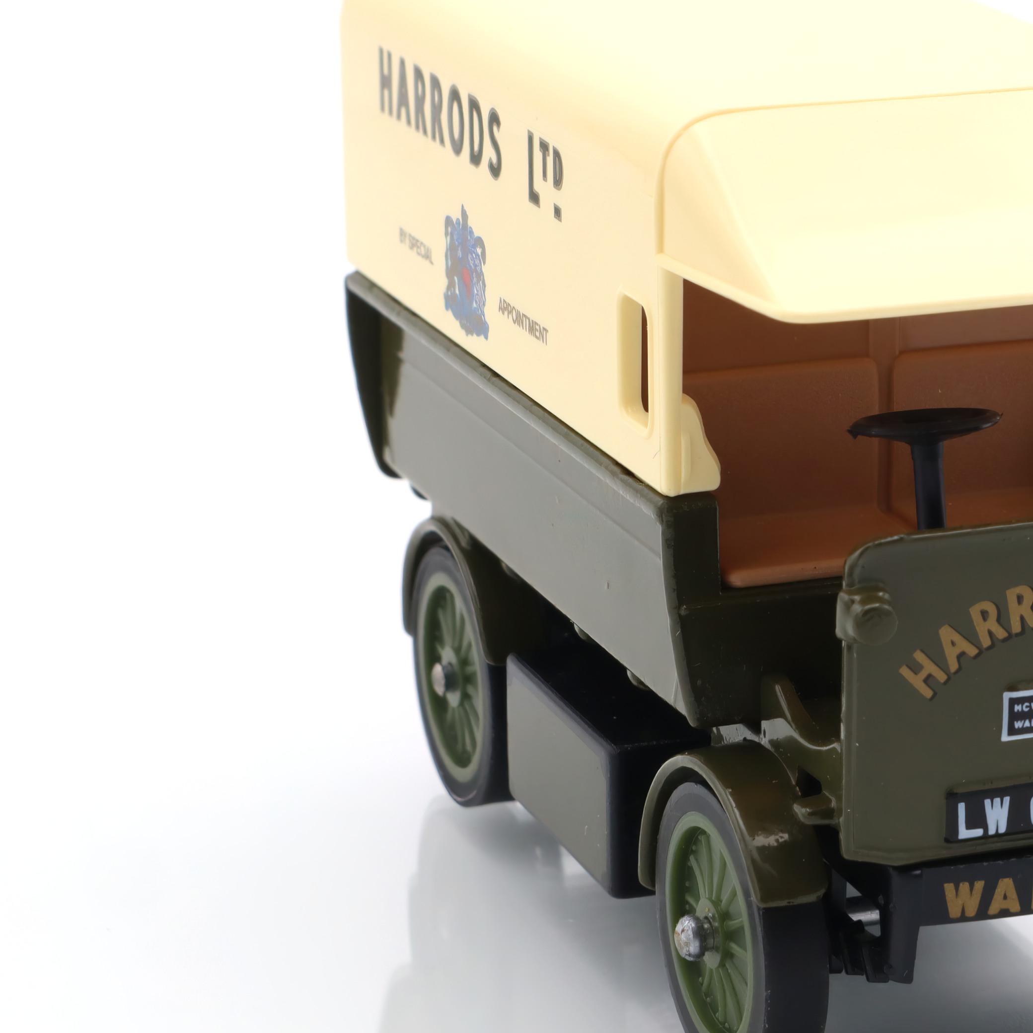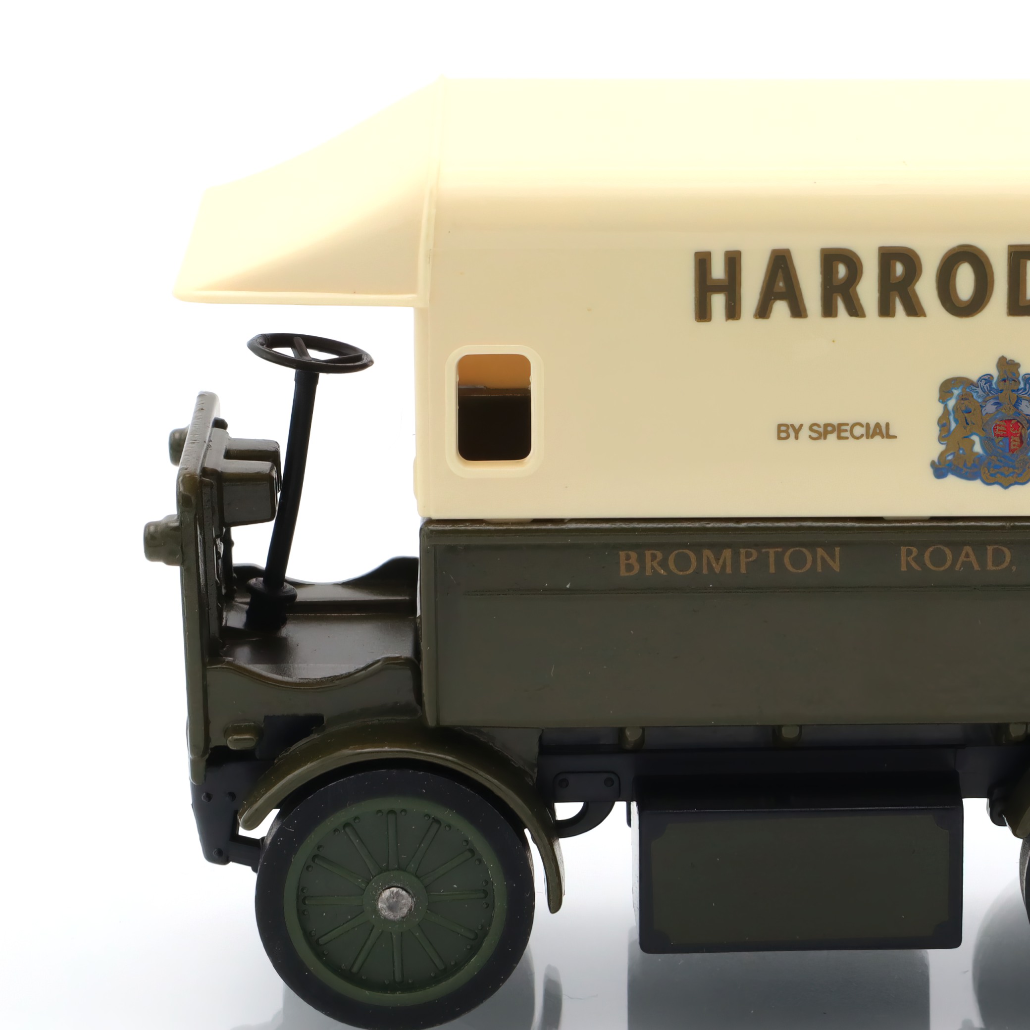 This particular model, with its Harrods branding, adds an extra layer of interest and nostalgia. Harrods, a landmark department store in London, symbolizes luxury and sophistication, and the use of their logo suggests an era when such electric vans might have been commonplace in their operations. Made several decades ago, this model isn’t just a plaything; it’s a slice of history linking to an era of burgeoning electric vehicle technology, long before it became mainstream.