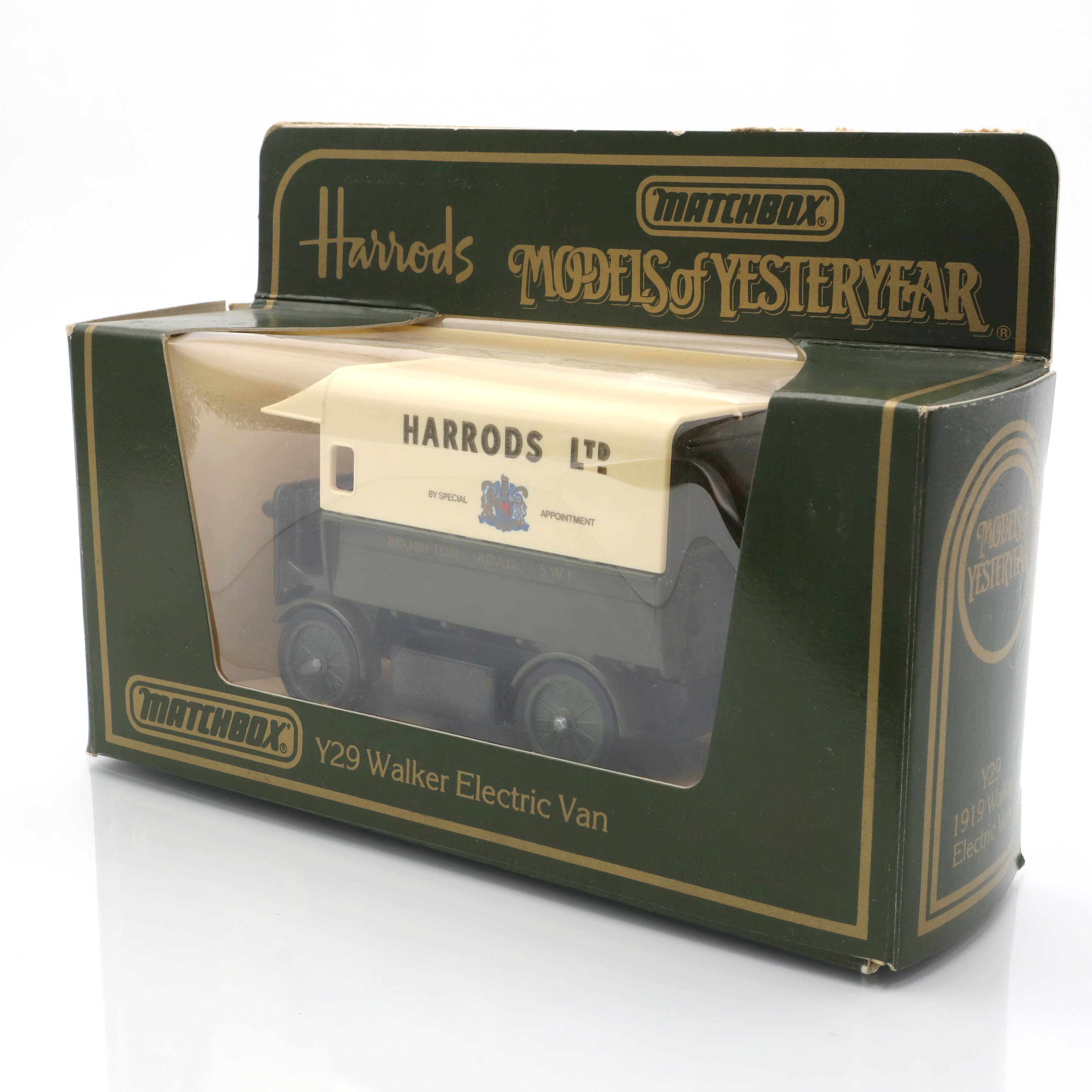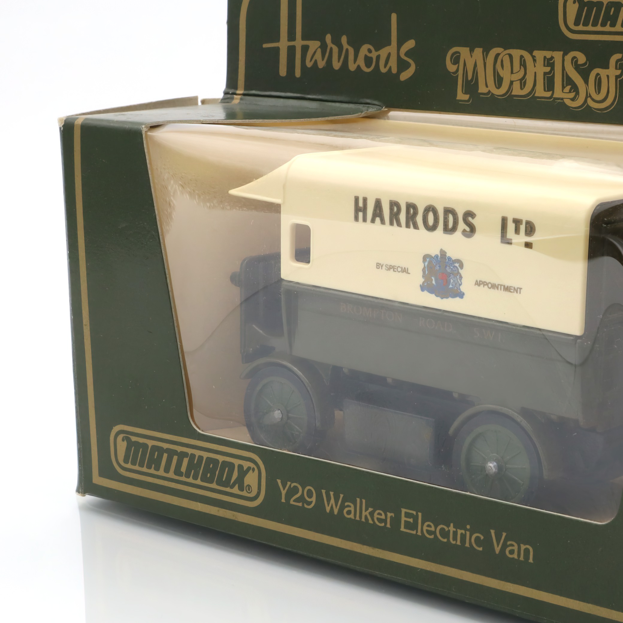 This Y-29 Walker Electric Van is a noteworthy find for collectors, especially those who appreciate the charm of vintage diecast models. It’s a miniature representation that reflects a bygone era when electric vans like this were beginning to revolutionize urban deliveries. Crafted with meticulous attention to detail, the toy vehicle showcases a classic design that includes a rich forest-green body contrasted by a cream upper part, with elegant “Harrods LTD” branding on the sides. The tiny wheels and carefully replicated features give it an authentic look. Being in mint condition makes this piece even more valuable, standing as a testament to its preservation over the years. Rare Matchbox editions like this are not just toys but pieces of history, cherished by those who love to collect and reminisce about the past.