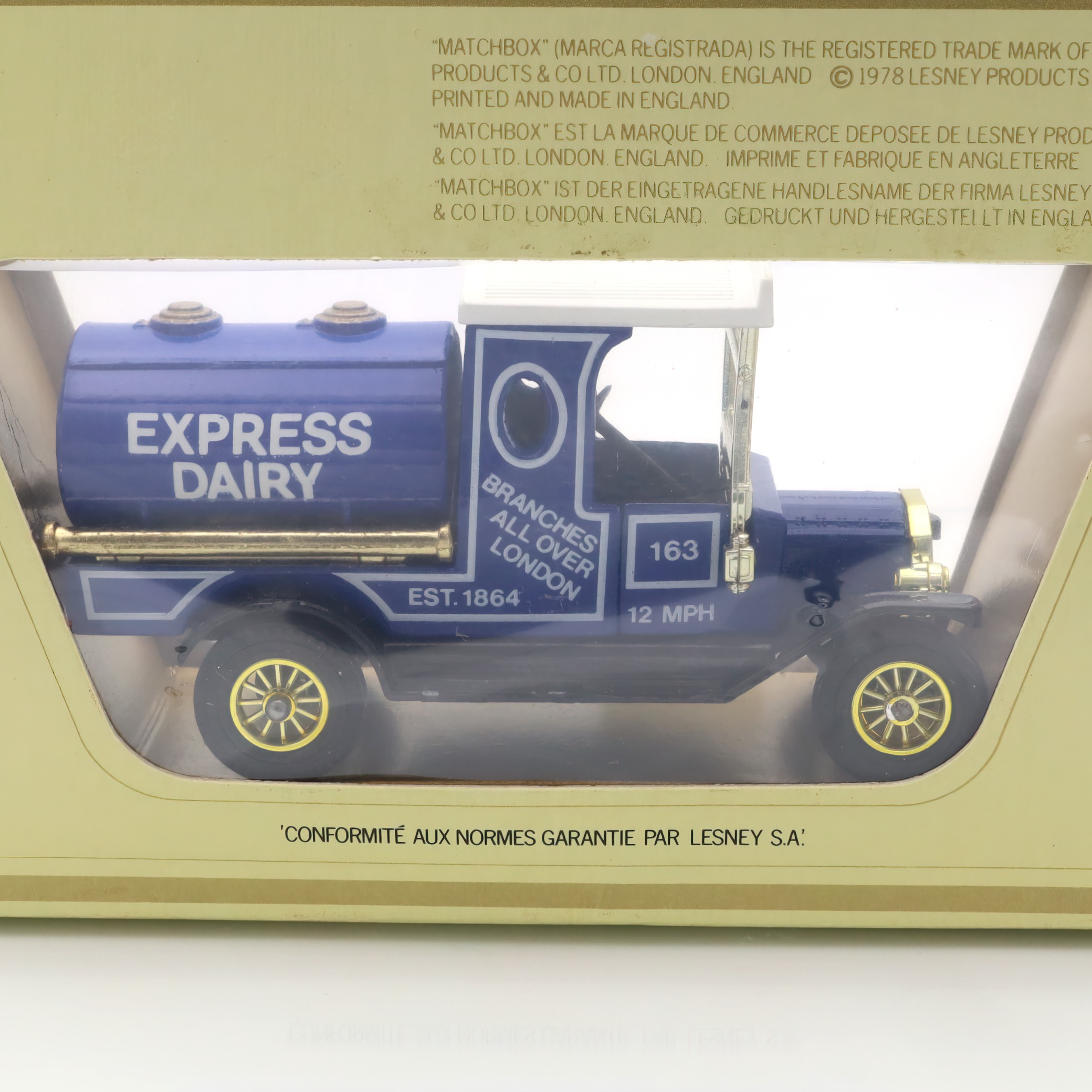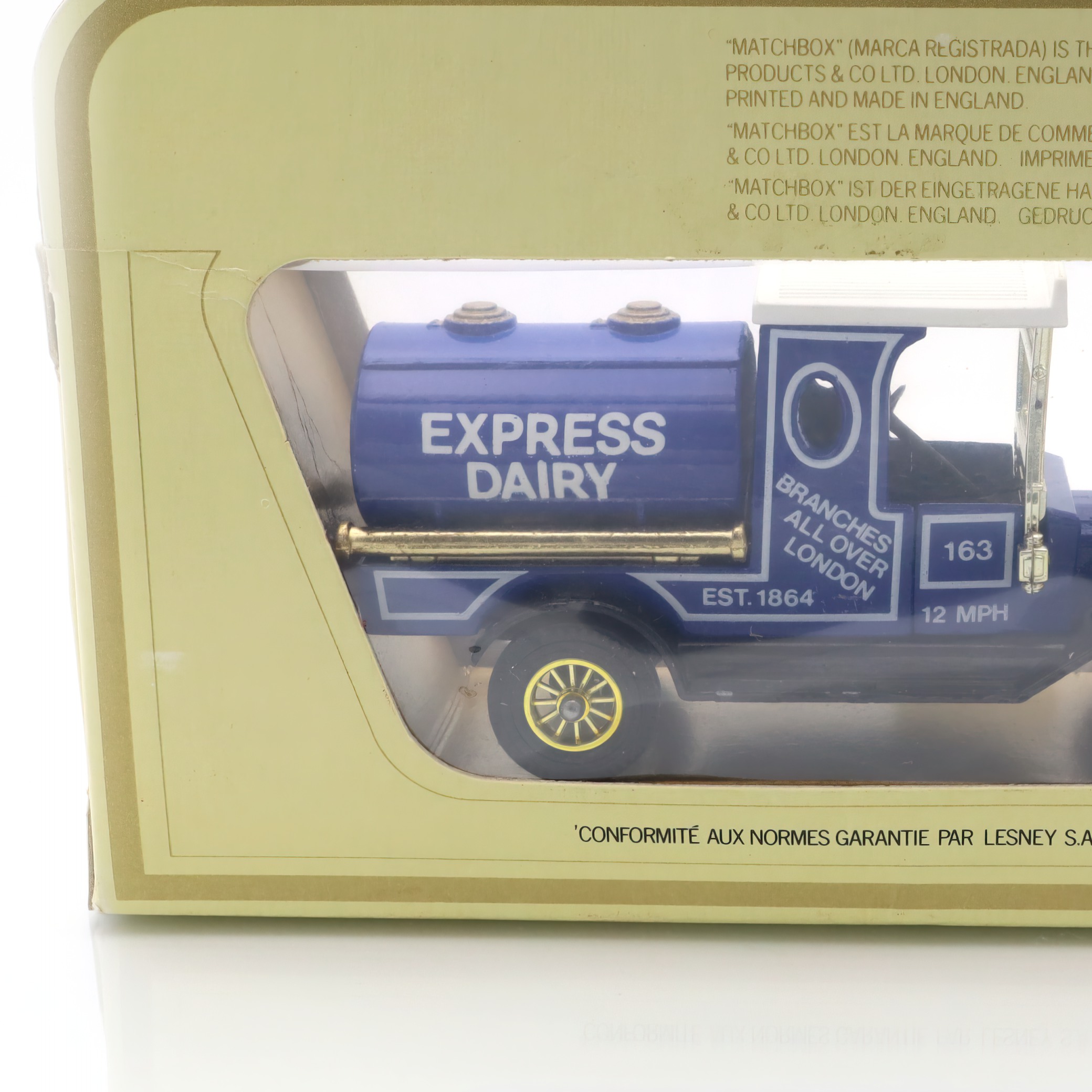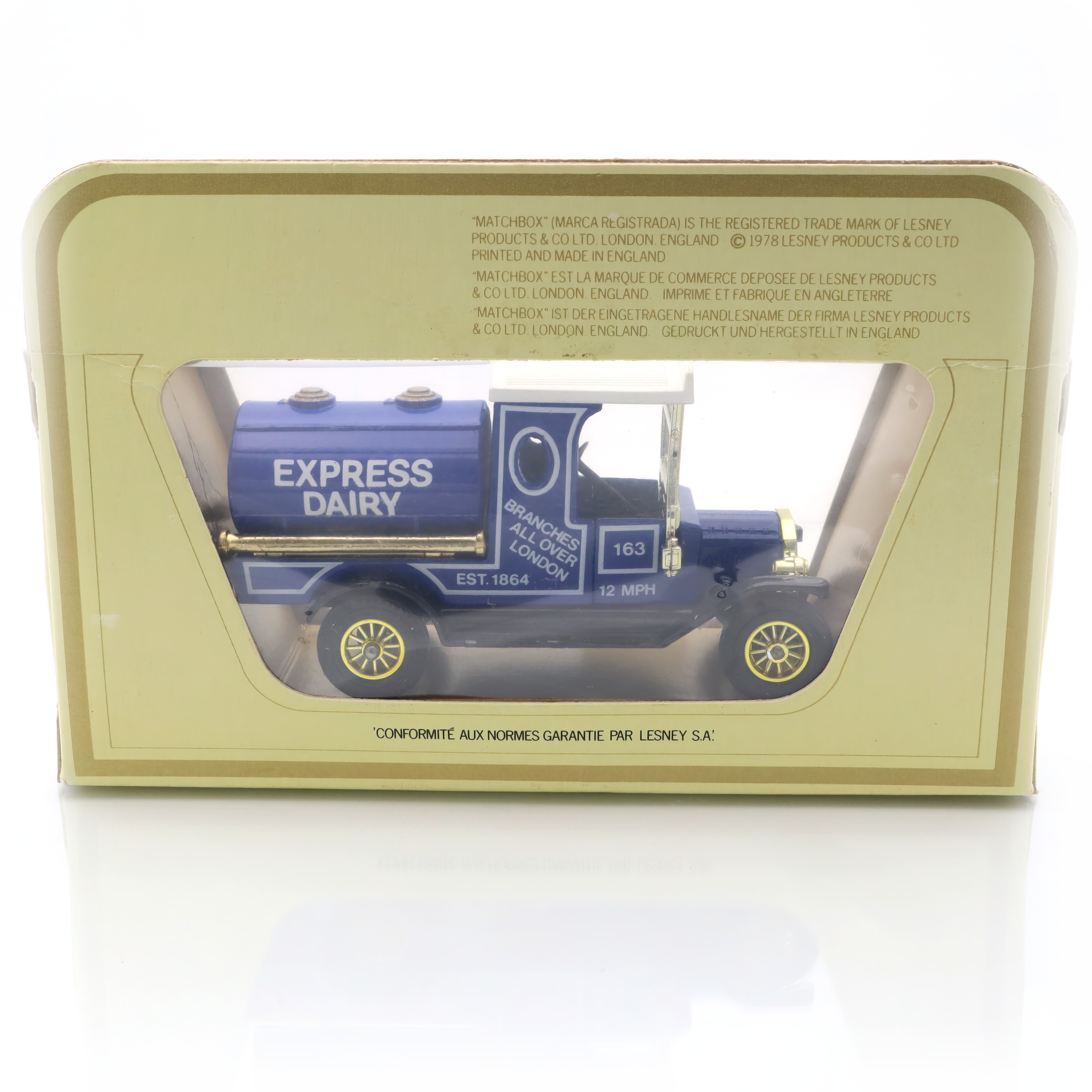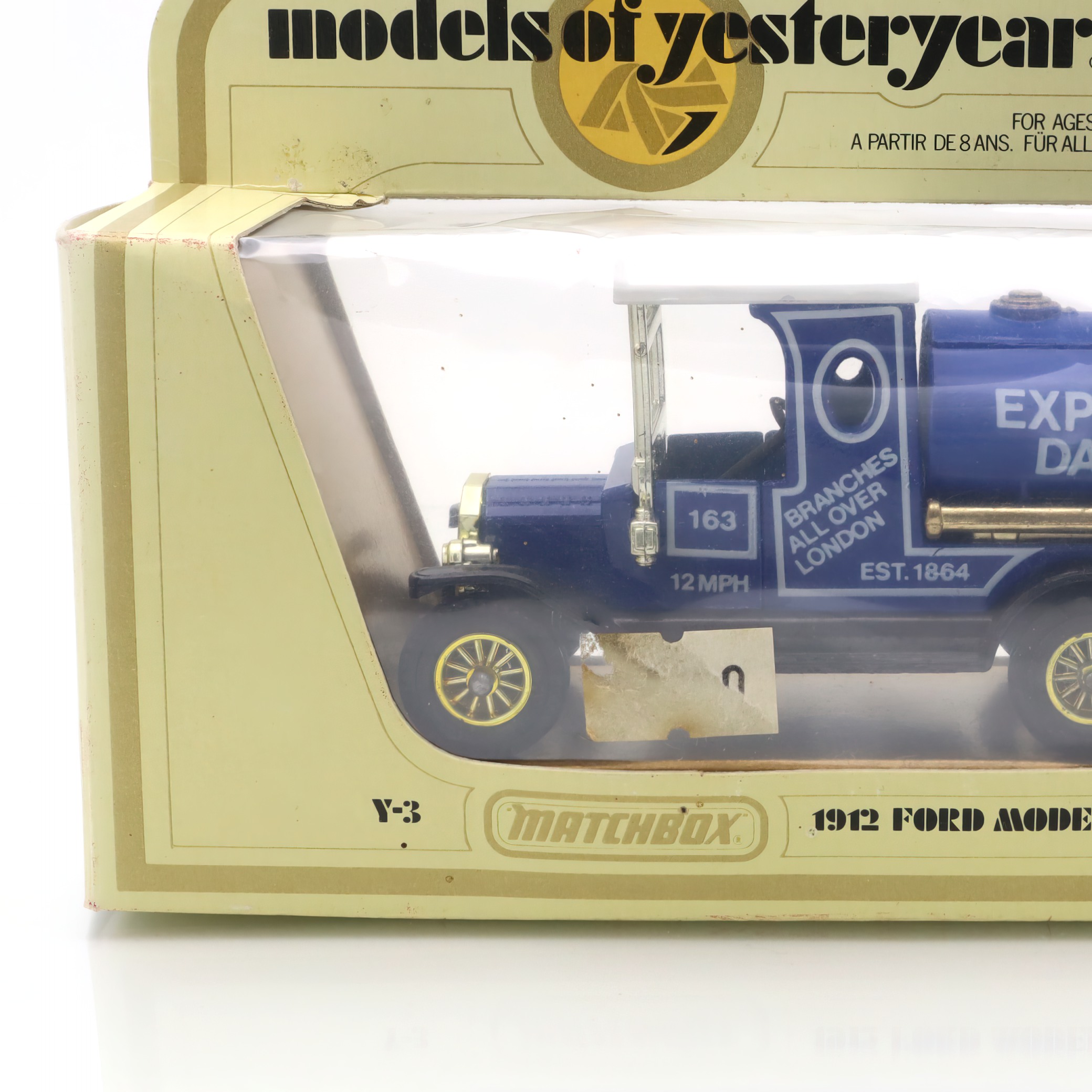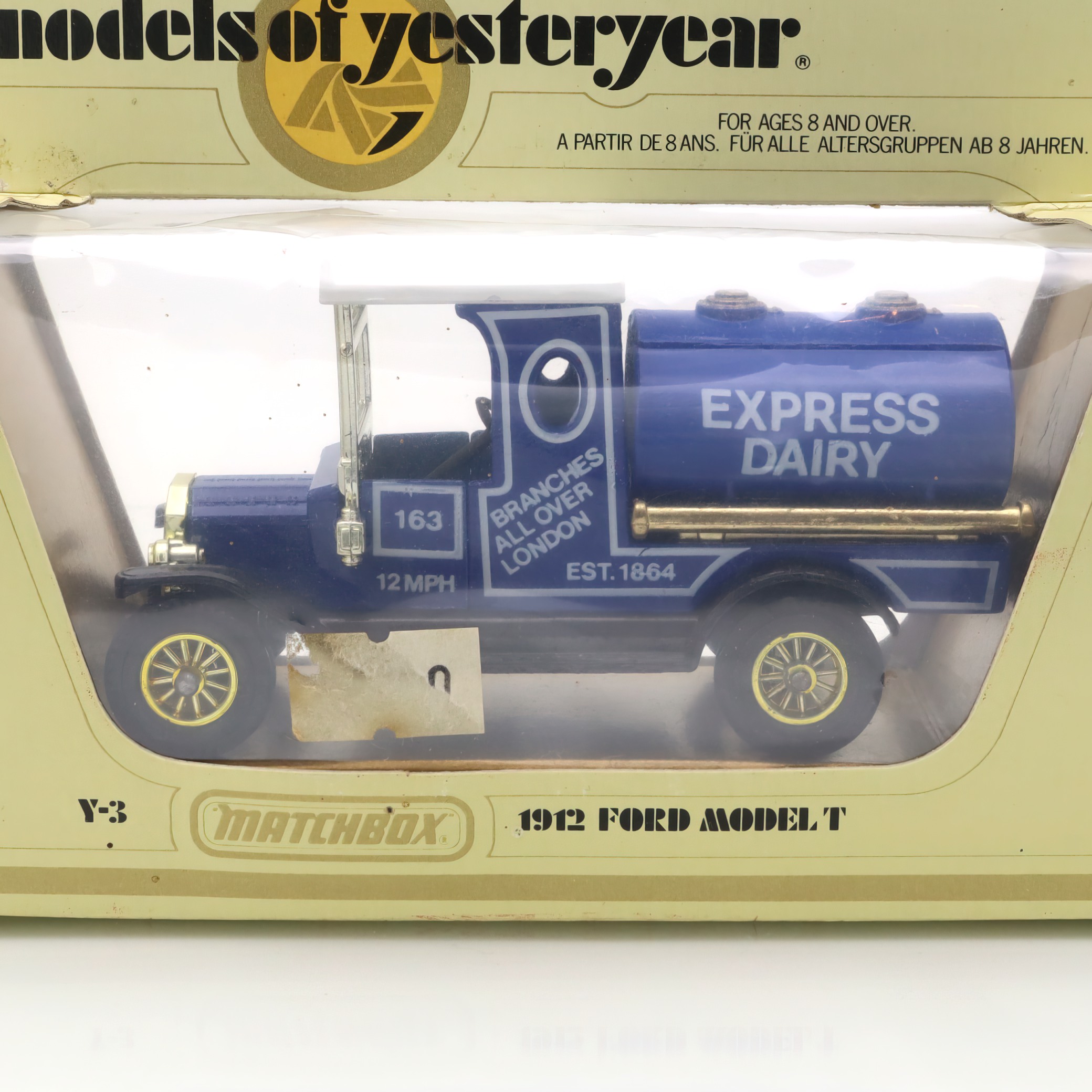 This charming artifact is a Y-3 1912 Ford Model T Tanker, a delightful piece of the Matchbox “Models of Yesteryear” collection. It’s a beautifully crafted diecast collectible, complete with a vibrant “Express Dairy” design that harks back to the early 20th century. Despite its age, this miniature model is in mint condition, having stood the test of time without a scratch. It’s perfect for those who have a fondness for classic toy vehicles or a penchant for historical replicas. With its detailed features and nostalgic aura, this model embodies the elegance and industrial spirit of the original Ford Model T, a vehicle that was a cornerstone in automotive history.