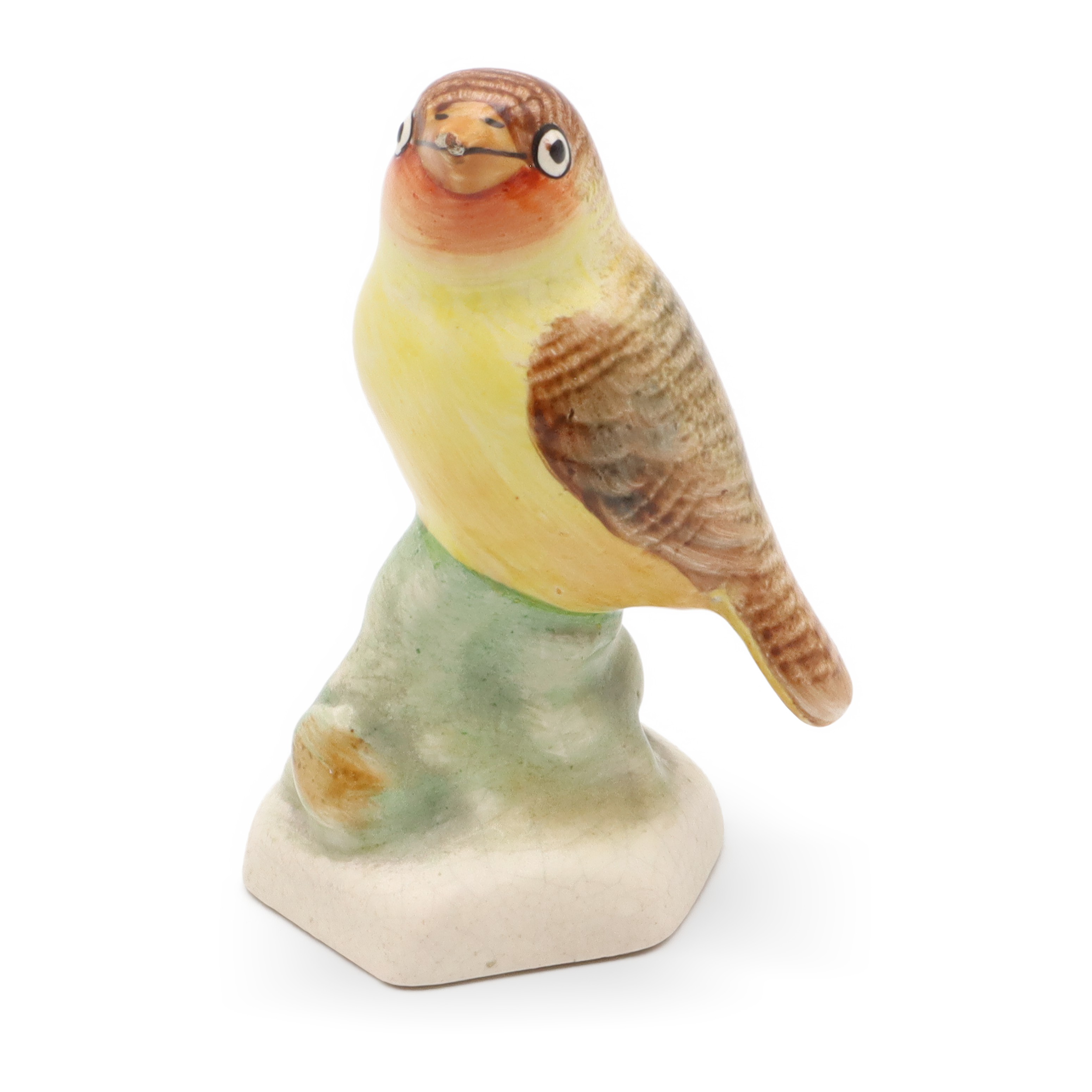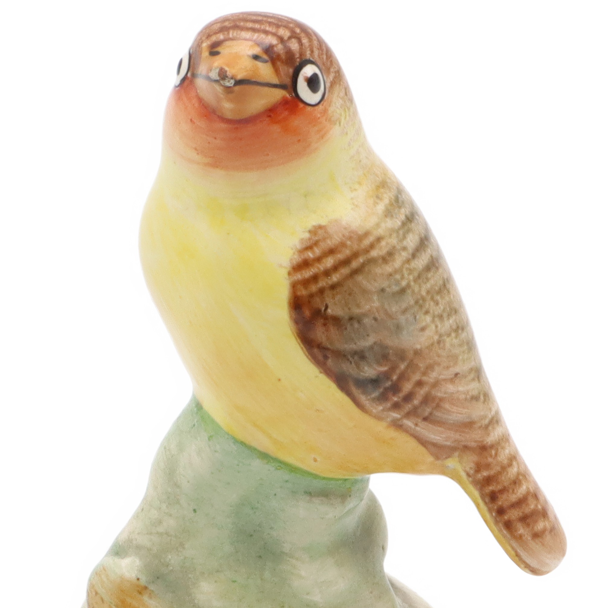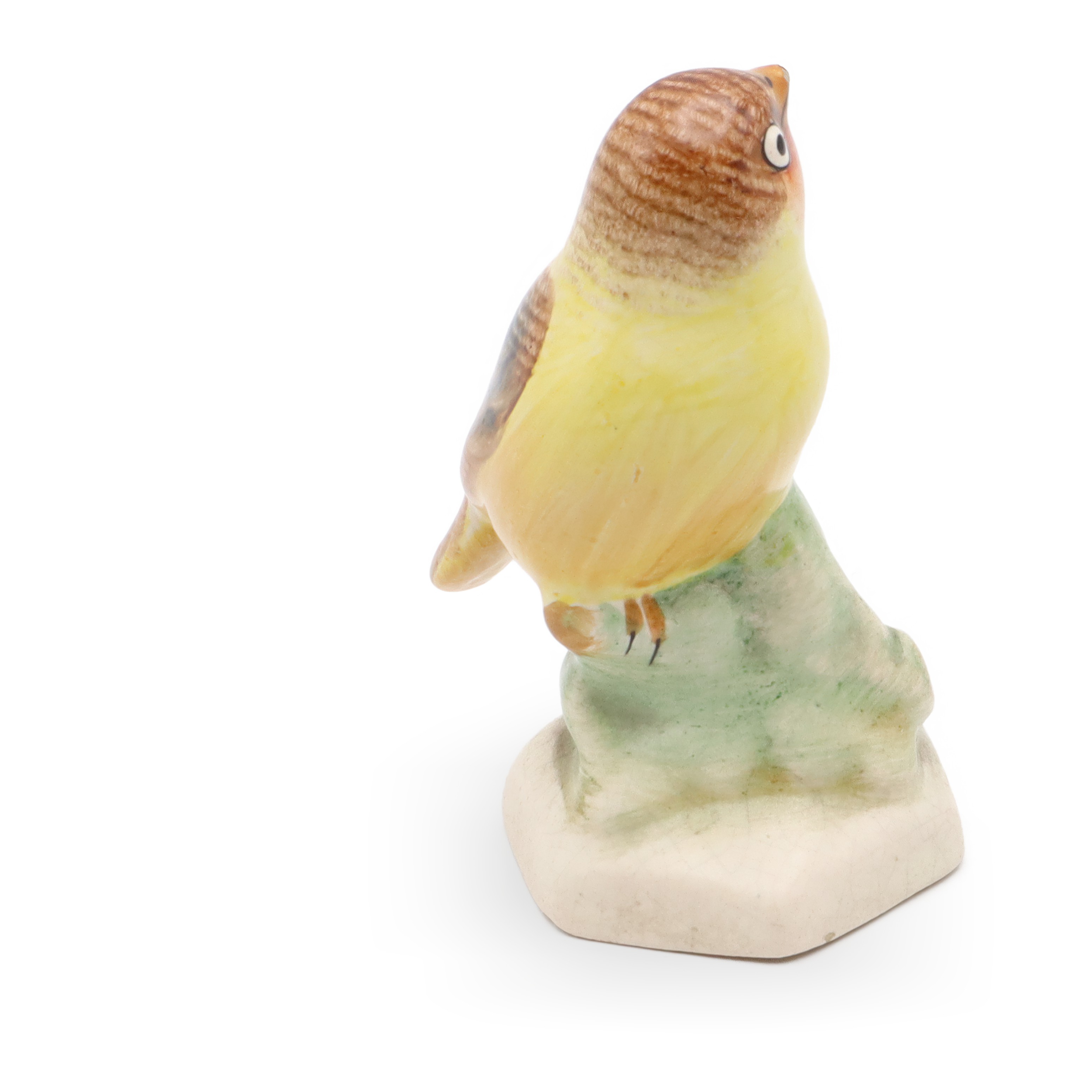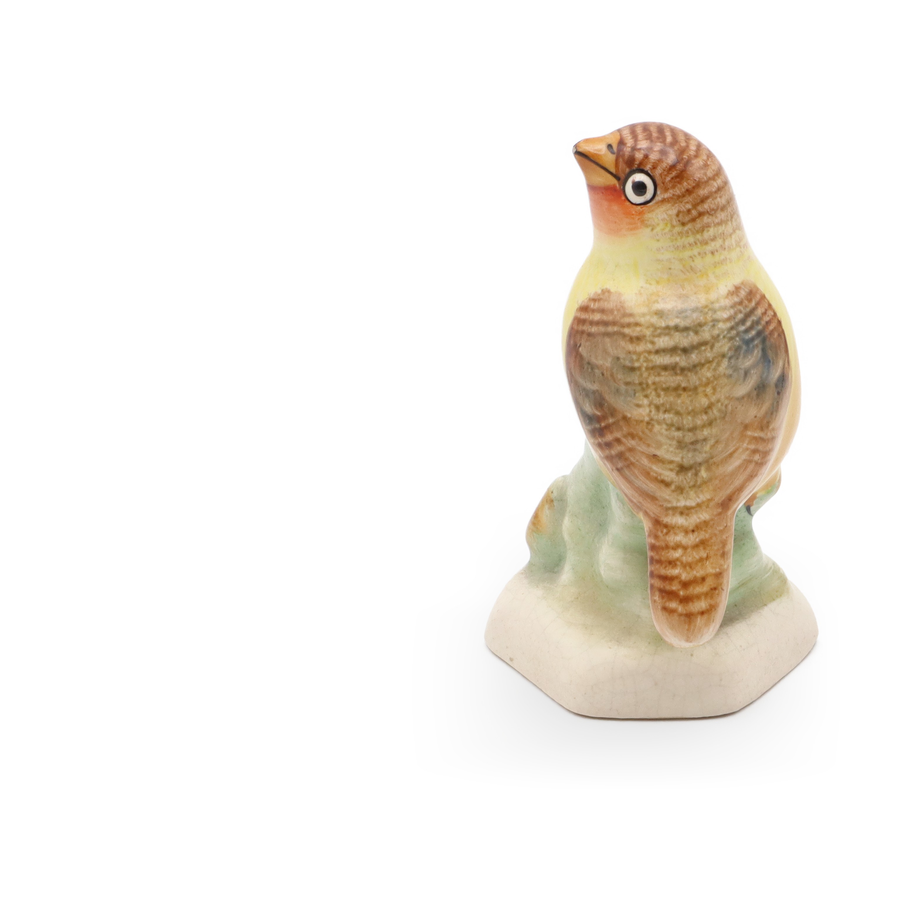 This charming little artifact is a Yellow Bird hand-painted porcelain figure, capturing a delightful snapshot of nature’s beauty in a quaint, collectible form. The figurine is vibrant with its yellow hue, accentuated by shades of brown and a hint of green at the base, making it look like it’s perched on a gentle mound. A tiny piece of art that fits snugly in the palm of your hand, it’s perfect for adding a touch of whimsy to any shelf or mantelpiece. Its condition appears to be well-preserved, showcasing the skillful use of colors and delicate detailing typical of hand-painted porcelain pieces. Such figurines often carry an inviting warmth and nostalgia, turning a simple decorative object into a heartfelt symbol of craftsmanship and nature appreciation.